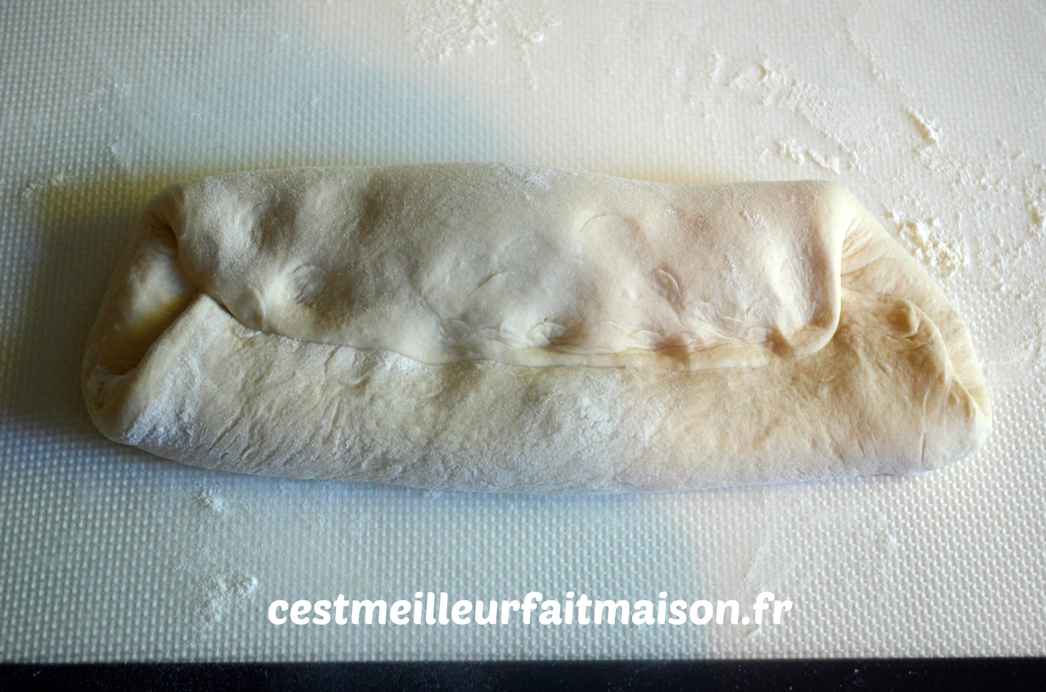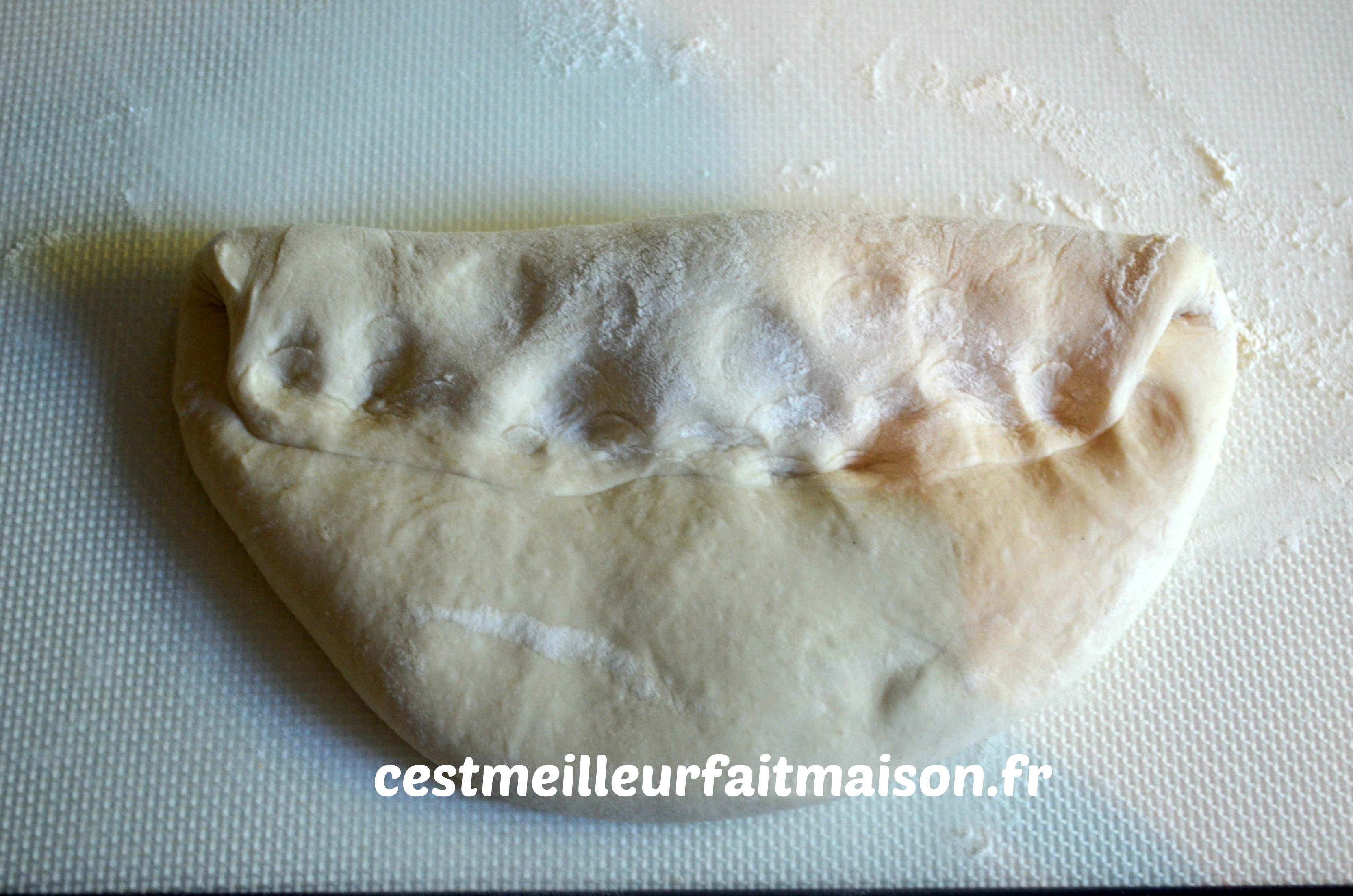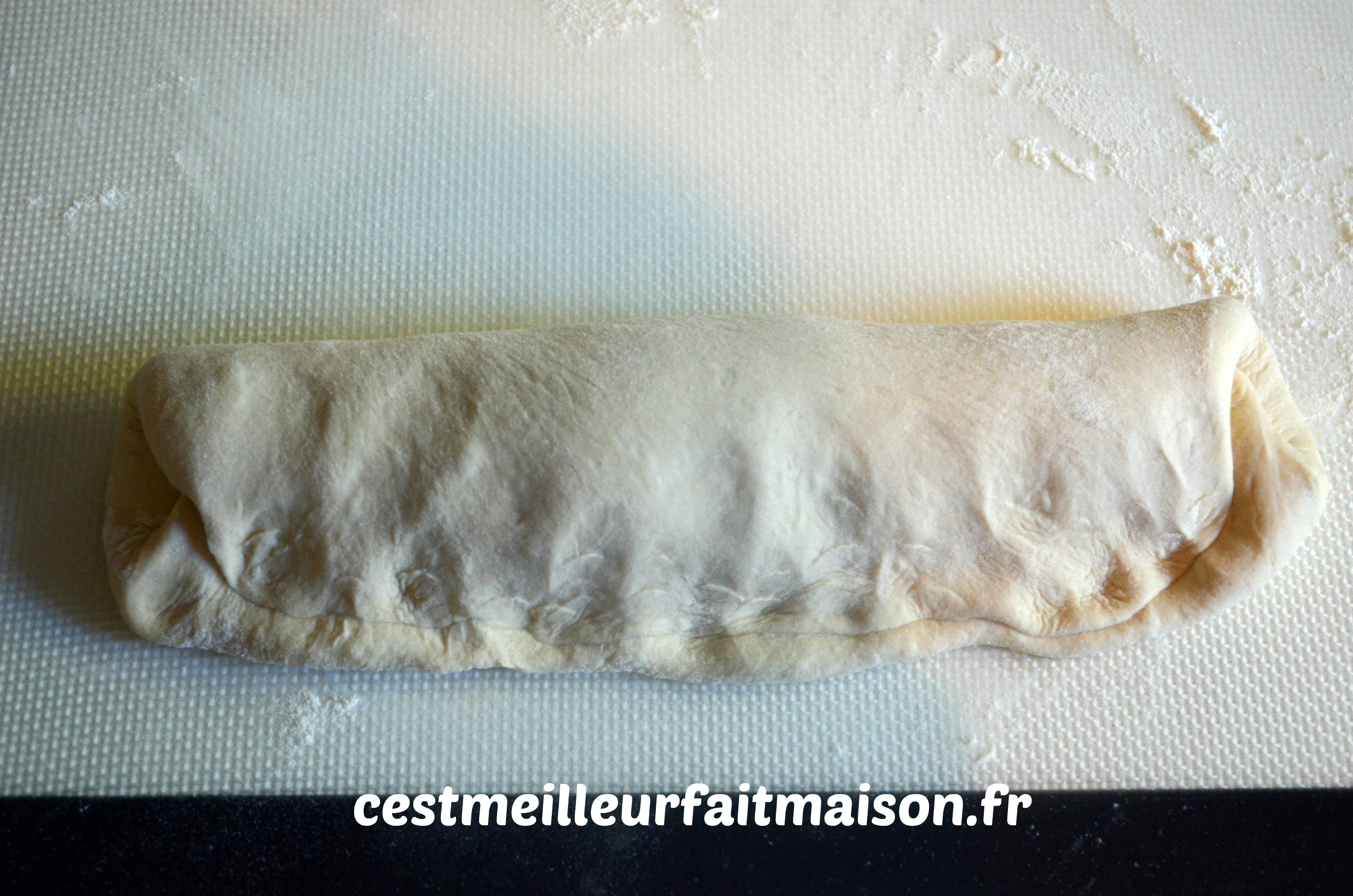 Tourner le pâton de 180° et replier d’un peu plus d’un tiers. Presser avec les doigts.