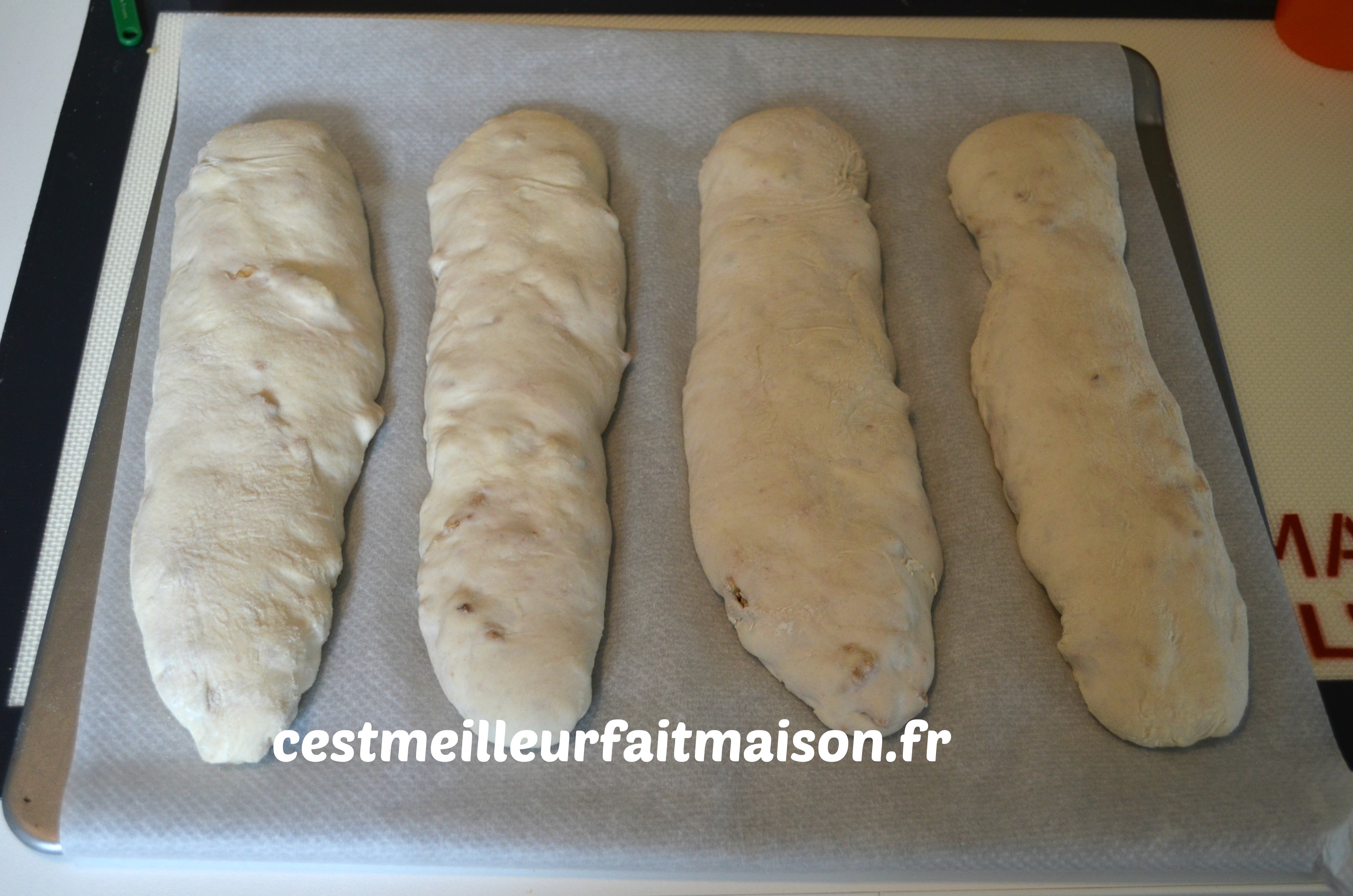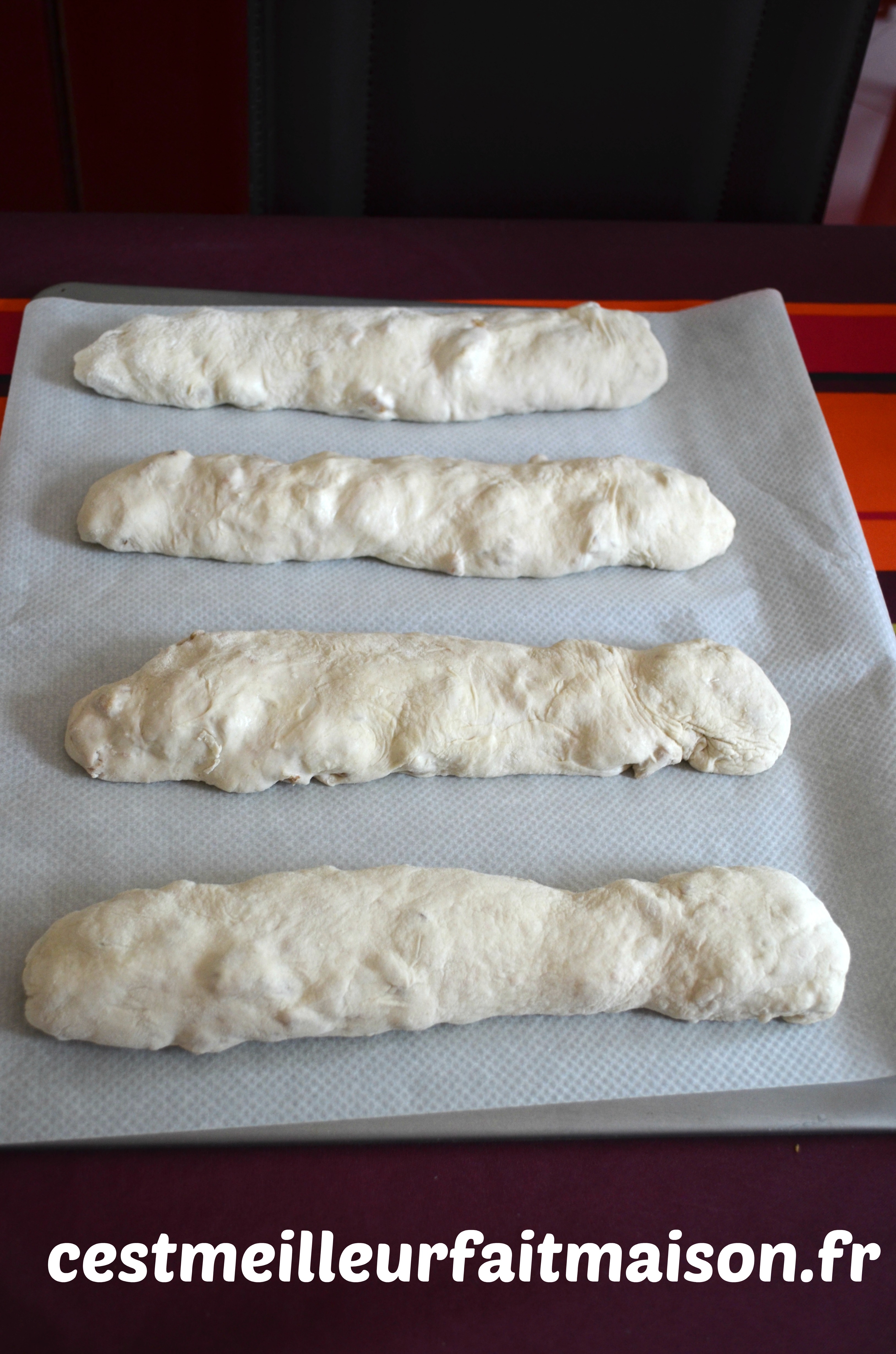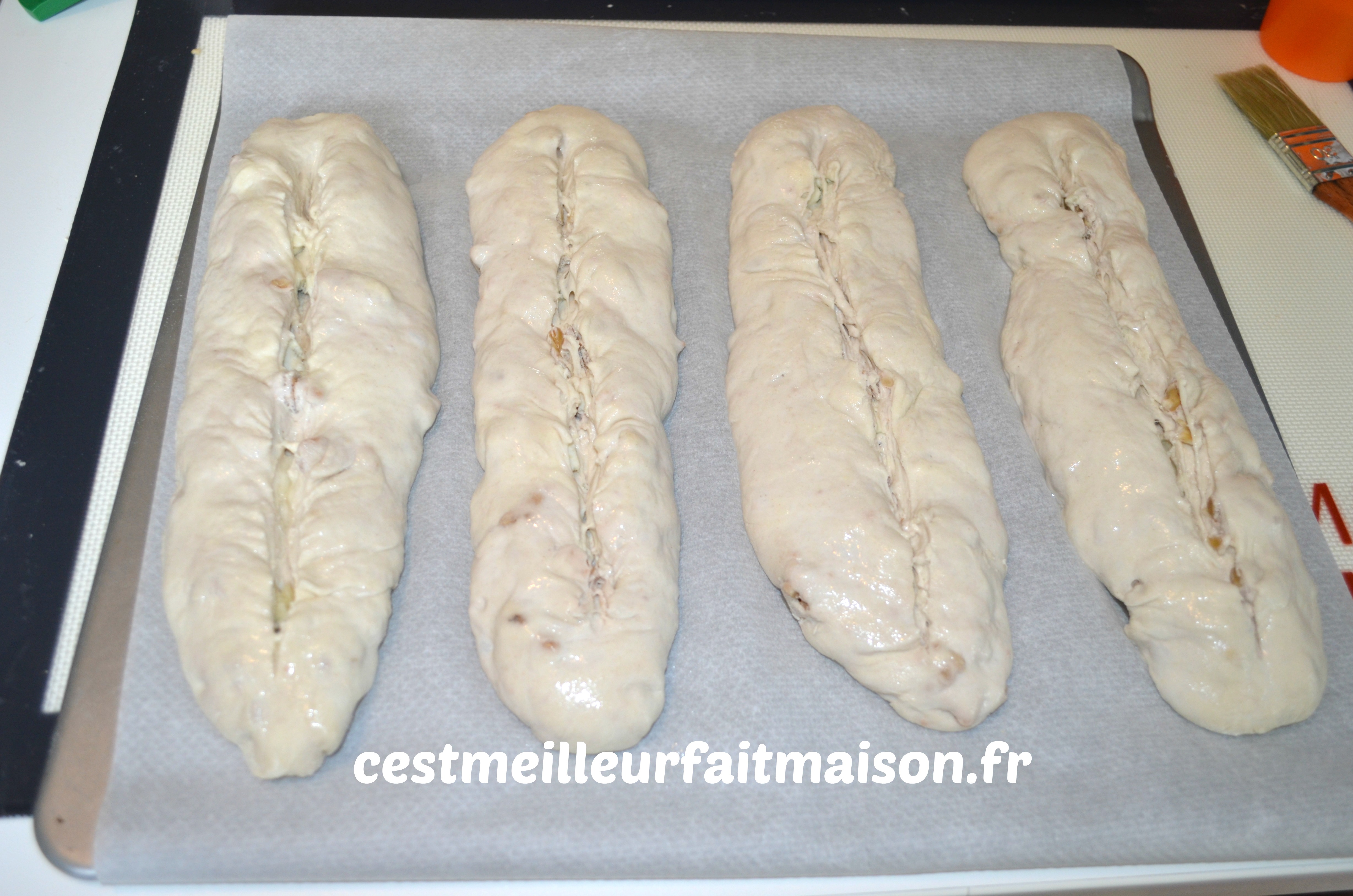 6- Préchauffer le four à 250°C. Donner un coup de lame au milieu sur la longueur des pâtons. Humecter à l’aide d’un pinceau ou d’un vaporisateur d’eau. Enfourner pour 15 à 18 min à surveiller.