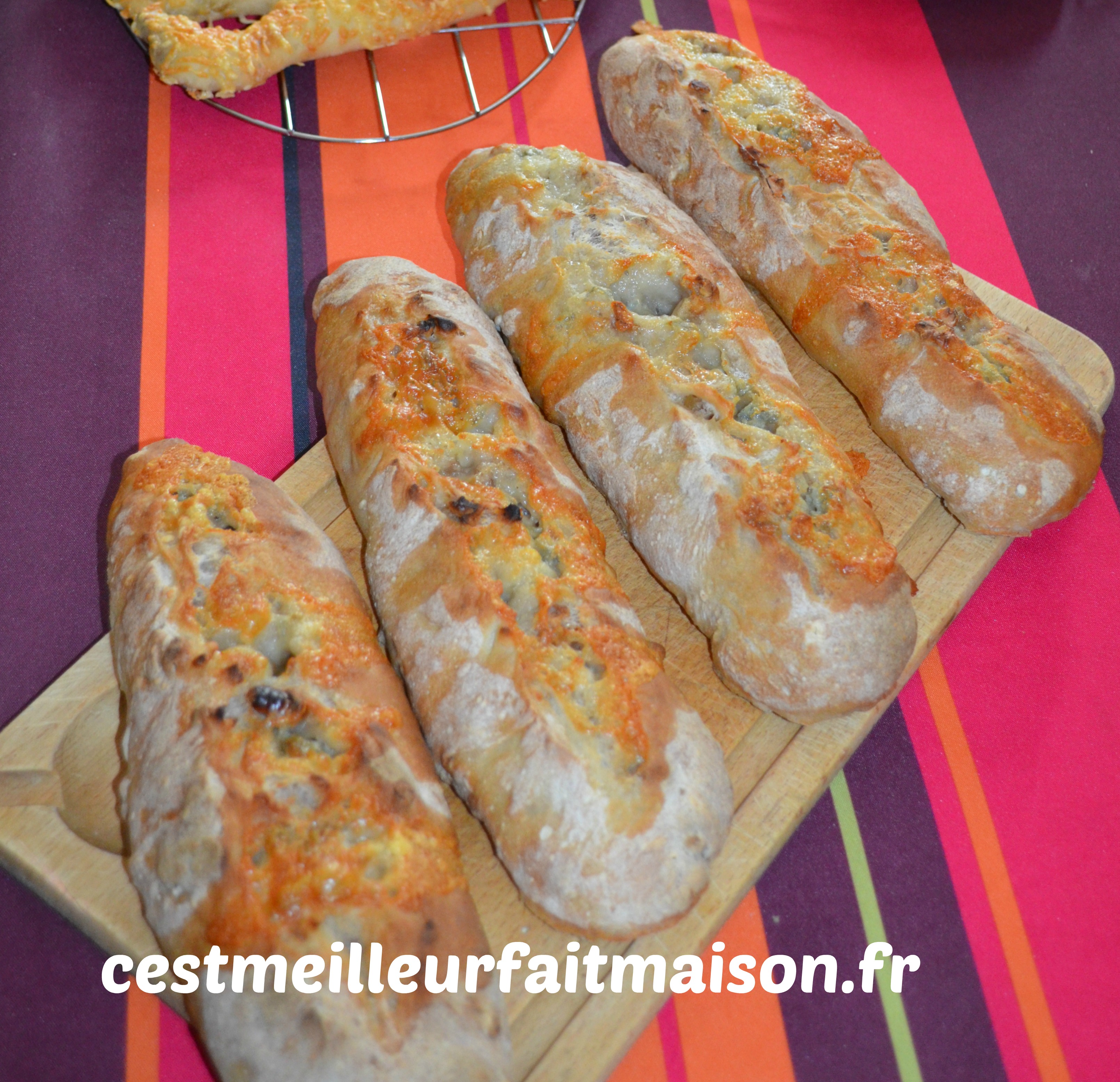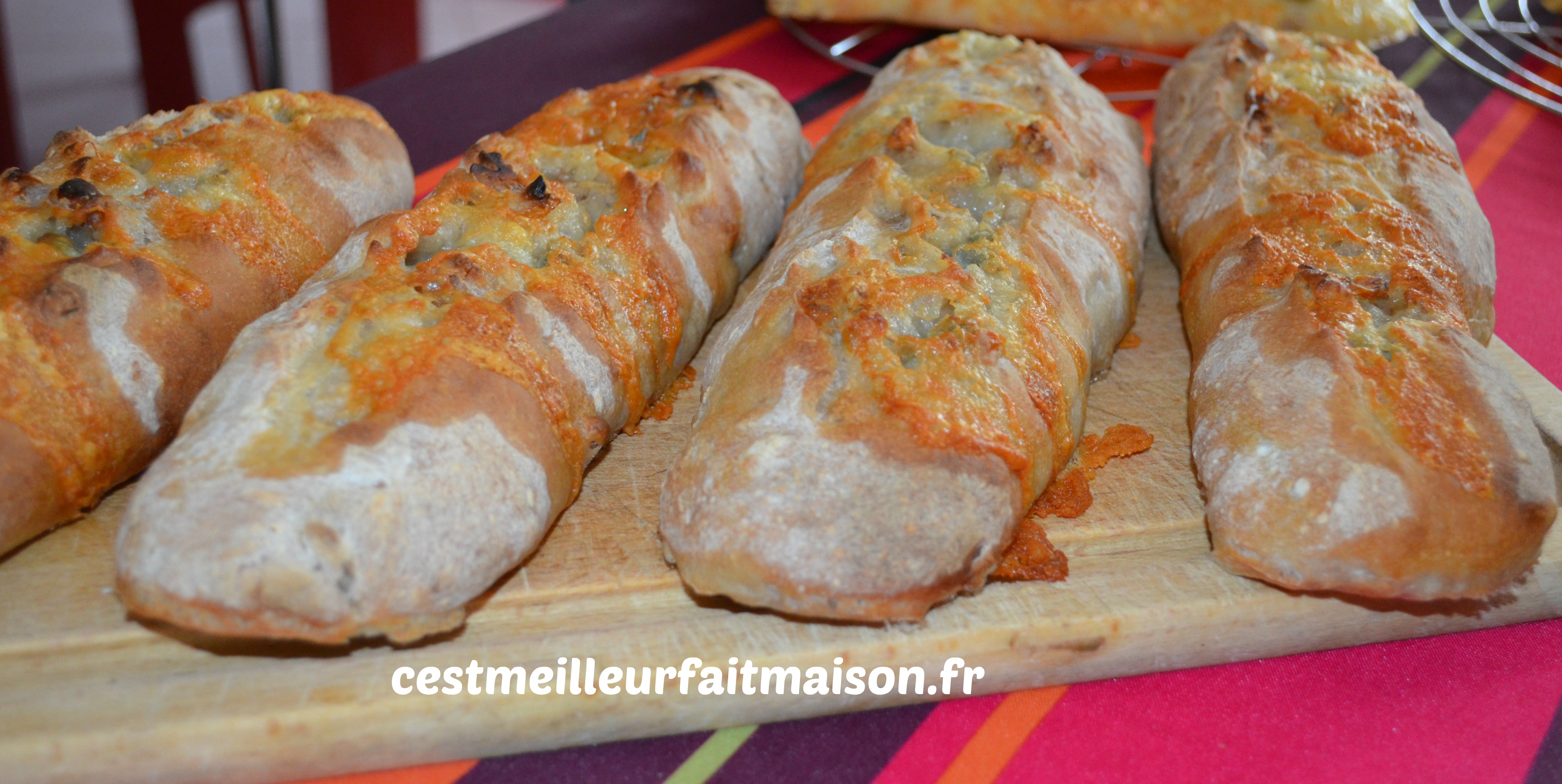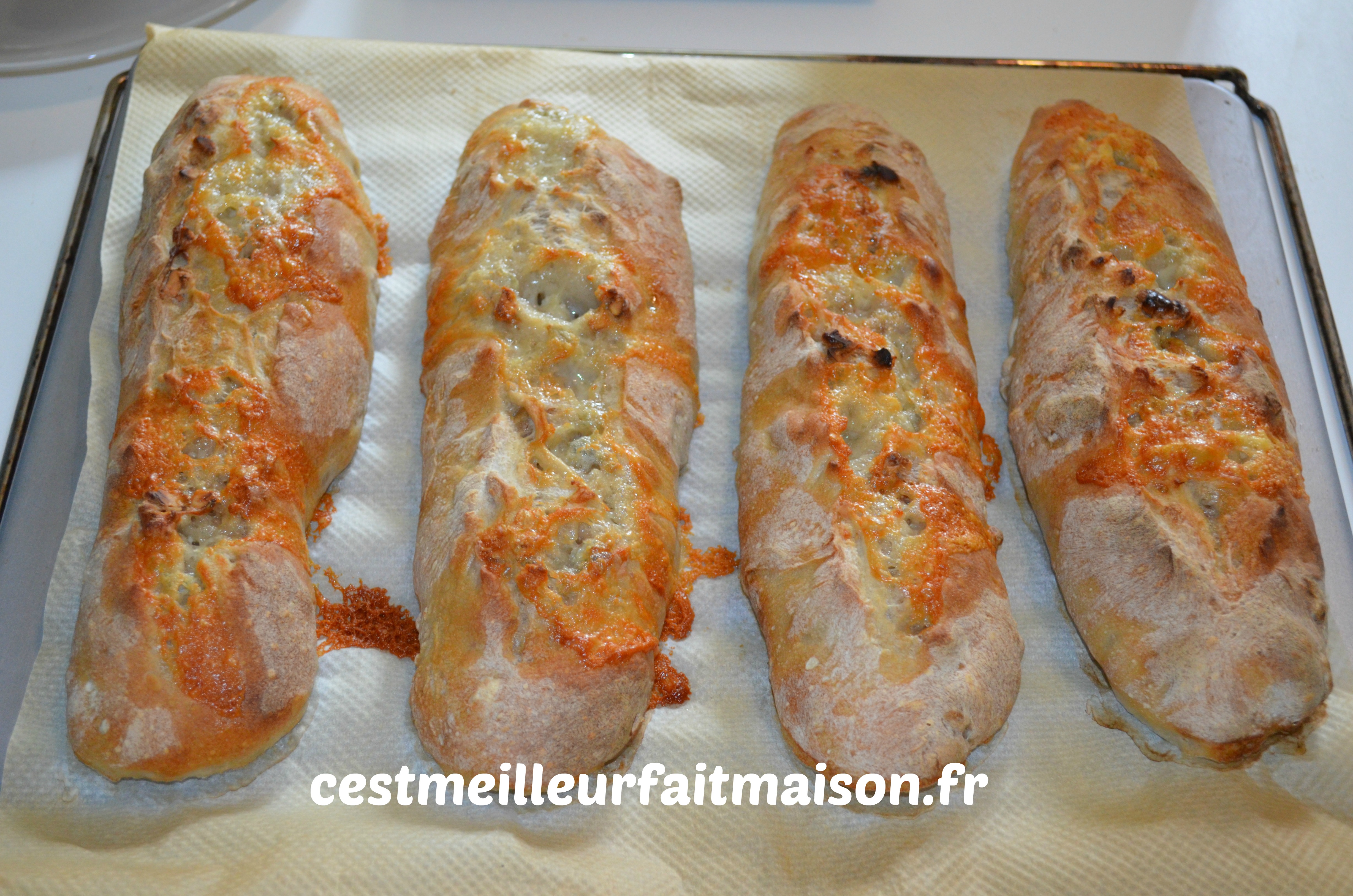 6- Préchauffer le four à 250°C. Donner un coup de lame au milieu sur la longueur des pâtons. Humecter à l’aide d’un pinceau ou d’un vaporisateur d’eau. Enfourner pour 15 à 18 min à surveiller.