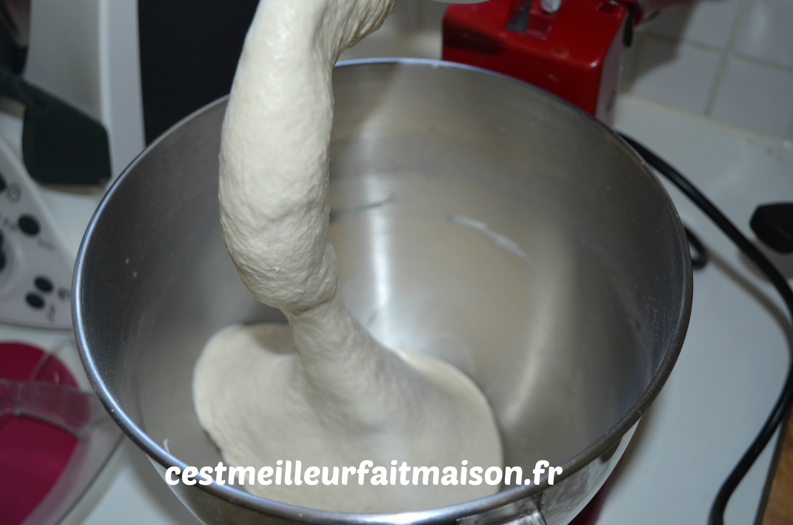 2- Recouvrir le bol d’un film alimentaire et laisser reposer 1h30 min. A mi-parcours, rabattre la pâte (la plier en deux). En fin de pousse, elle aura pris du volume.