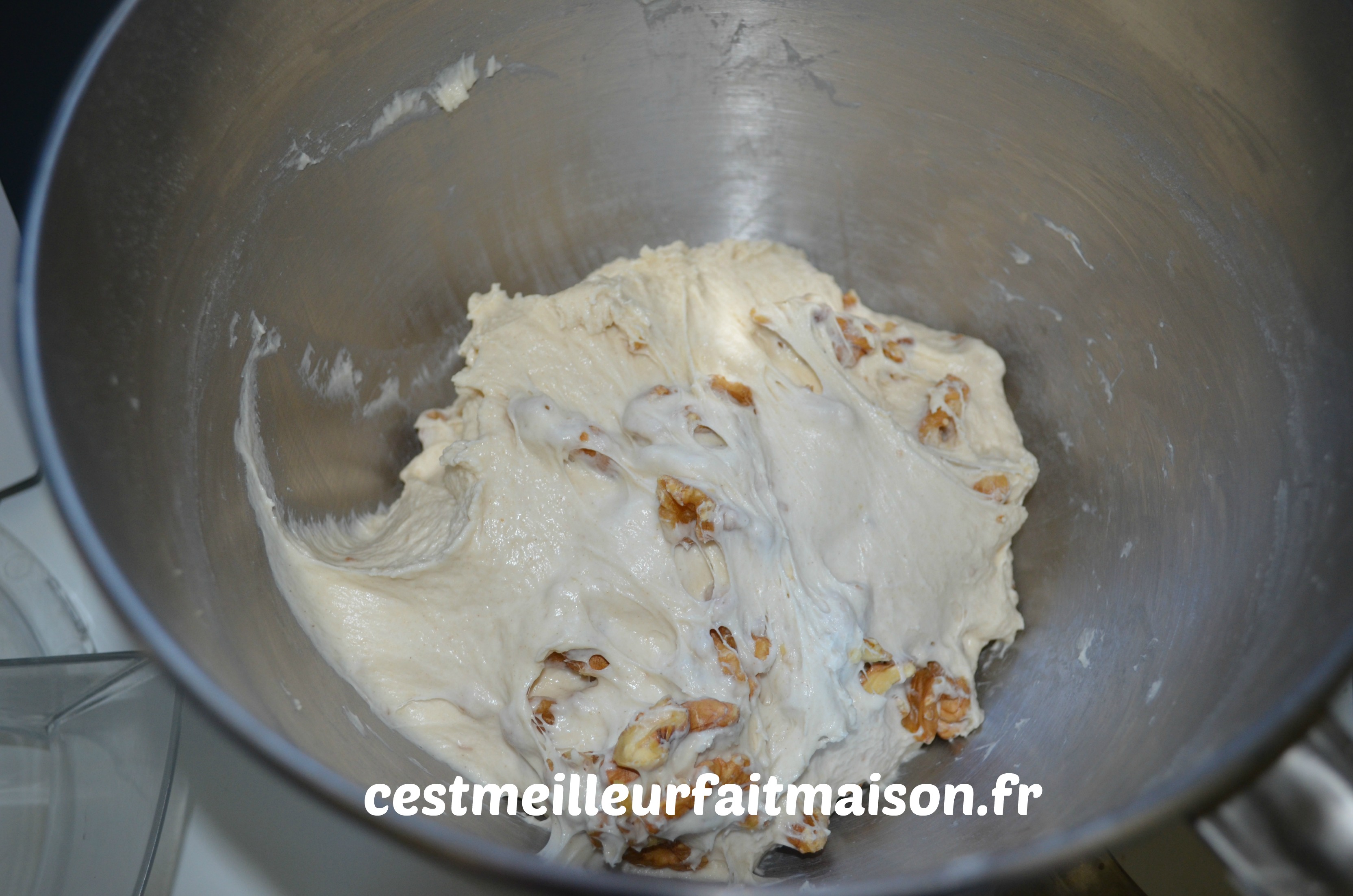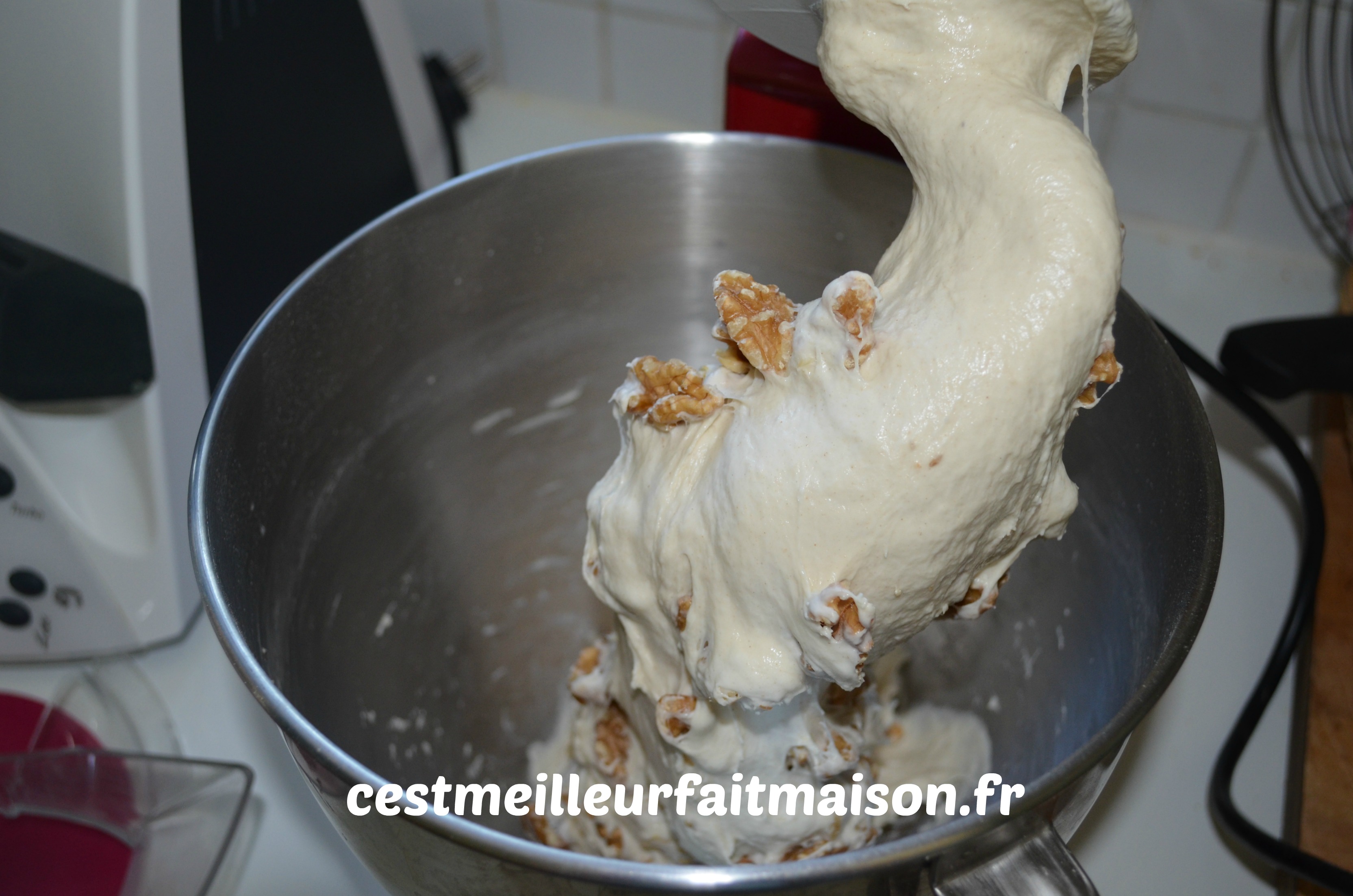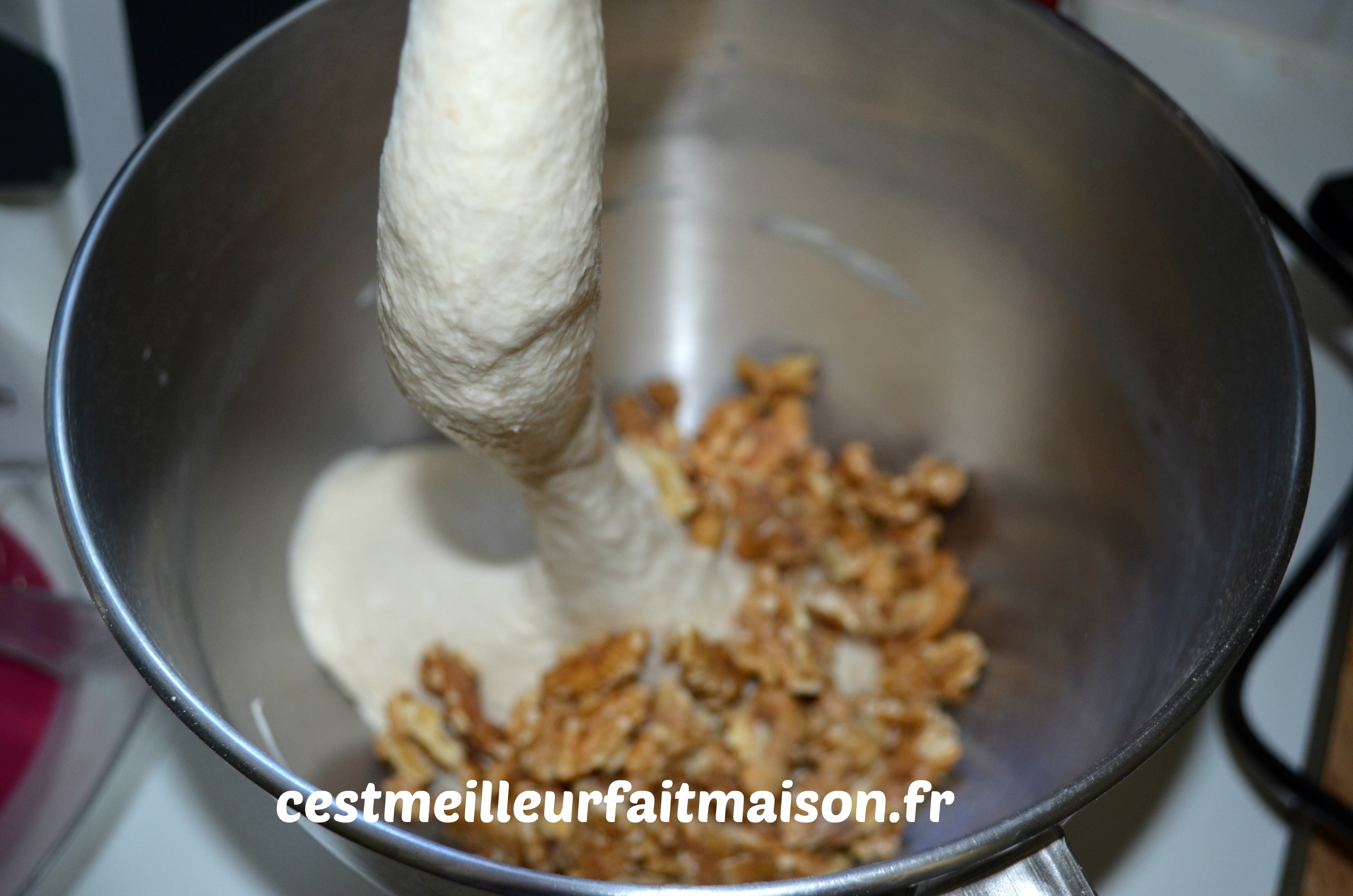 1- Mettre dans le bol du robot la farine, la levure, le levain liquide, le sel et l’eau. Pétrir 5 min à vitesse lente et 10 min à vitesse rapide (vitesse 1 et 2 pour le Kitchenaid). 30 sec avant la fin du petrissage, ajouter les noix.