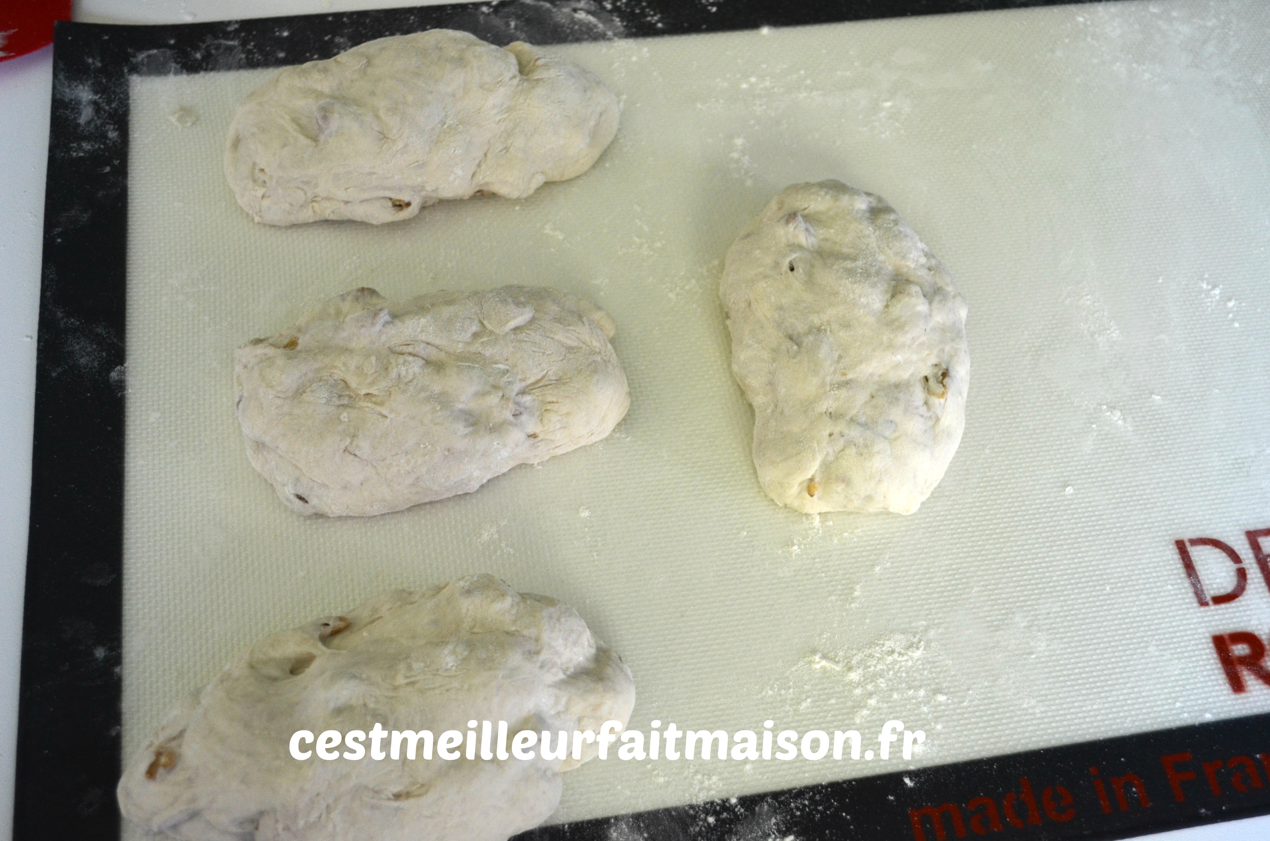 5- Placer les pâtons sur une plaque de cuisson recouverte de papier sulfurisé, soudure en dessous. Couvrir d’un torchon et laisser pousser 1 heure.