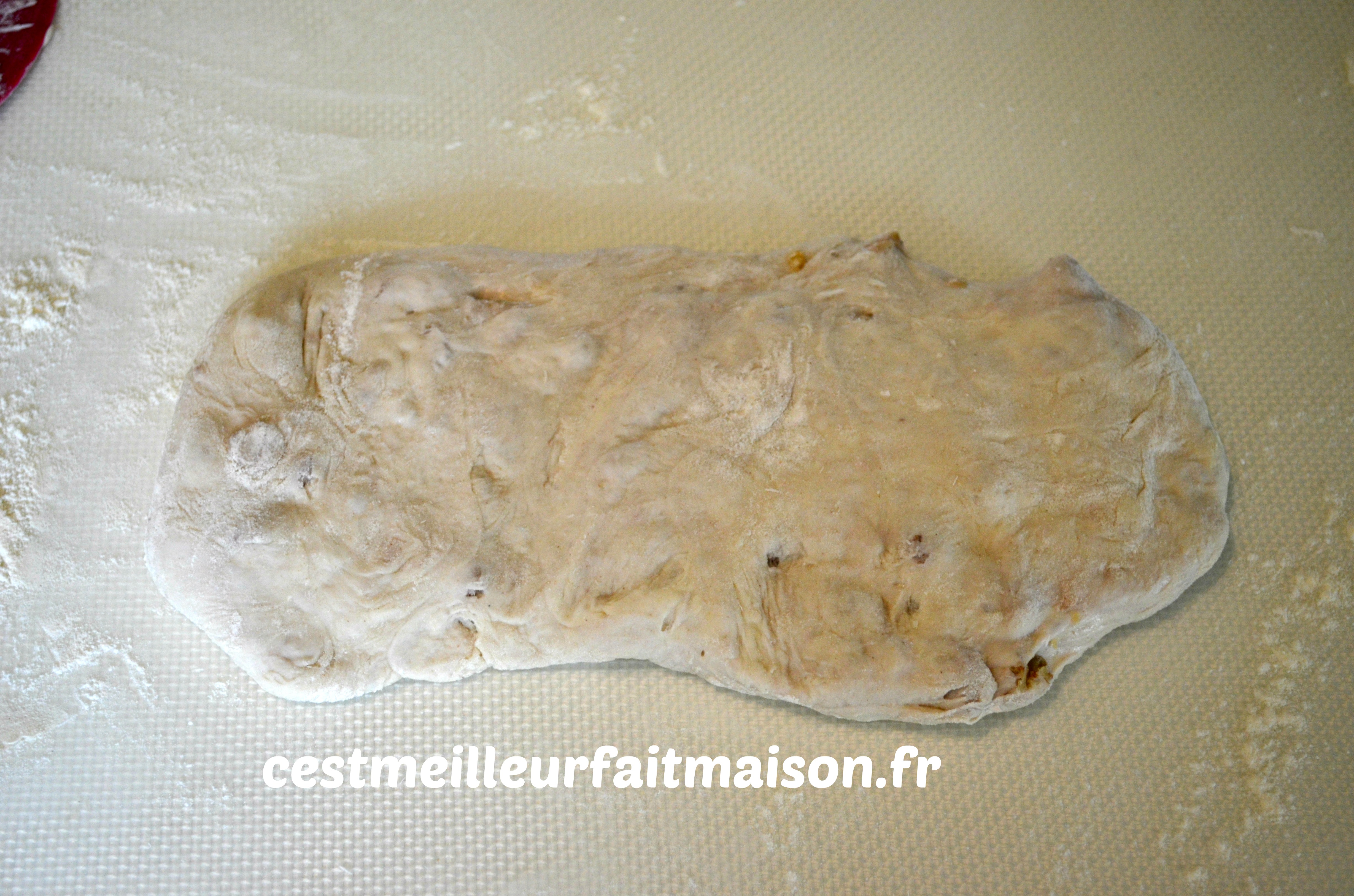 3- Fariner un plan de travail et diviser la pâte en 4 (250 g environ par pâton). Les rouler sur eux-même pour leur donner une forme allongée. Les recouvrir d’un linge et les laisser reposer 15 min.