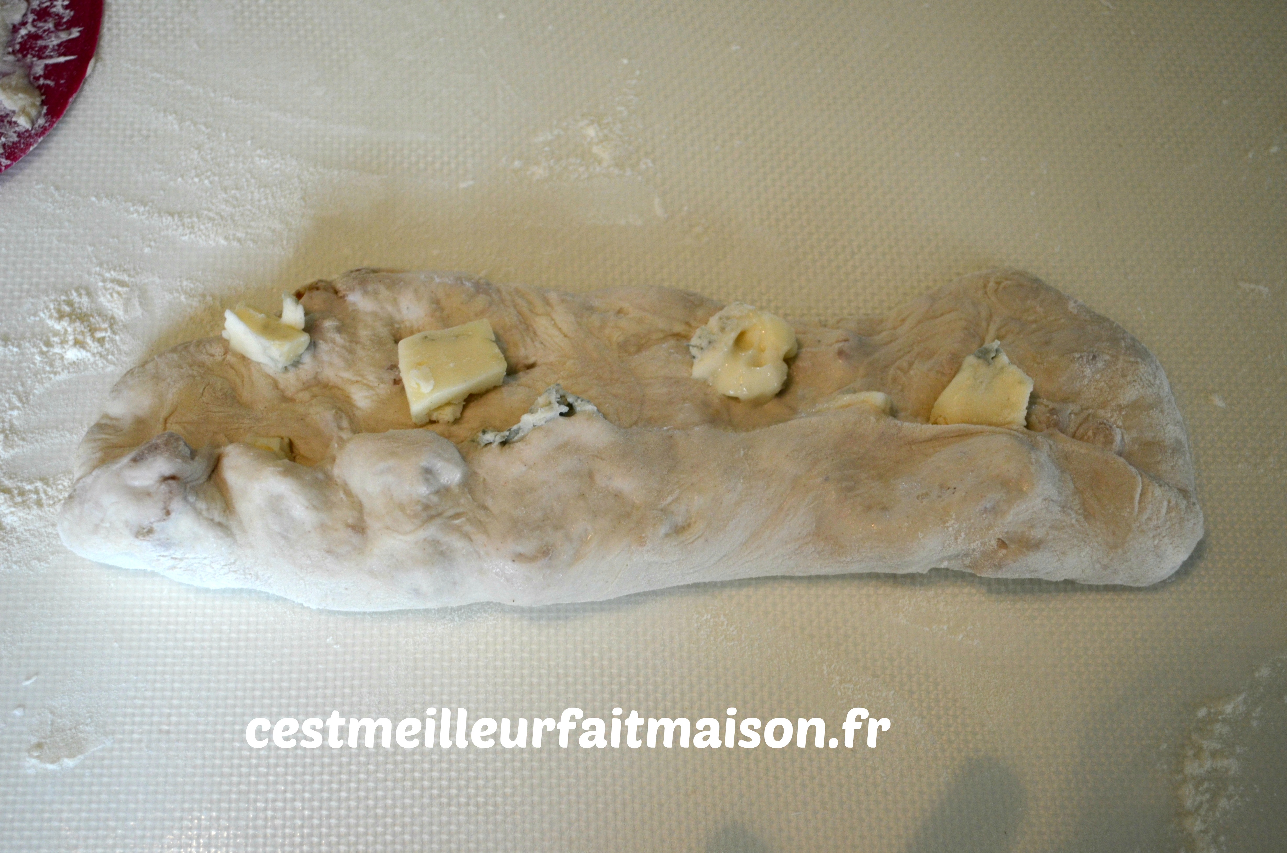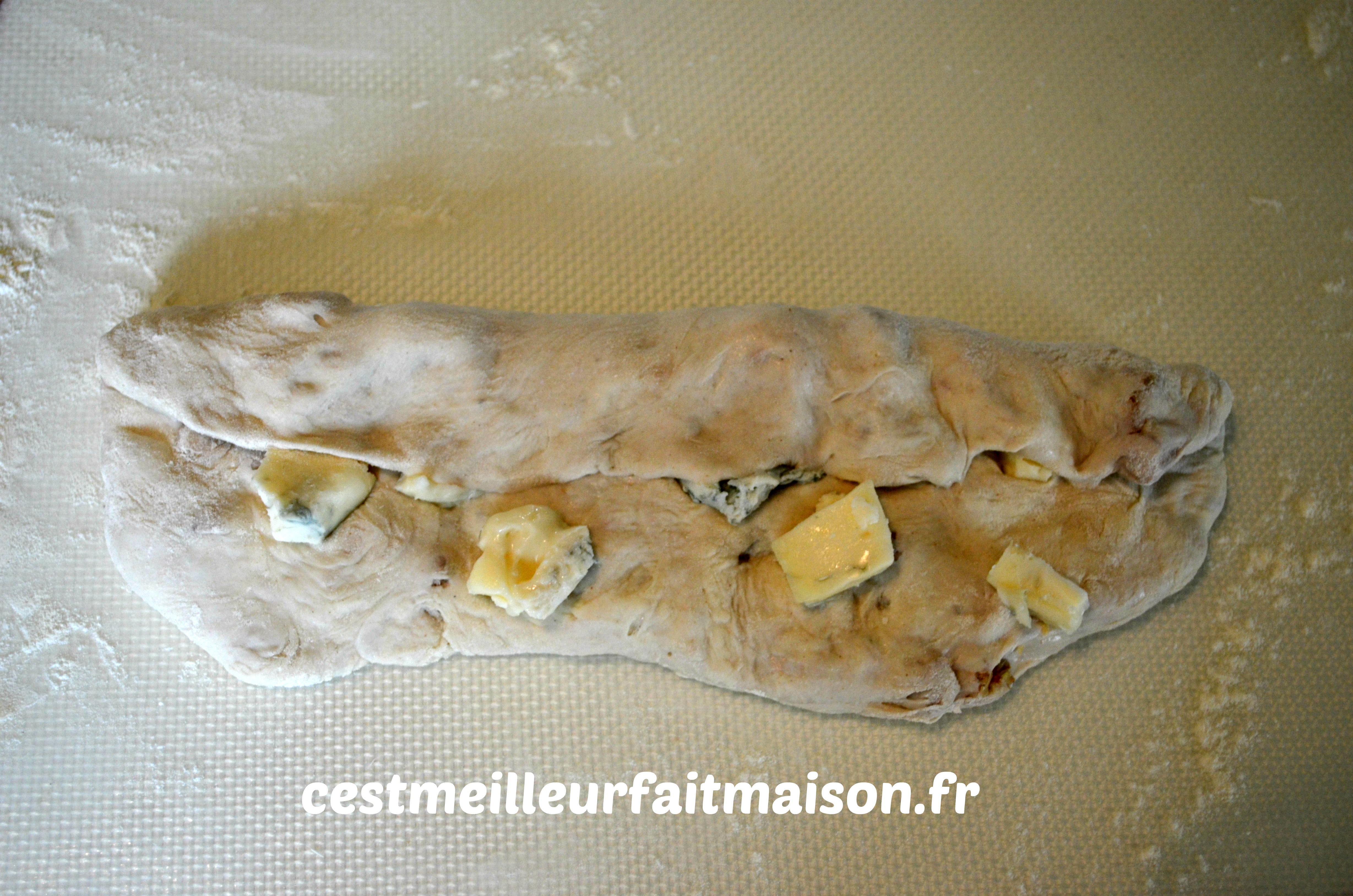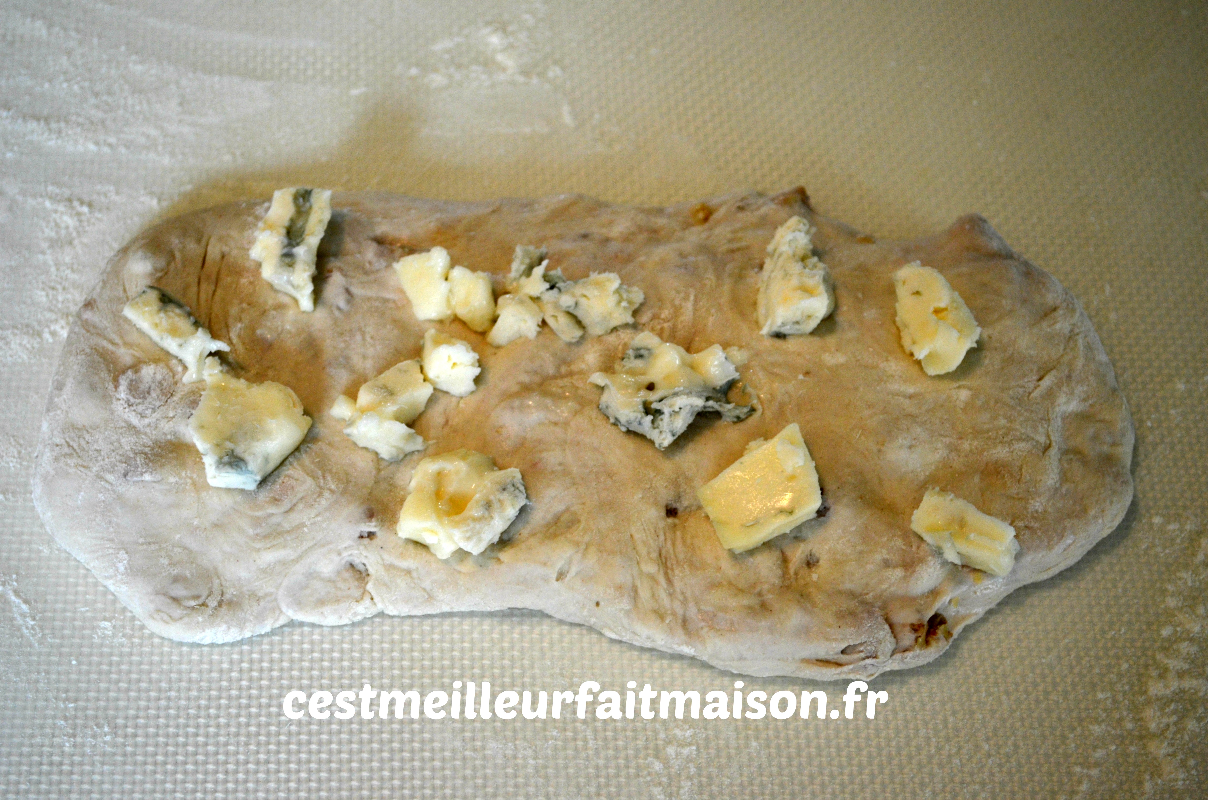 4- Coupez le gorgonzola en petits morceaux. Applatir la pâte avec la paume de la main et répartir le gorgonzola dessus.