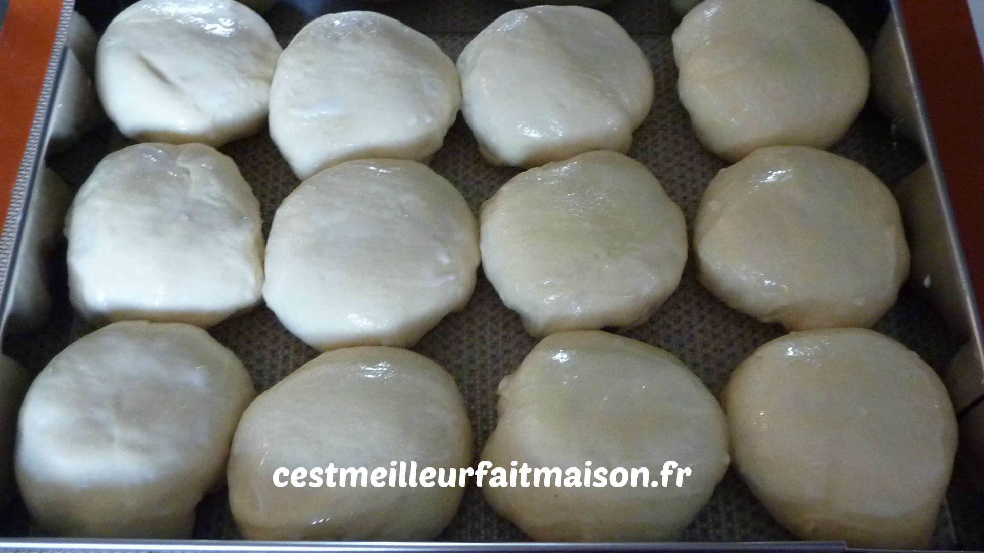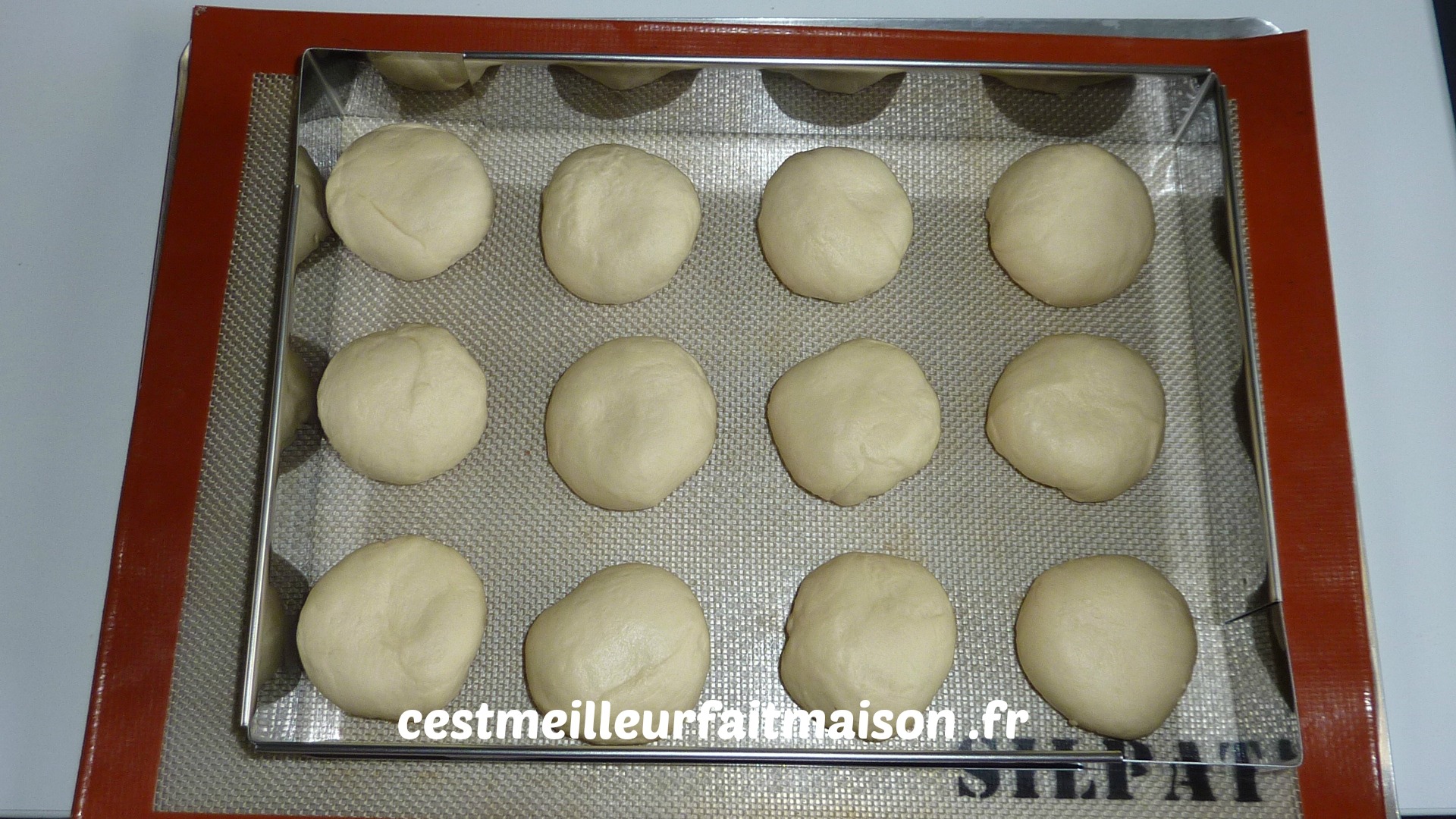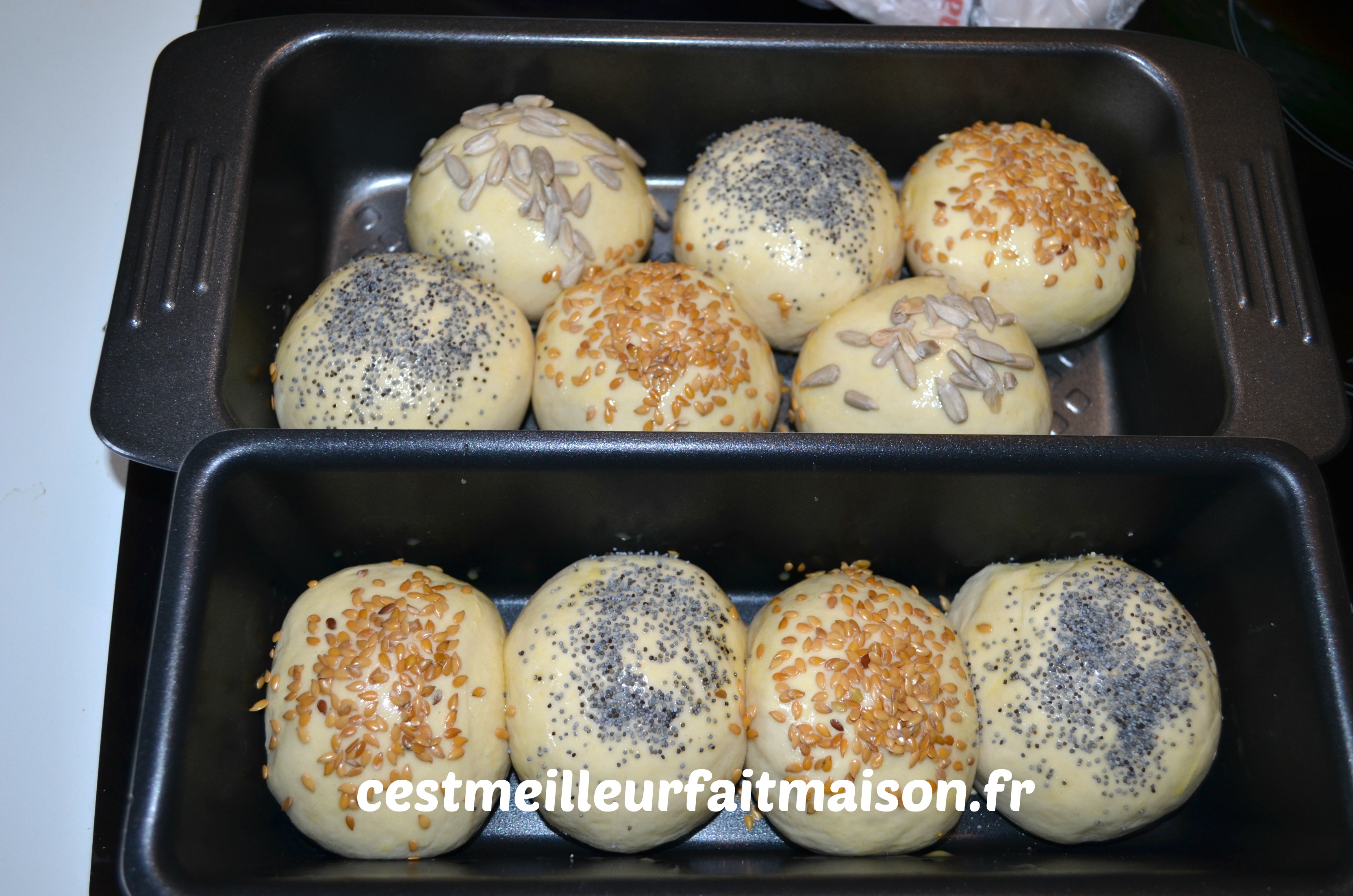 5- Dégazer la pâte et la diviser en 12 boules égales. Les placer dans un cadre en inox et les laisser doubler de volume. Les dorer à l’oeuf et mettre des graines sur chaque boule. Je ne les ai pas dorés à l’oeuf car il me restait du beurre fondu (celui des beignets) et j’ai préféré l’utiliser pour le finir. Je pense que c’est mieux avec de l’oeuf car les graines n’ont pas tenu avec le beurre.