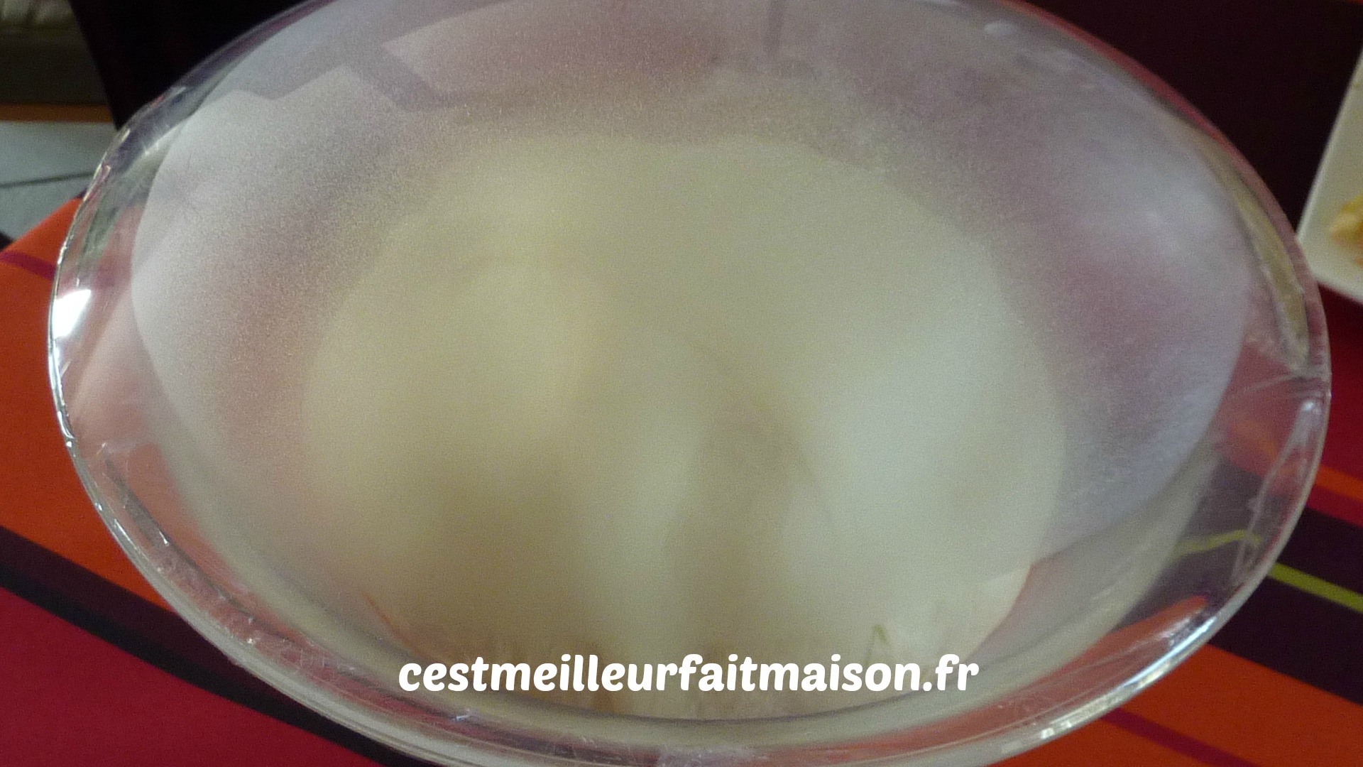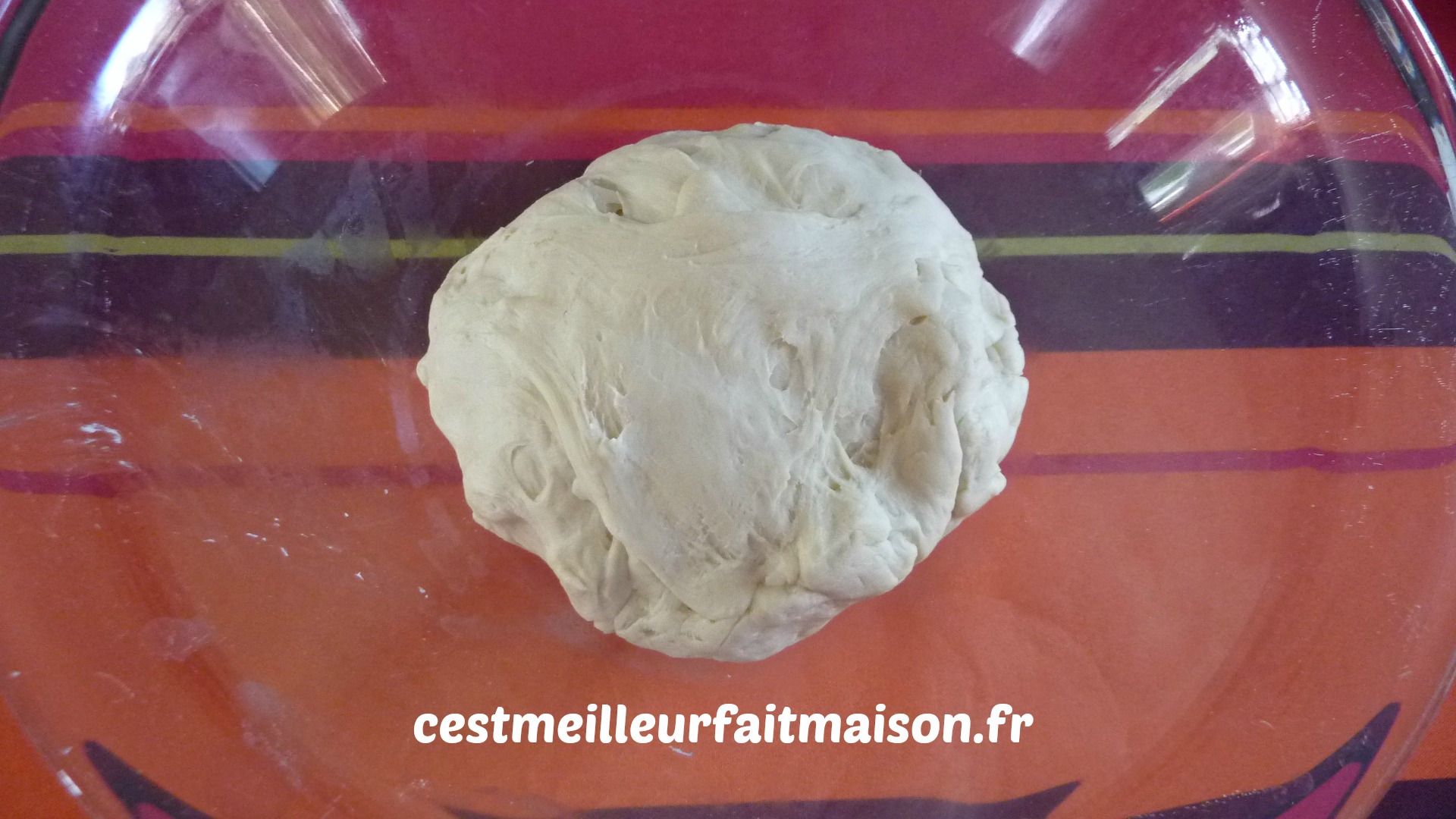 4- Faire une boule et laisser reposer dans un saladier recouvert d’un film jusqu’à ce que la pâte ait doublé de volume.