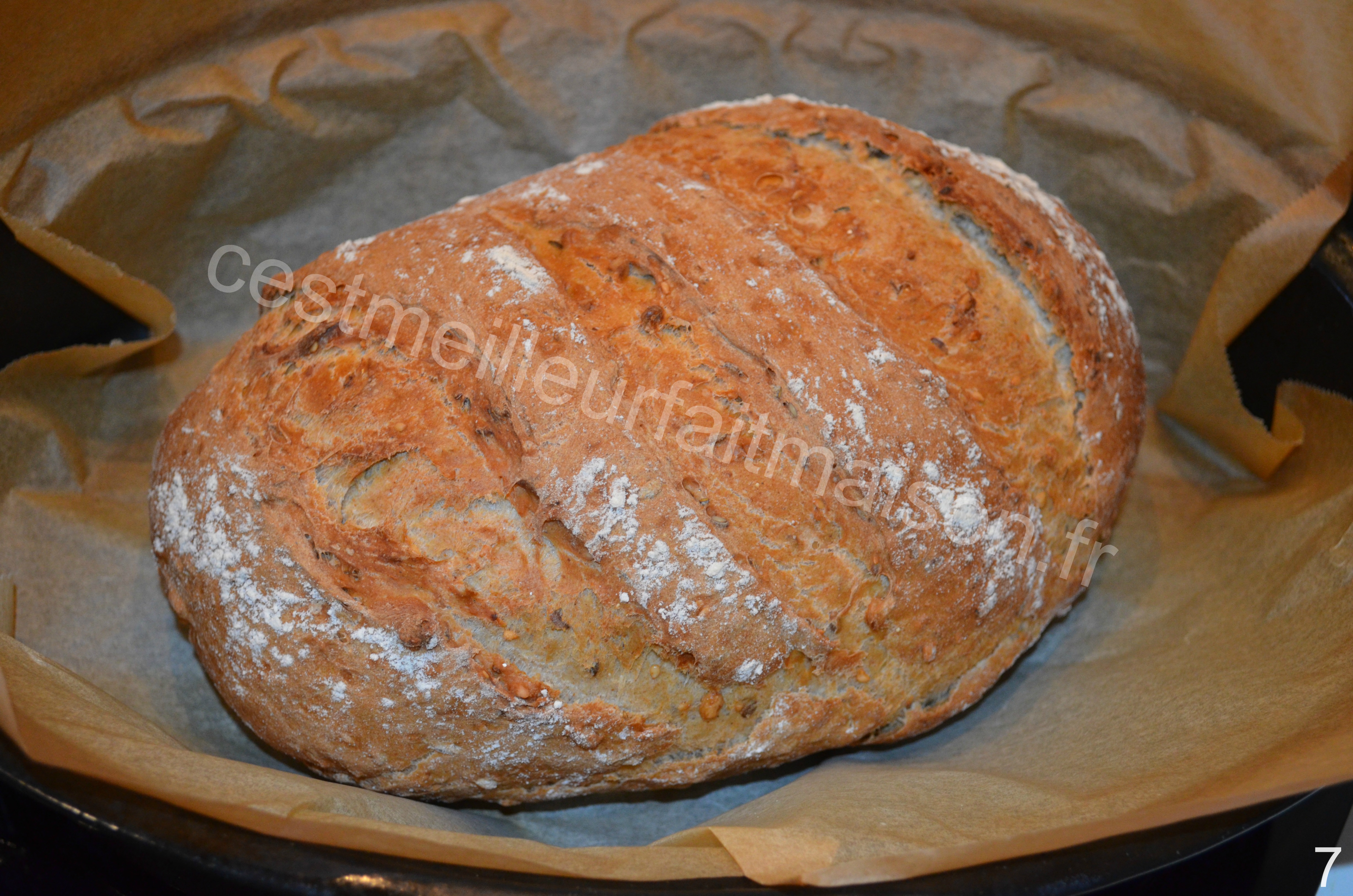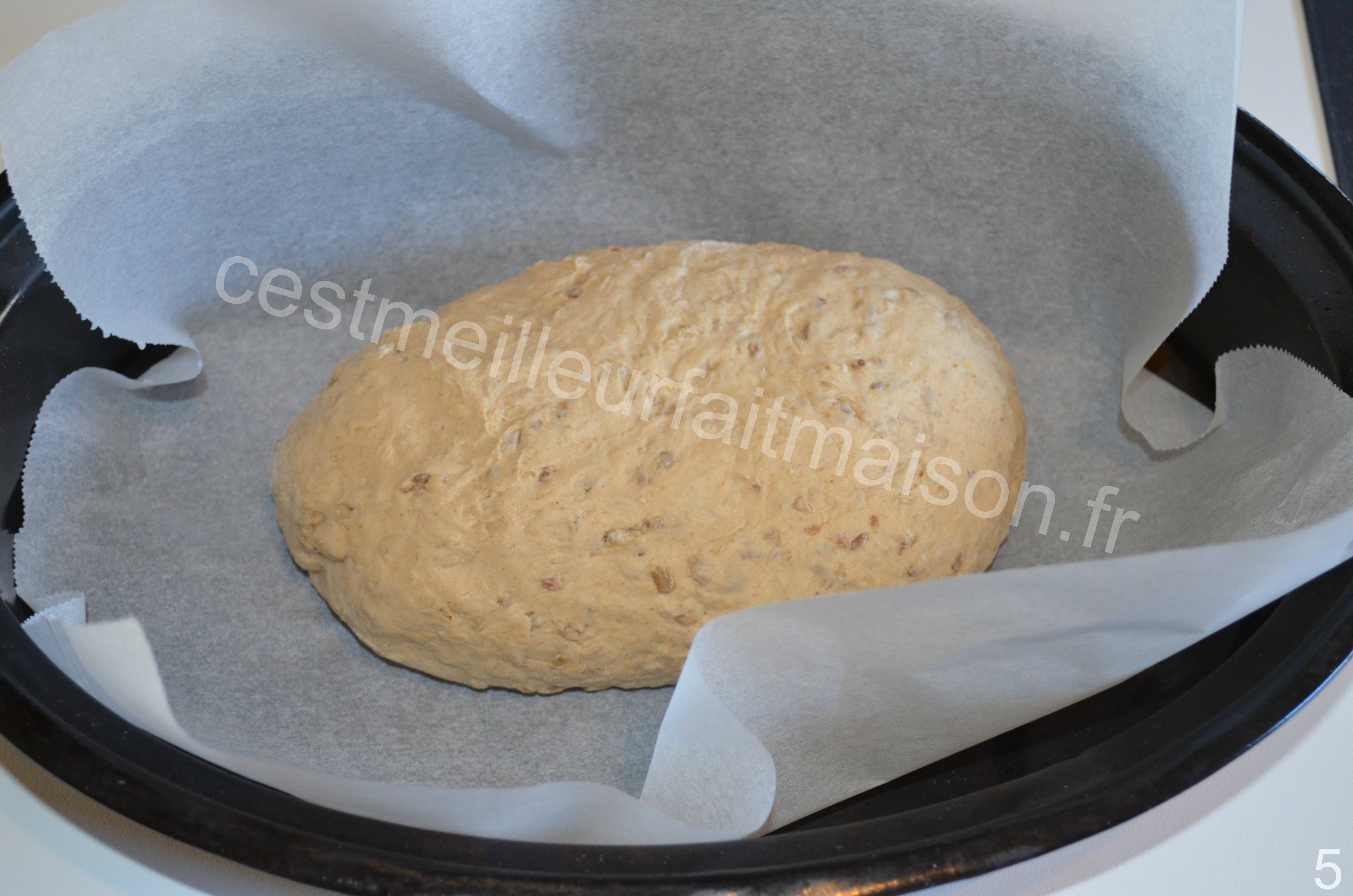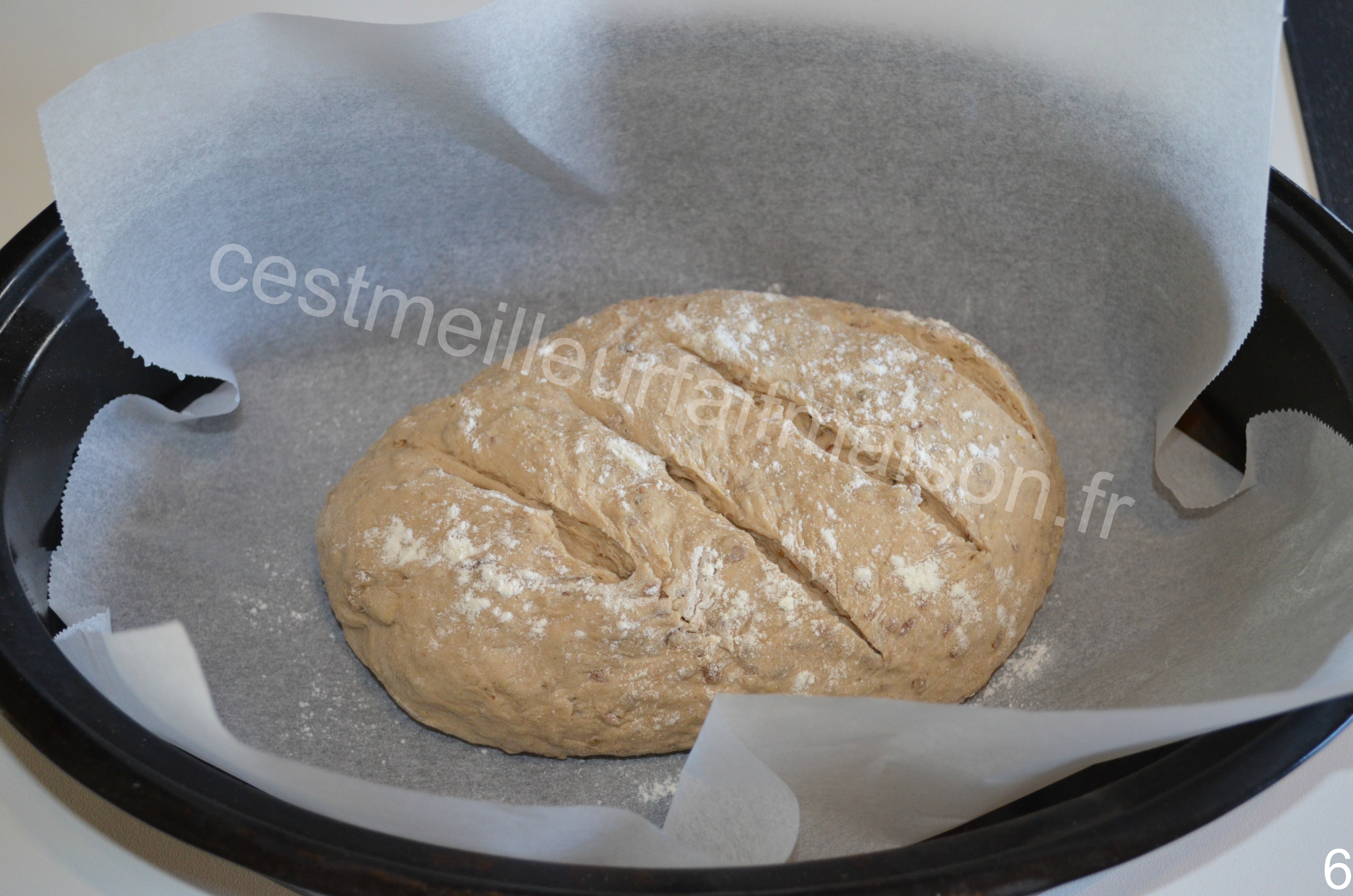 4-Lorsque la pâte a bien levé, la dégazer et la mettre en forme. Poser le paton sur du papier sulfurisée dans une cocotte avec couvercle. Fariner et grigner le pain. Couvrir et enfourner à four froid pour 50 min à 250°C.