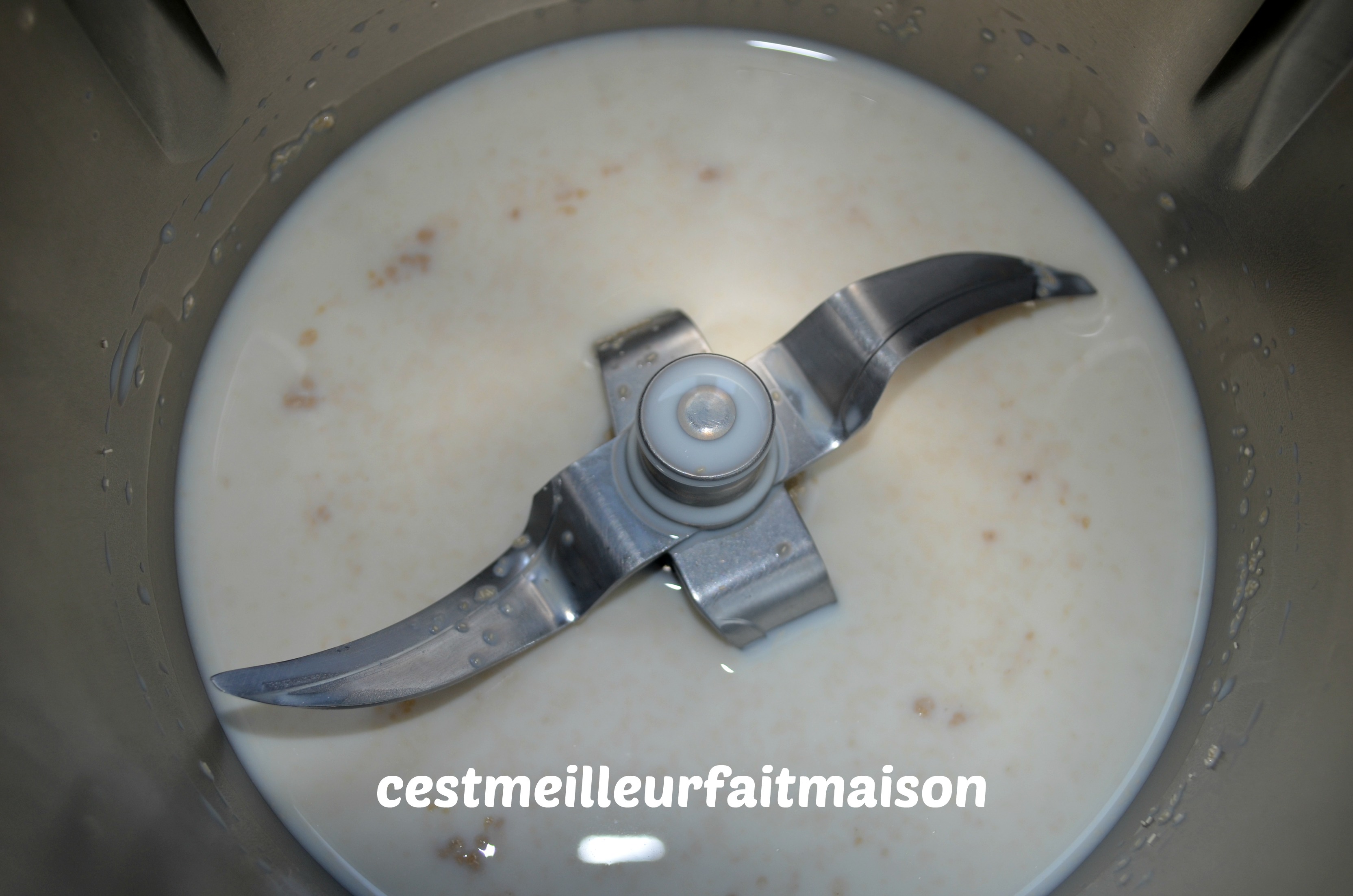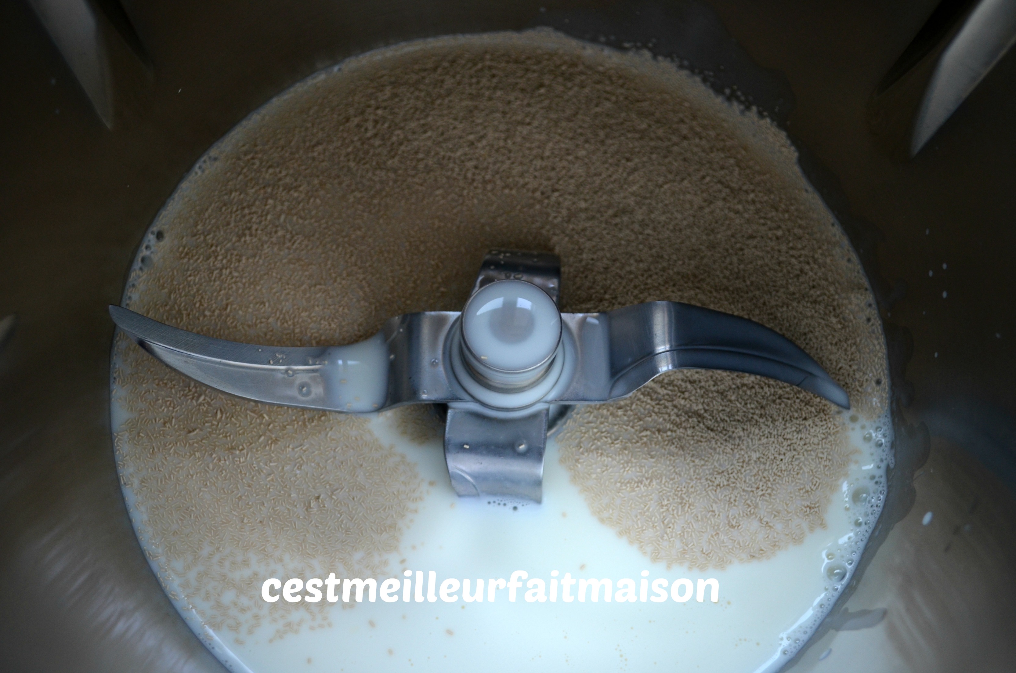 1- Dans le bol du Thermomix mettre le lait et la levure. Chauffer 1.30 min/37°C/Vit 2.