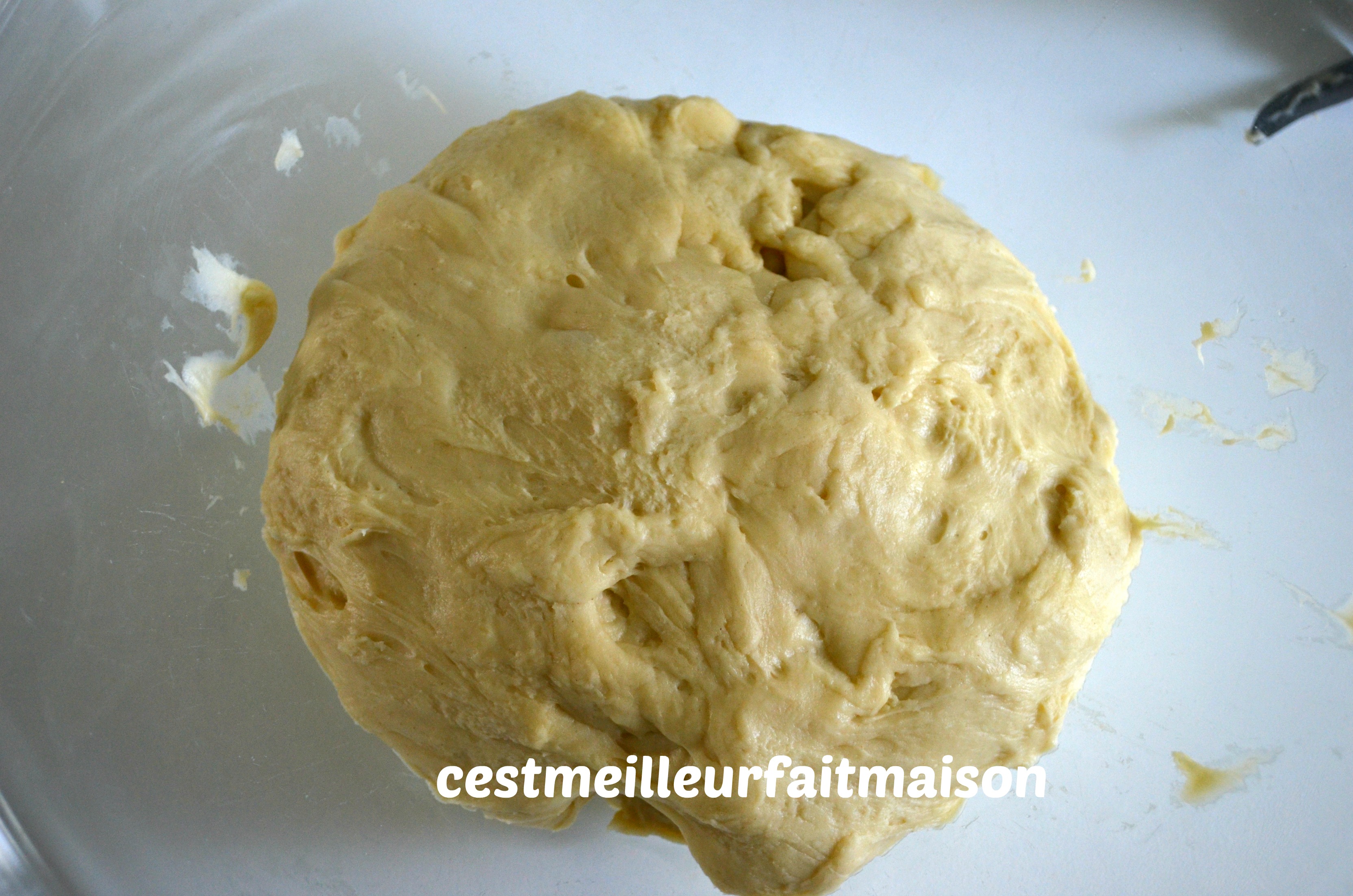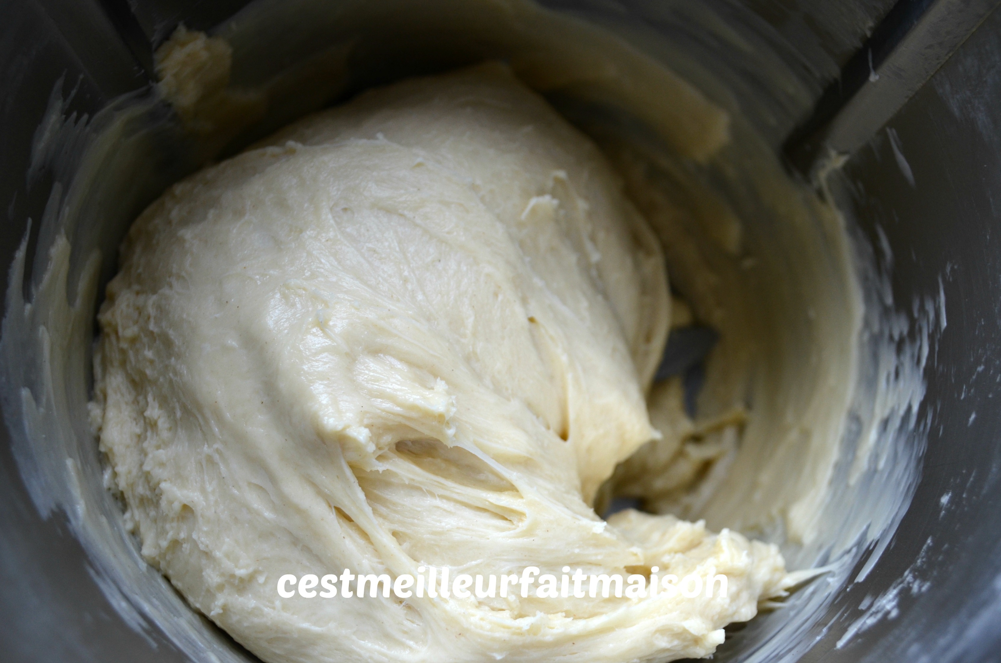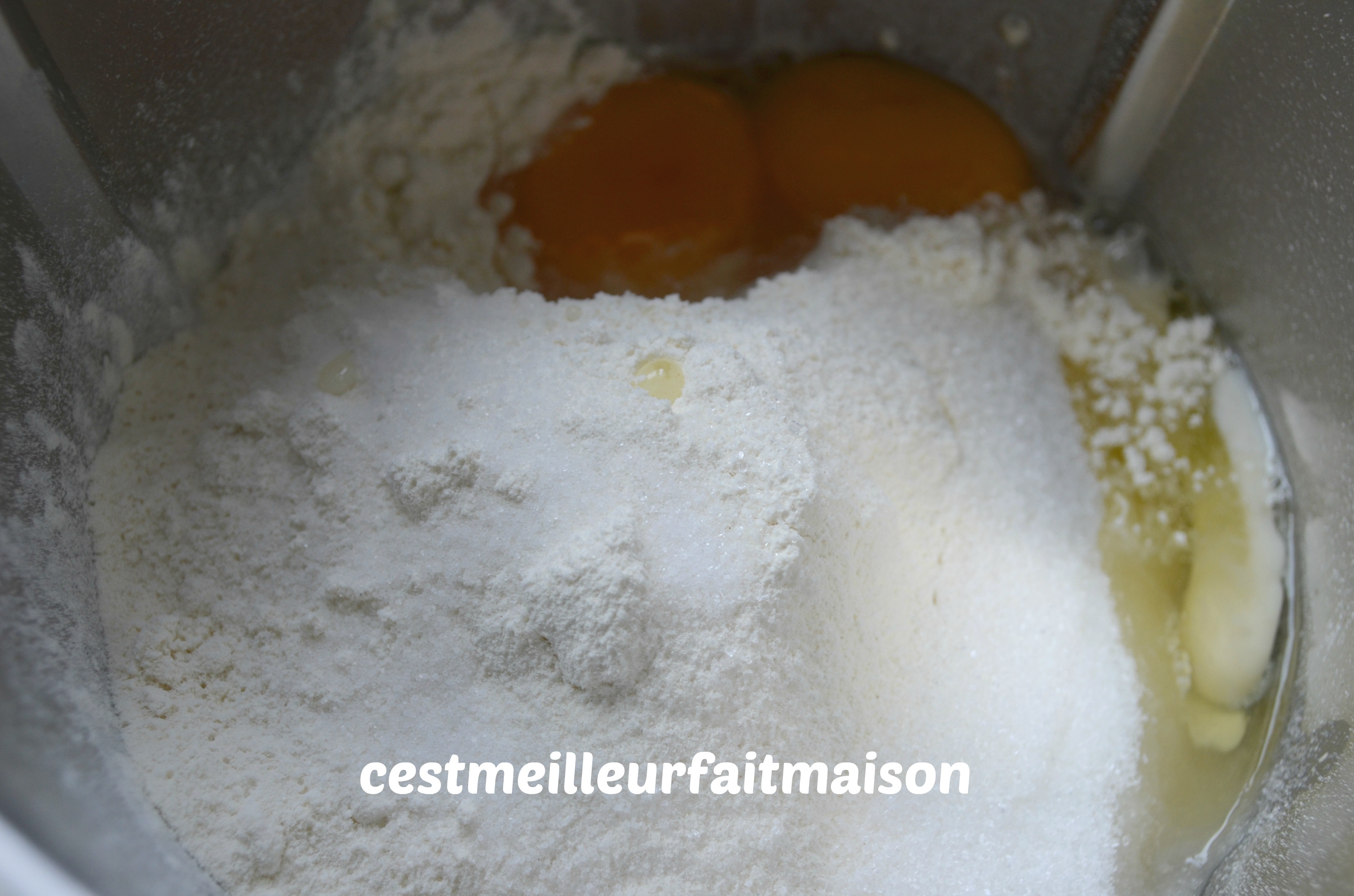2- Ajouter la farine, le sucre, le sel, l’œuf et le jaune. Pétrir 3 min.