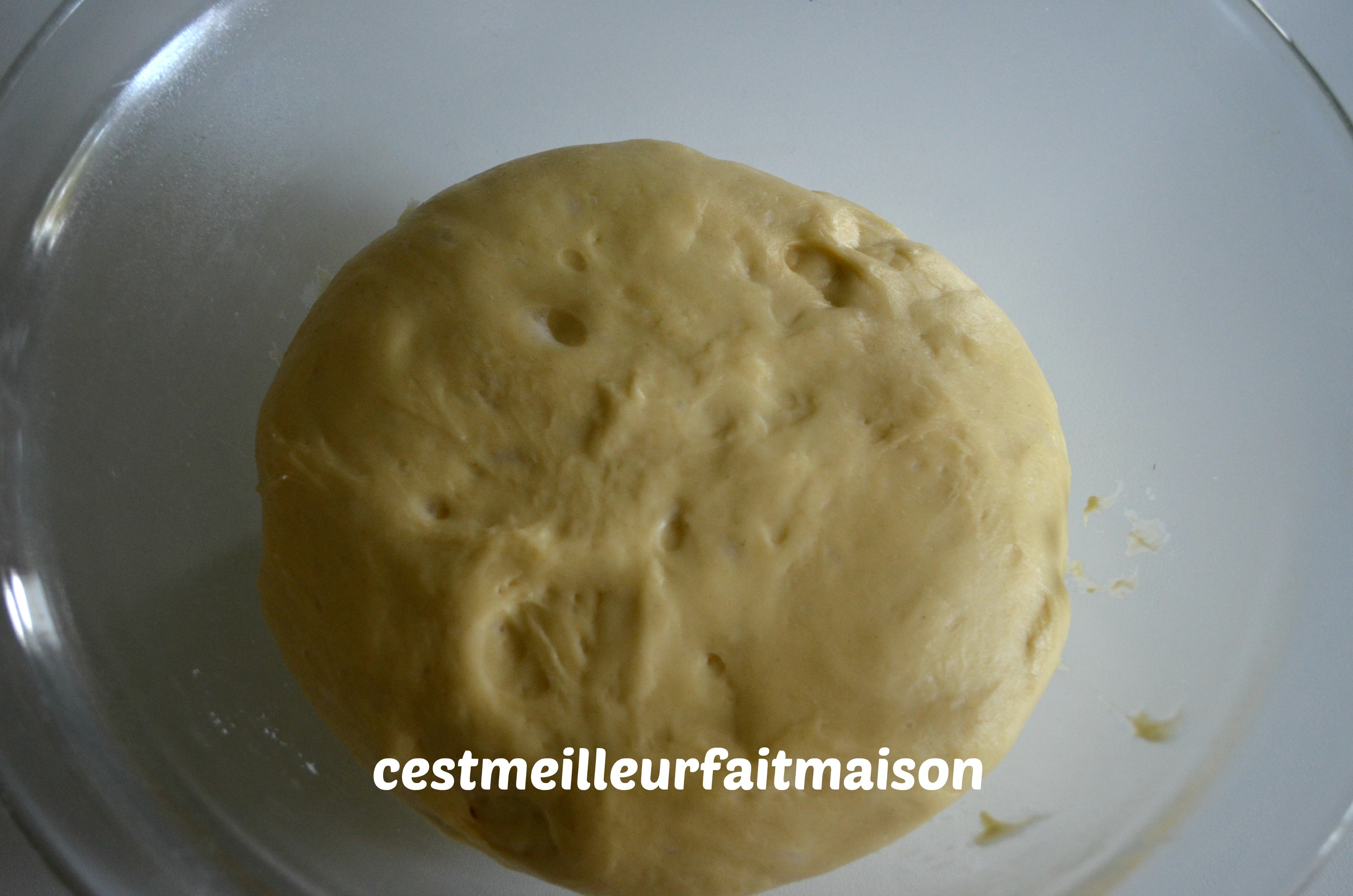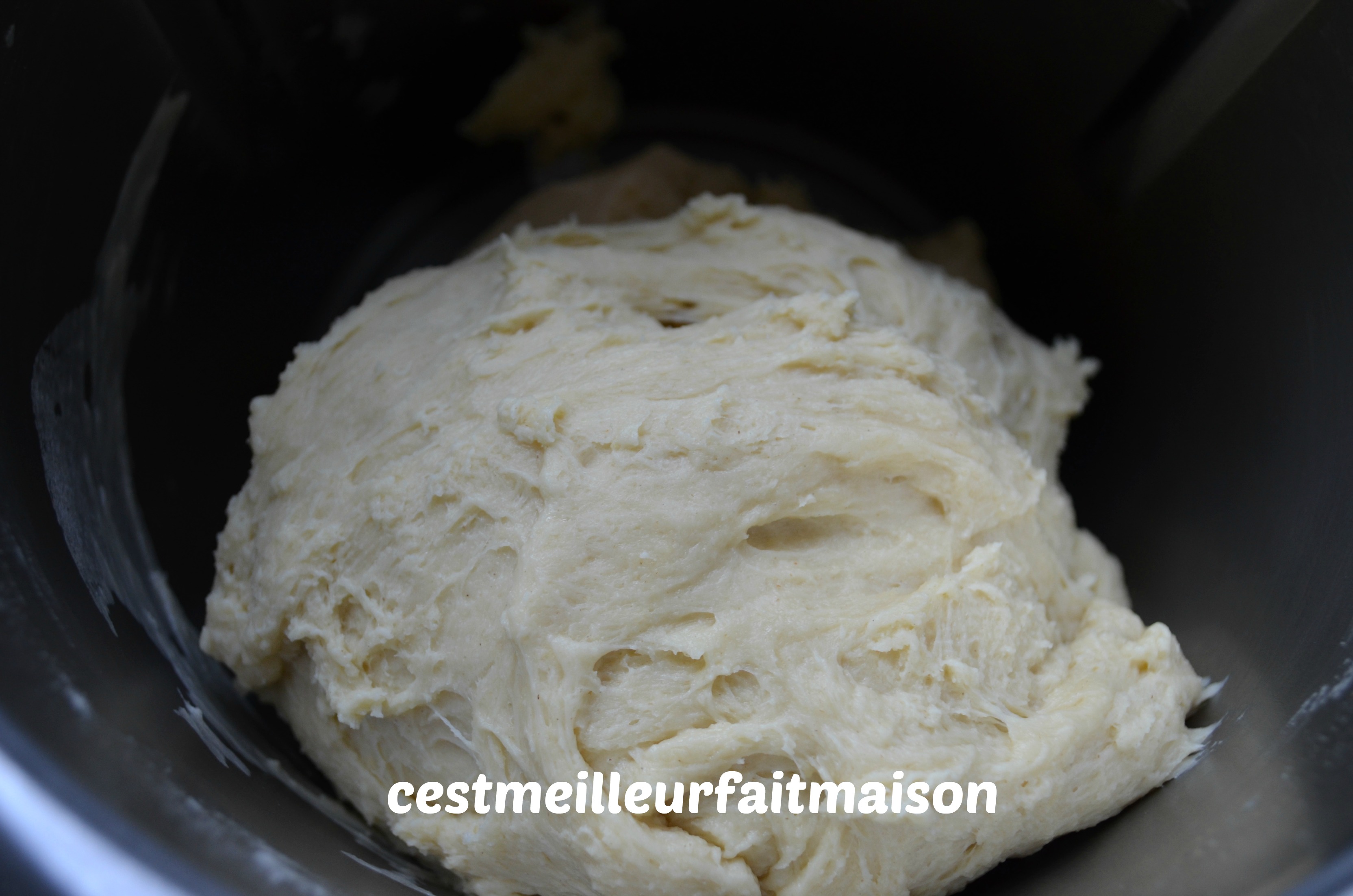 4- Mettre la pâte dans un récipient et la laisser reposer jusqu’à ce qu’elle ait doublé de volume (environ 1h30). Si vous n’avez pas besoin du Thermomix, pour une autre recette, vous pouvez la laisser dans le bol. Comme il est chaud, la pâte montera plus vite.