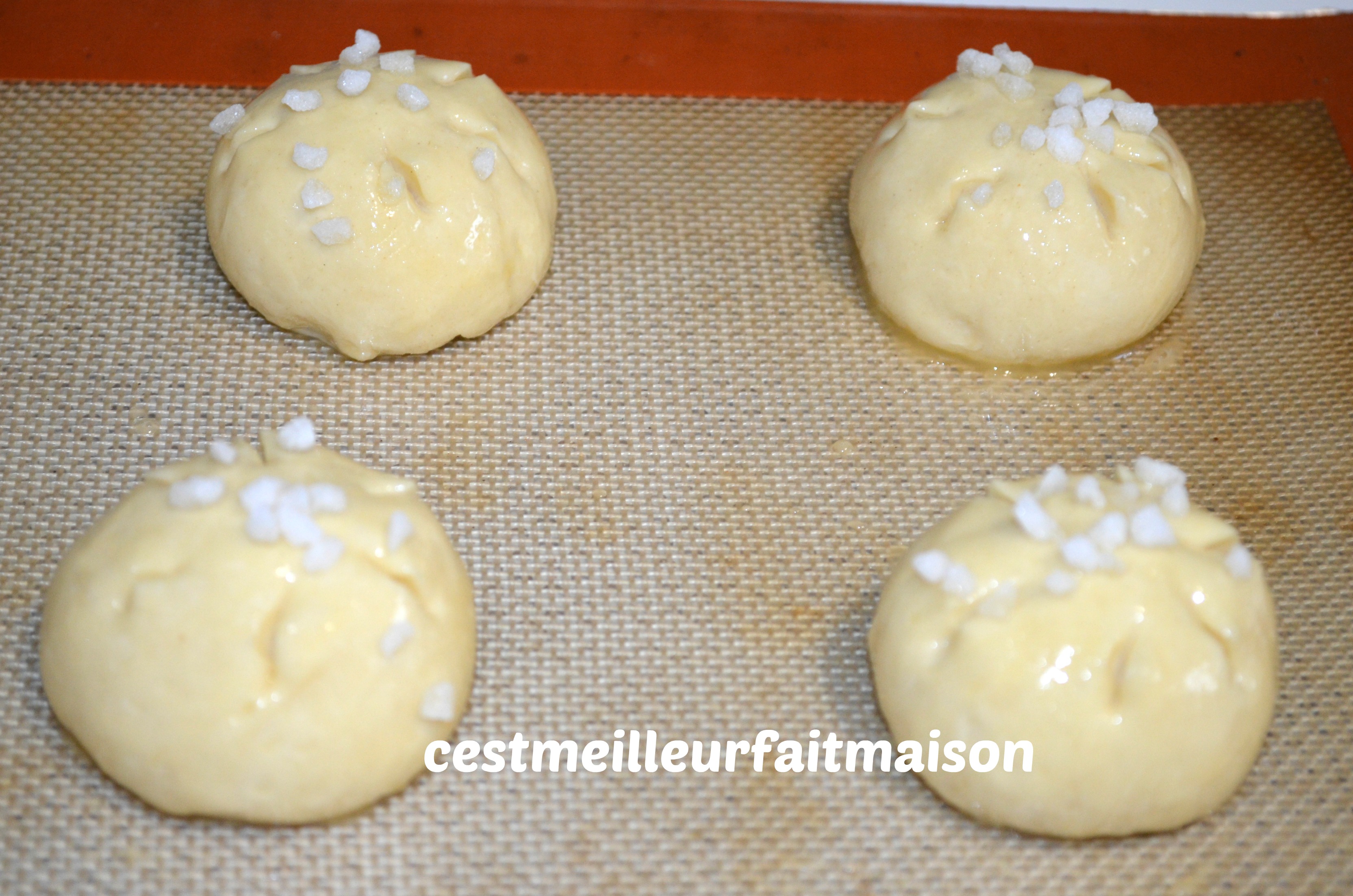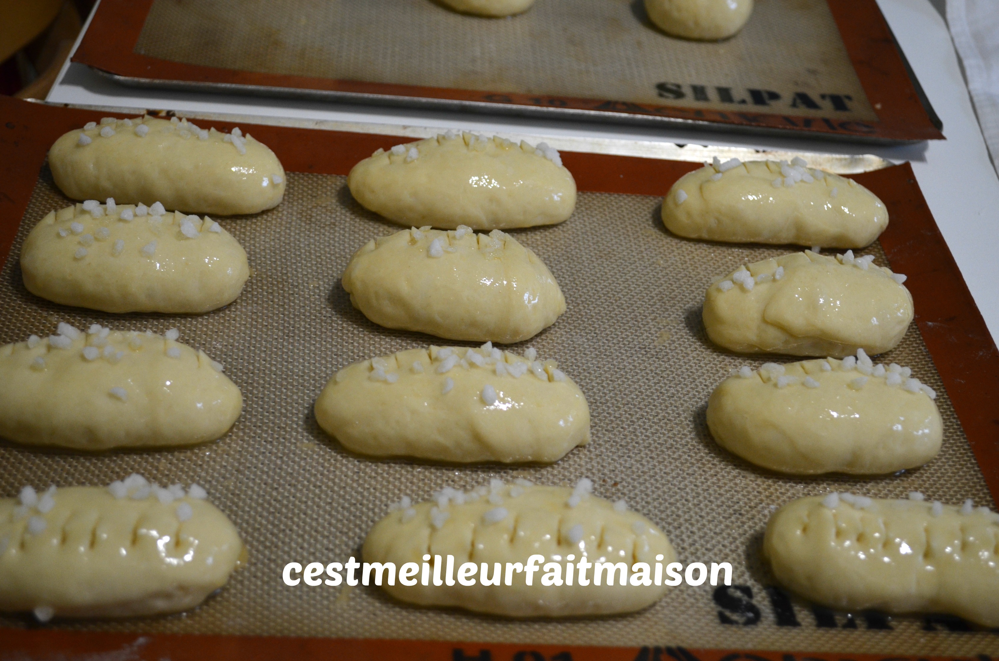 A la fin de la pousse, badigeonner les pains d’œuf battu. Les inciser avec une lame ou des ciseaux. Ajouter éventuellement du sucre en grain.