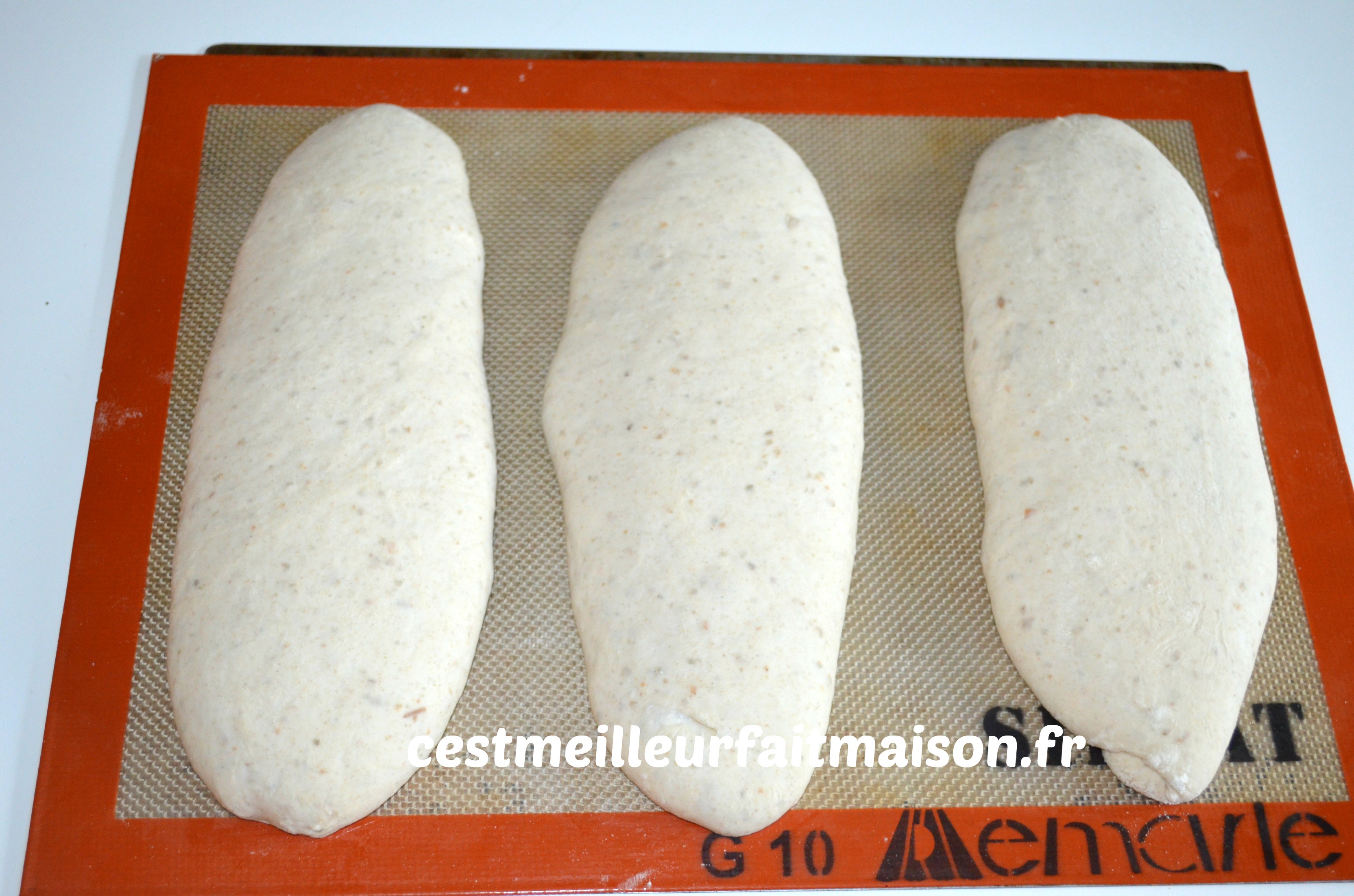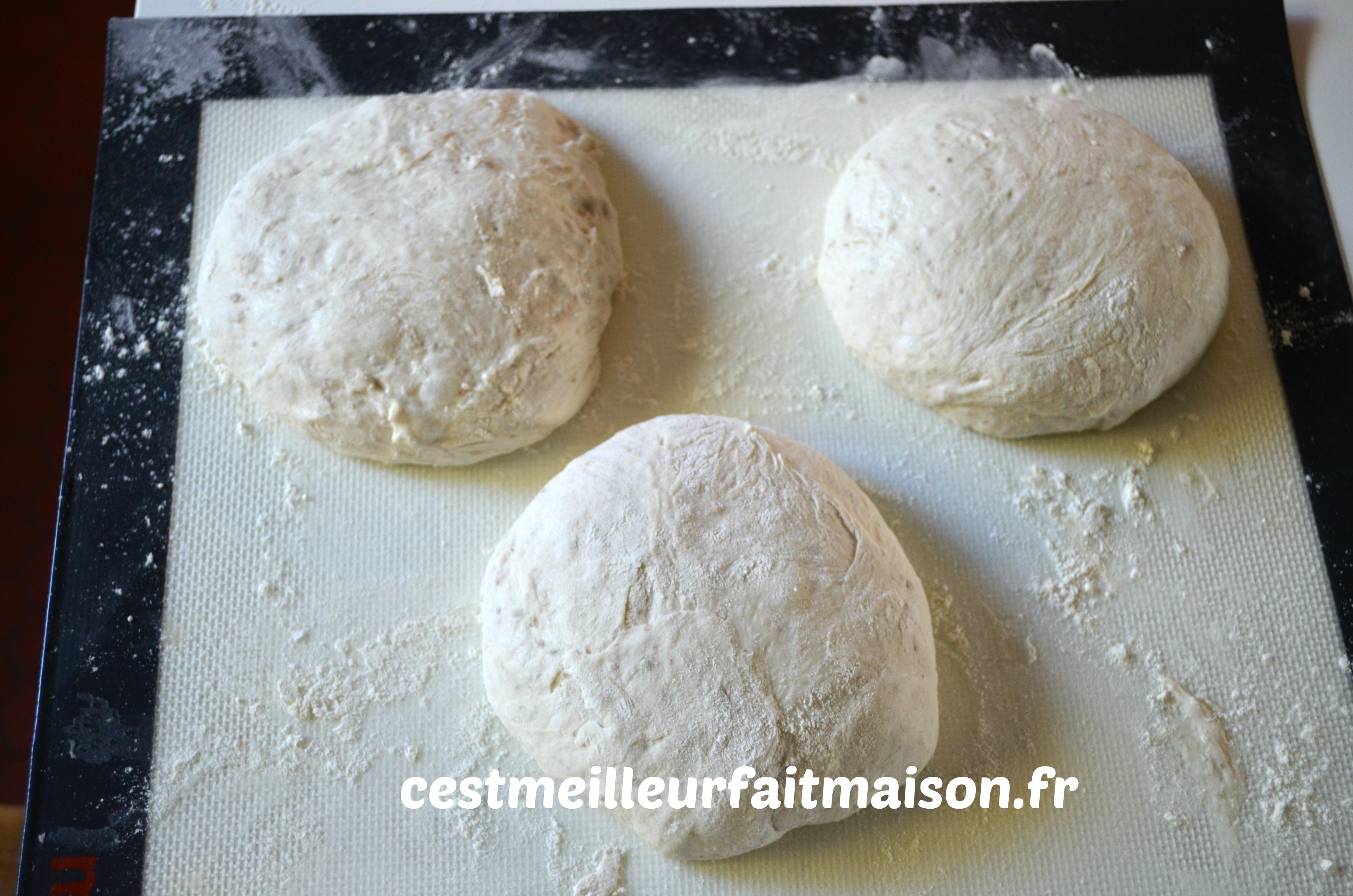 5- Placer les pâtons sur une plaque recouverte de papier cuisson ou d’une toile silpat (c’est mieux sur du papier pour la cuisson du dessous du pain). Laisser pousser 1h30 sous un linge.