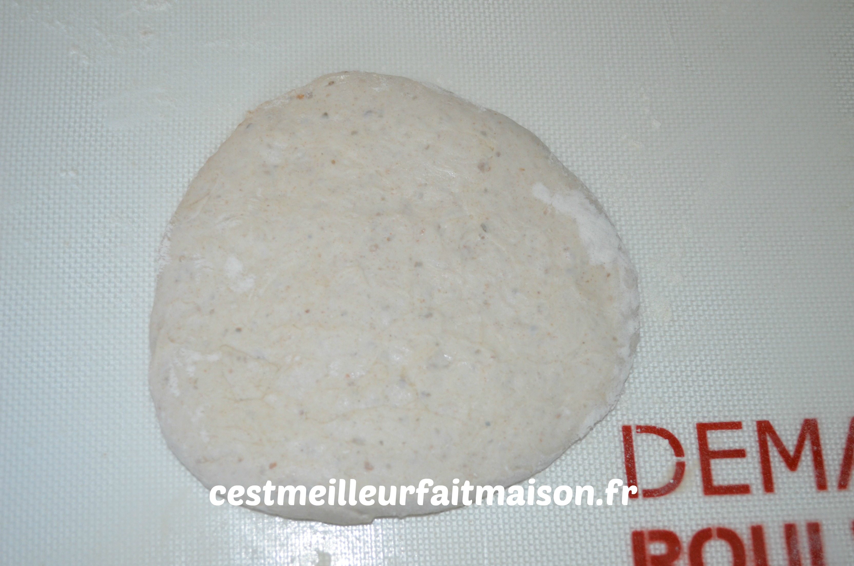 2- Former une boule et laisser reposer sous un linge ou un film alimentaire pendant 2 heures. A mi-parcours, rabattre la pâte (la plier en deux).