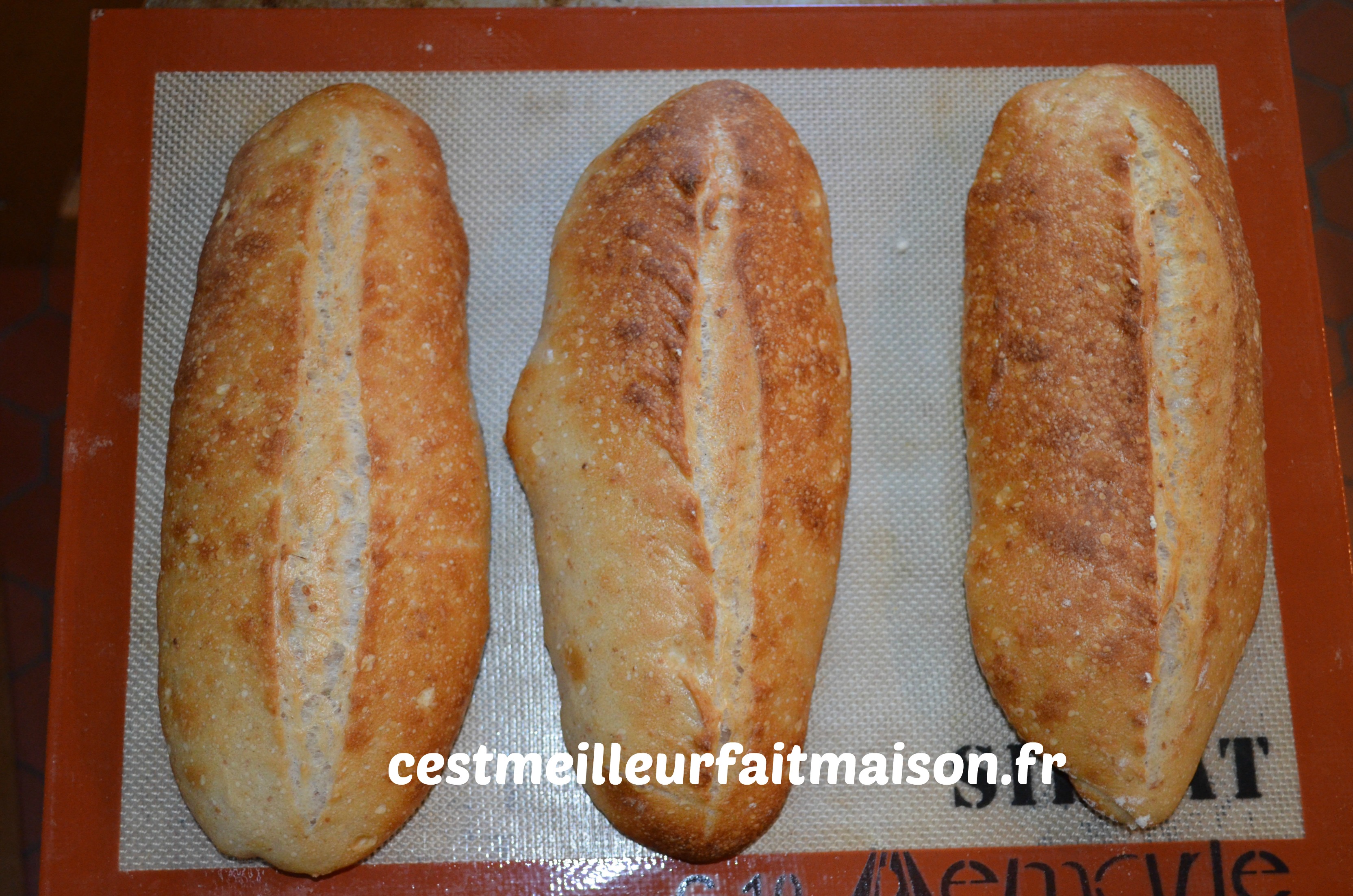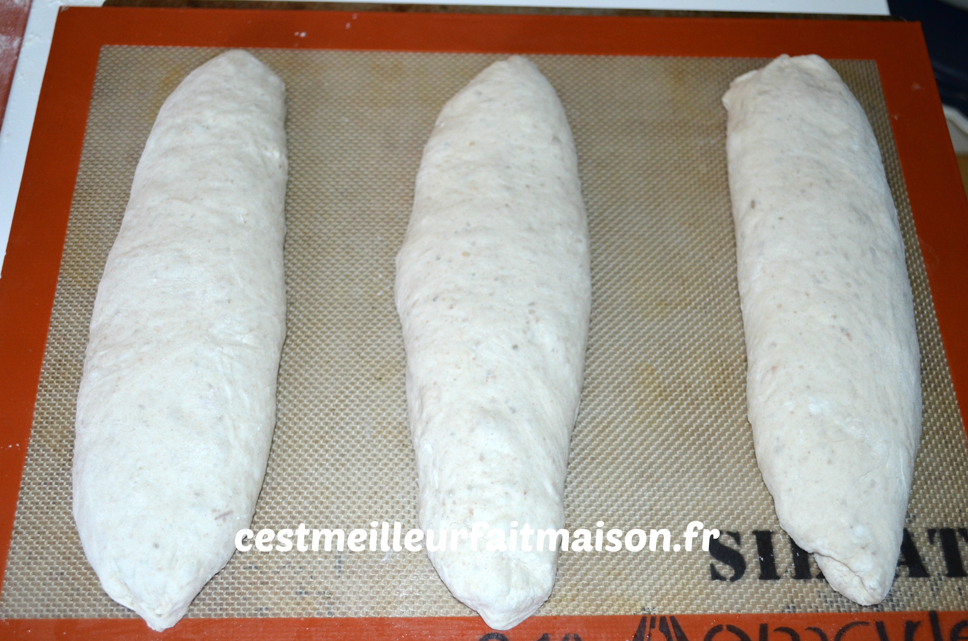 Il y a plus de 80 recettes dans le Larousse du pain d’Eric Kayser, j’ai donc encore de nombreuses recettes à tester et à vous faire partager. J’ai modifié celle-ci dans la présentation. Je n’ai pas eu envie de faire un gros pain de 950 g, j’ai préféré faire 3 pains.