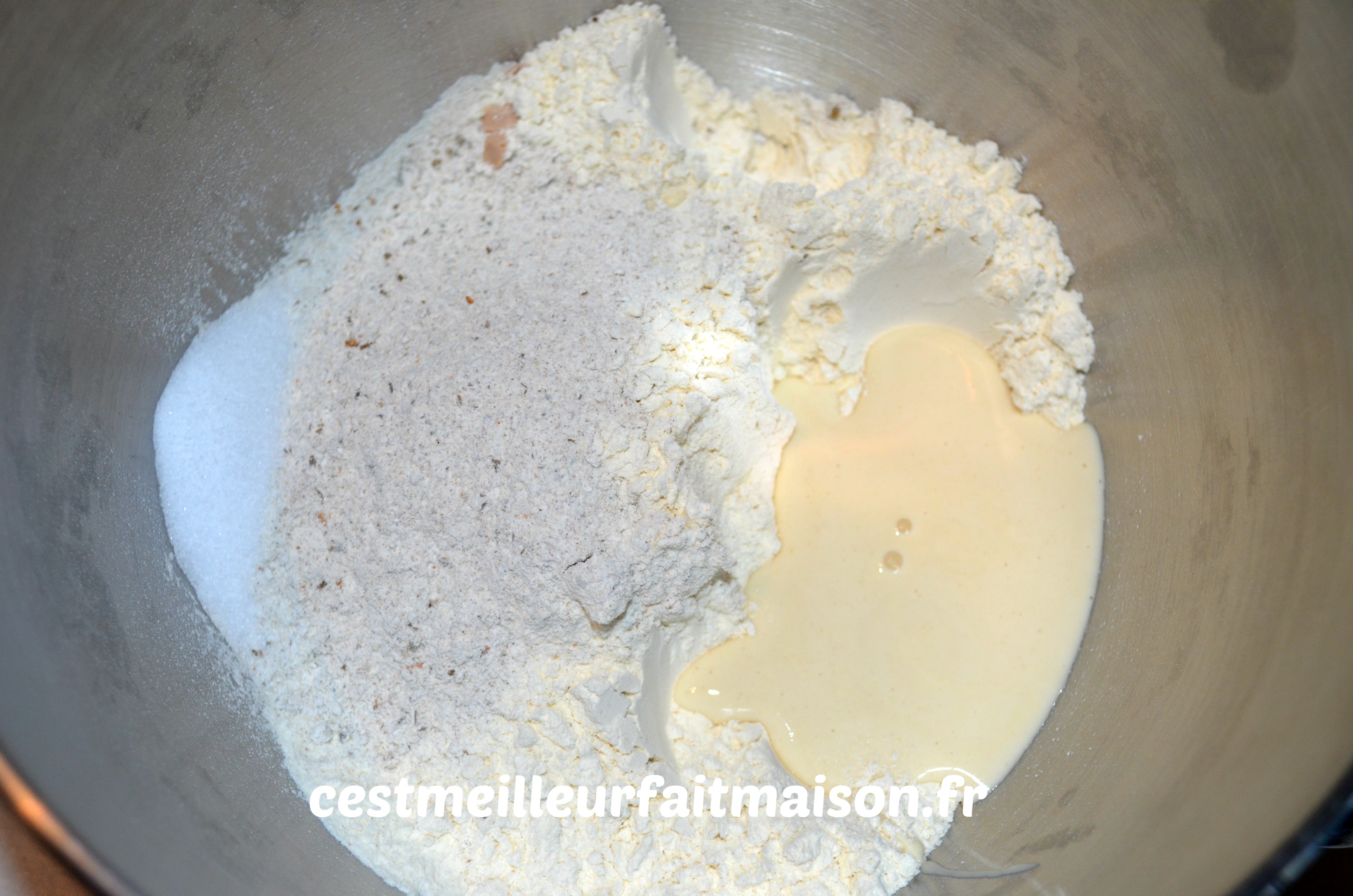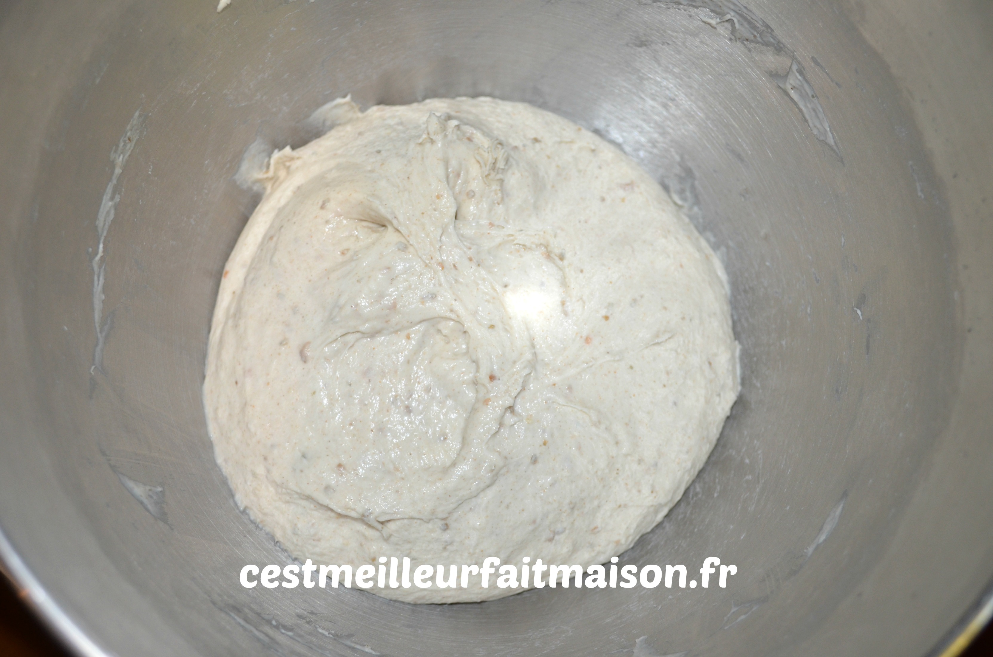 1- Dans le bol du robot, mettre les deux farines, le levain liquide, l’eau, la levure et le sel. Pétrir 4 min à Vitesse lente puis 7 min à Vitesse rapide (Vit 1 et 2 avec le Kitchenaid).