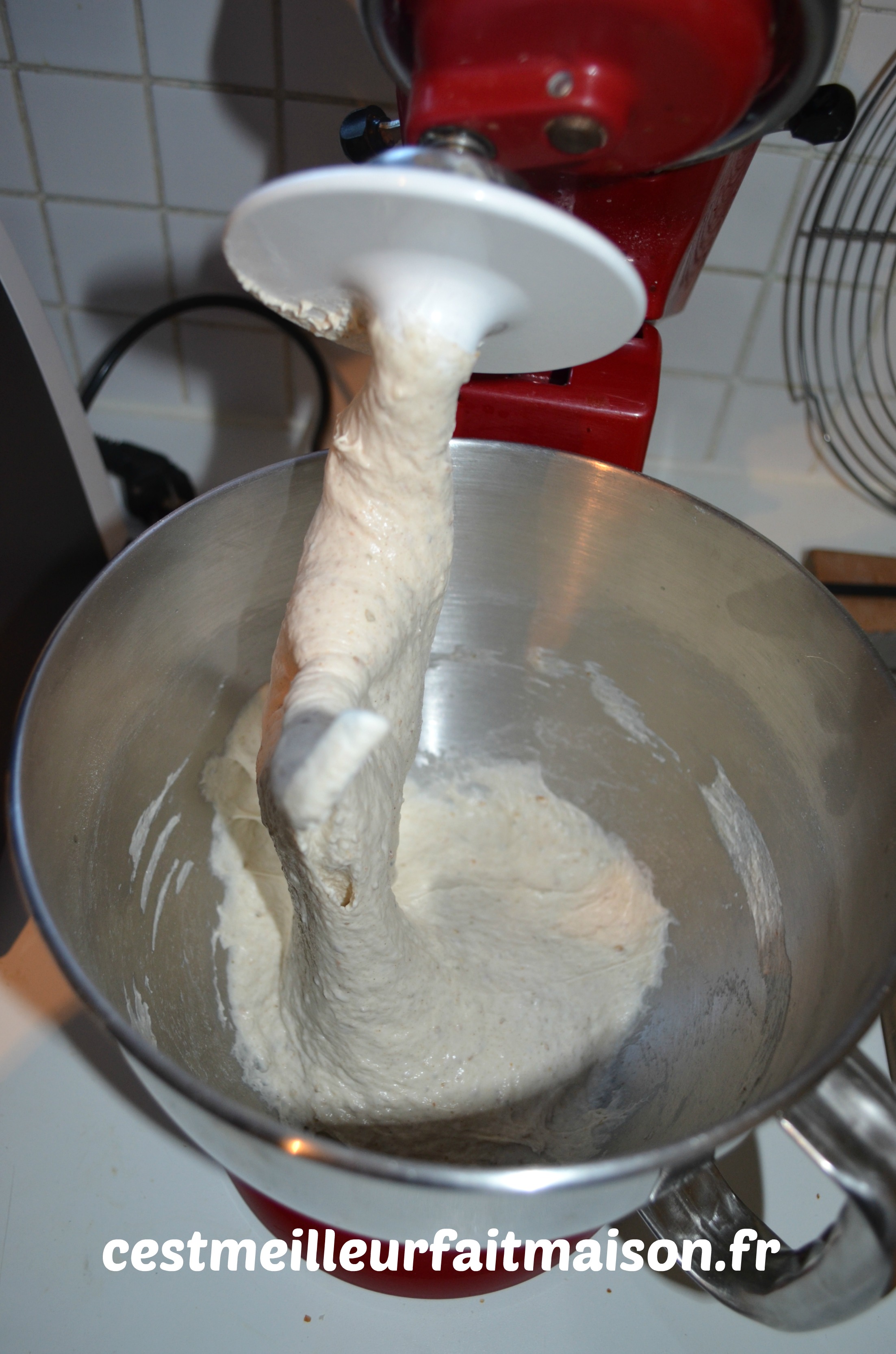 Je ne respecte plus les dosages d’eau du livre d’Eric Kayser, maintenant j’enlève systématiquement 15 g d’eau. La pâte est plus facile à travailler. J’utilise en priorité le Thermomix car je trouve que les pâtes sont mieux pétries qu’au Kitchenaid.
