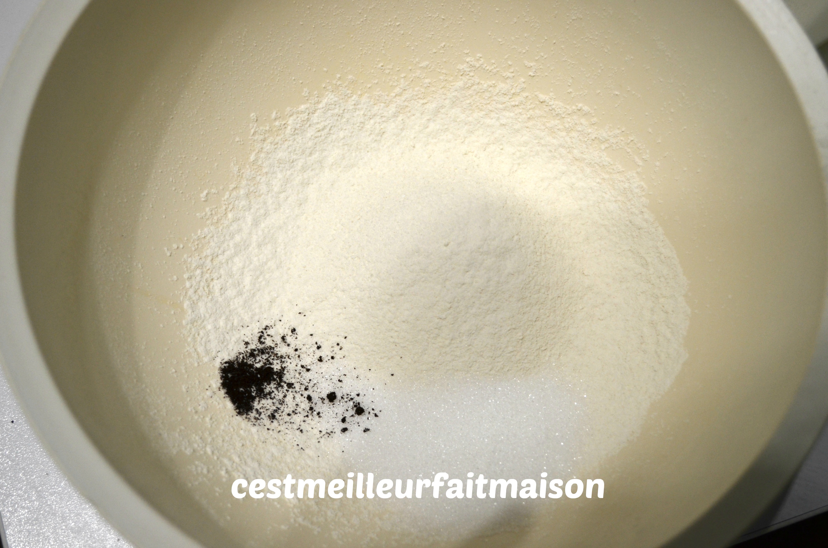 1- Dans un saladier, mélanger la farine, la levure, le sucre et la vanille en poudre.