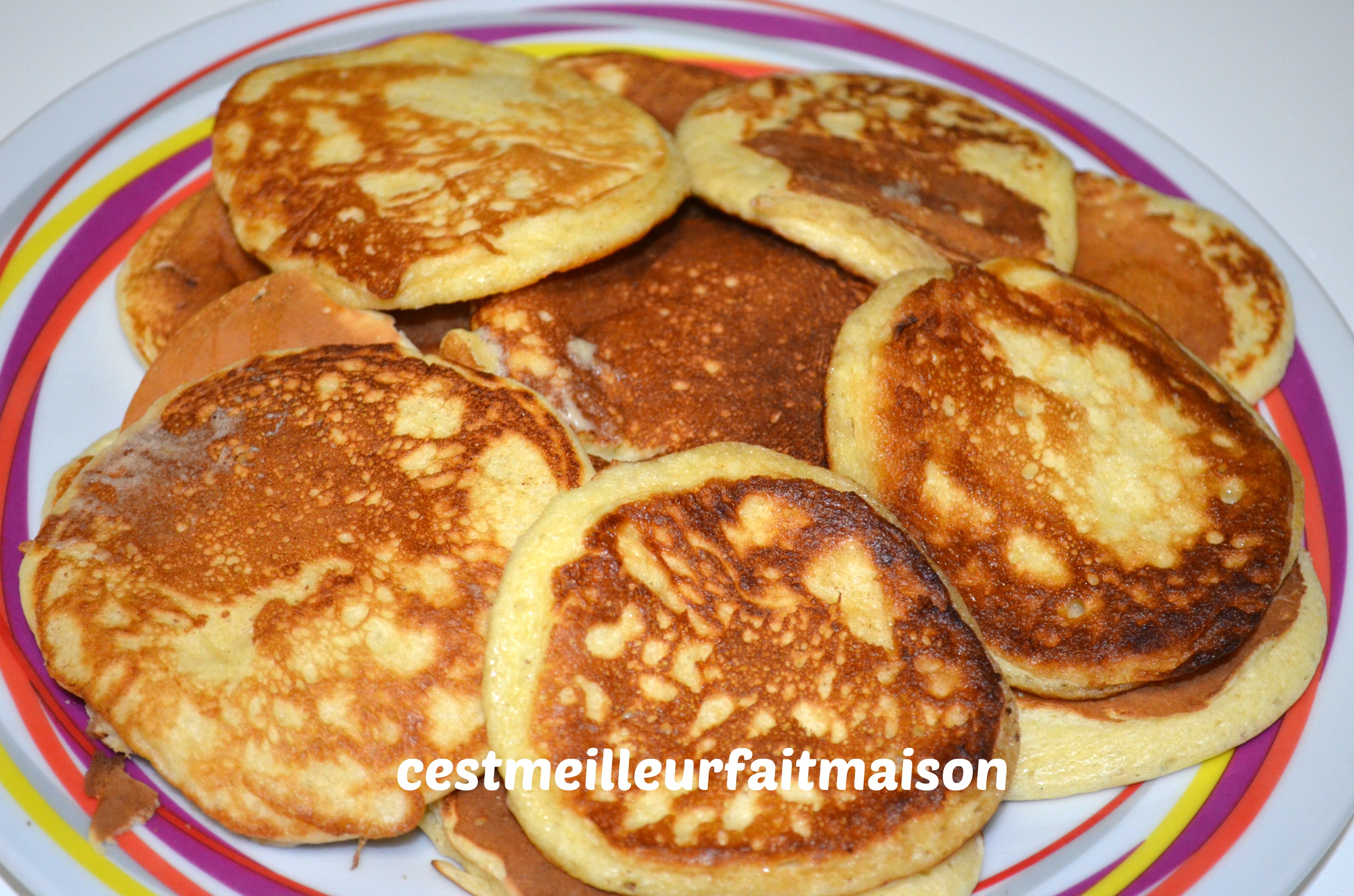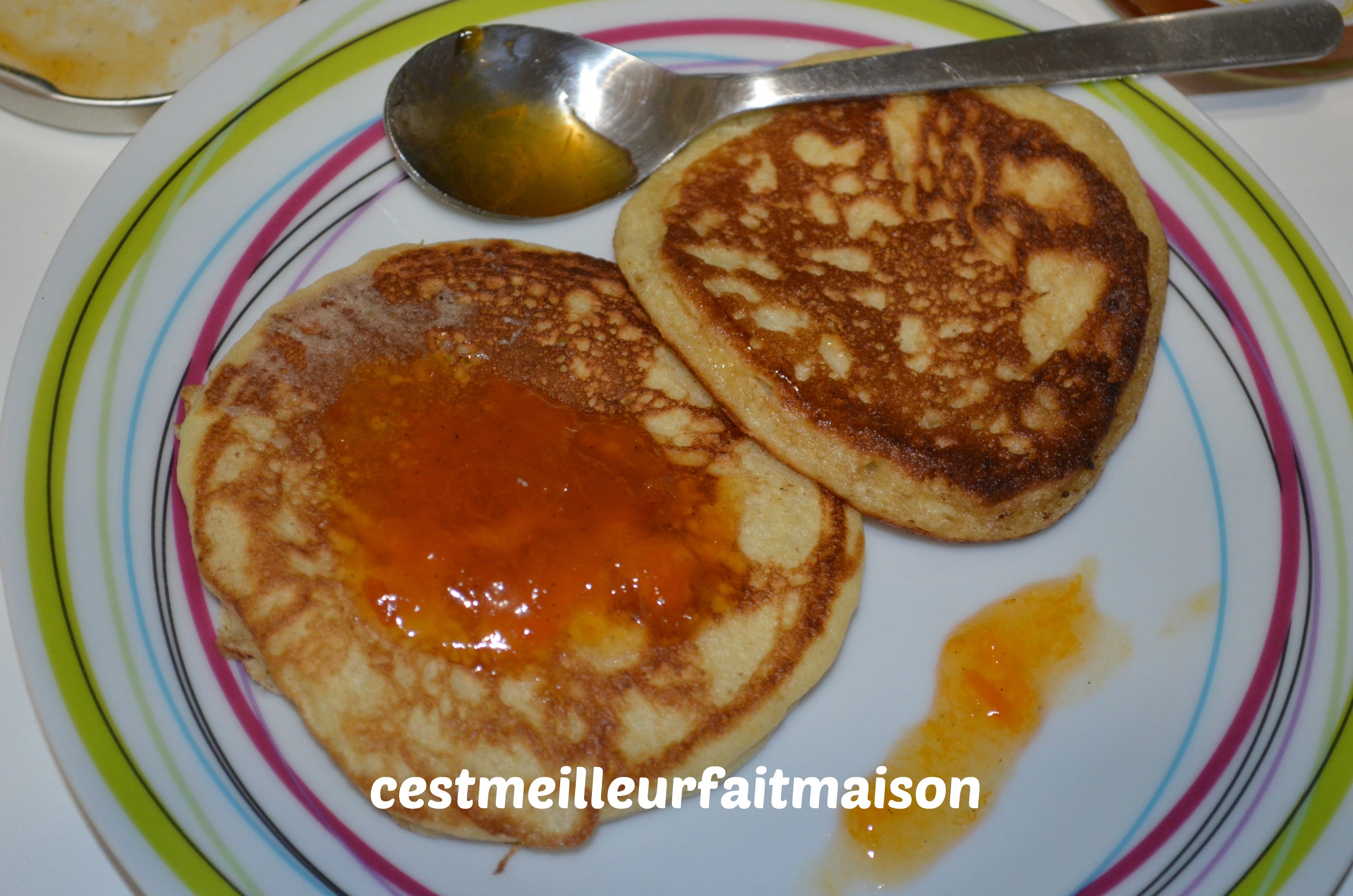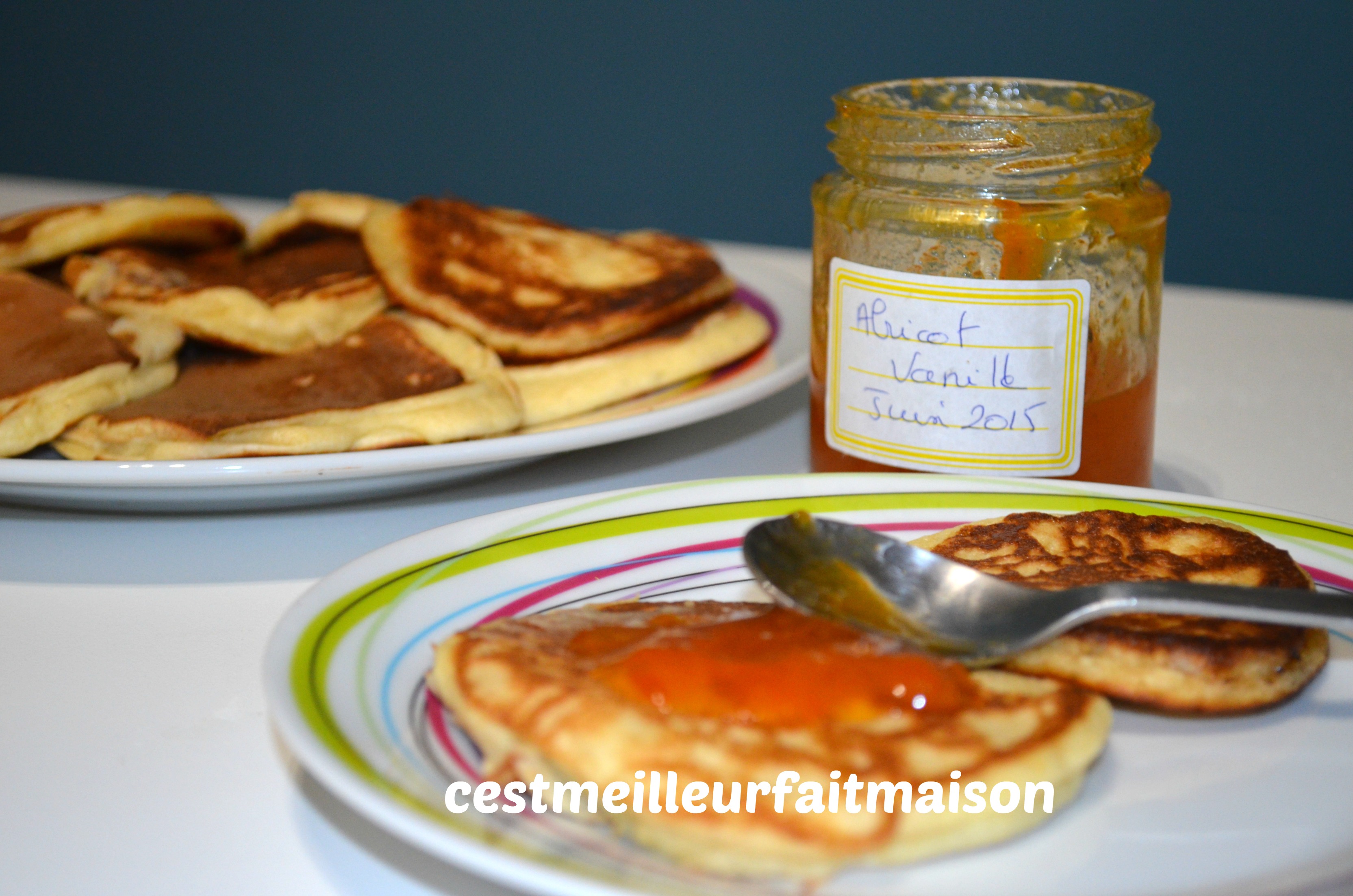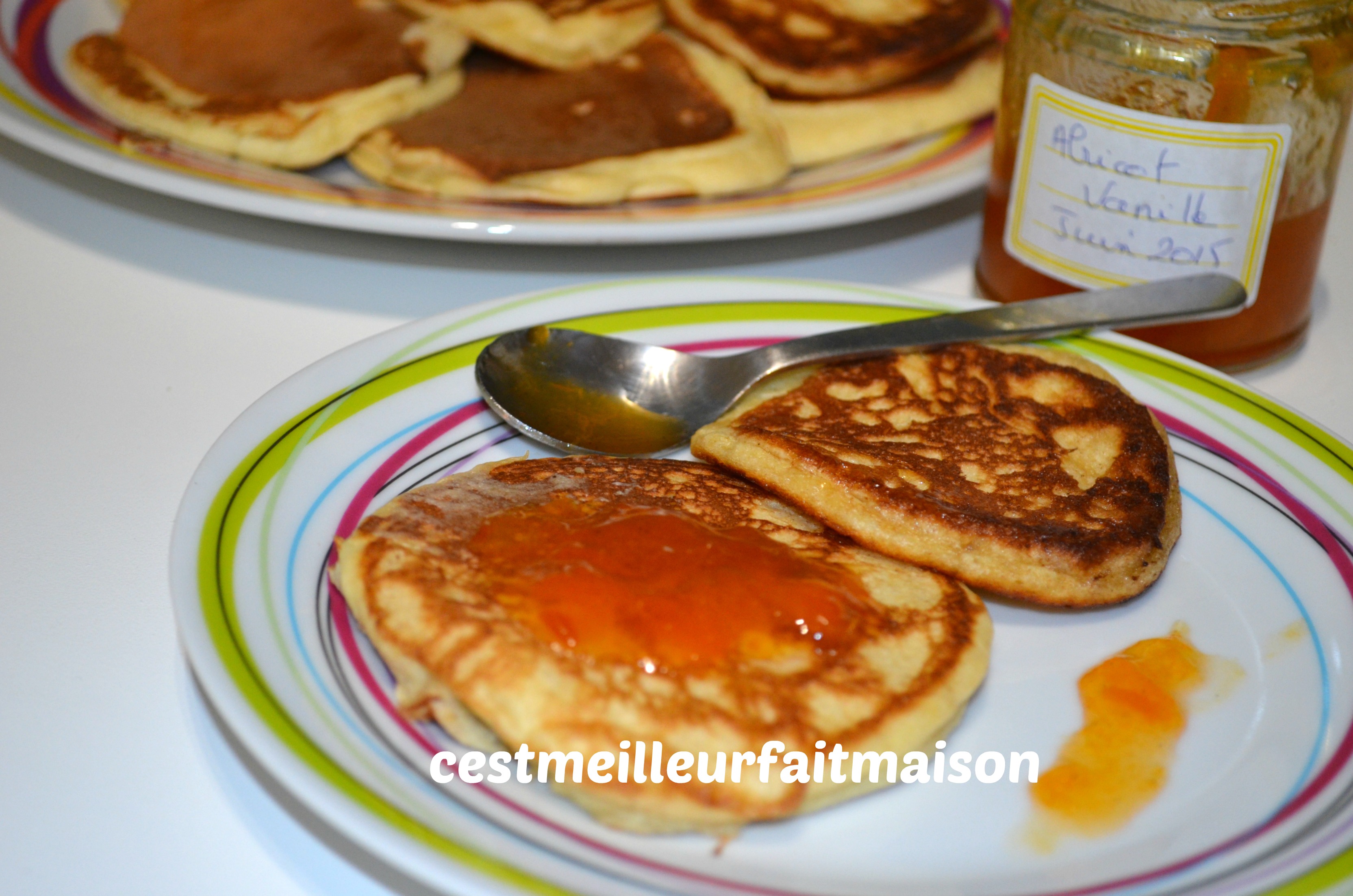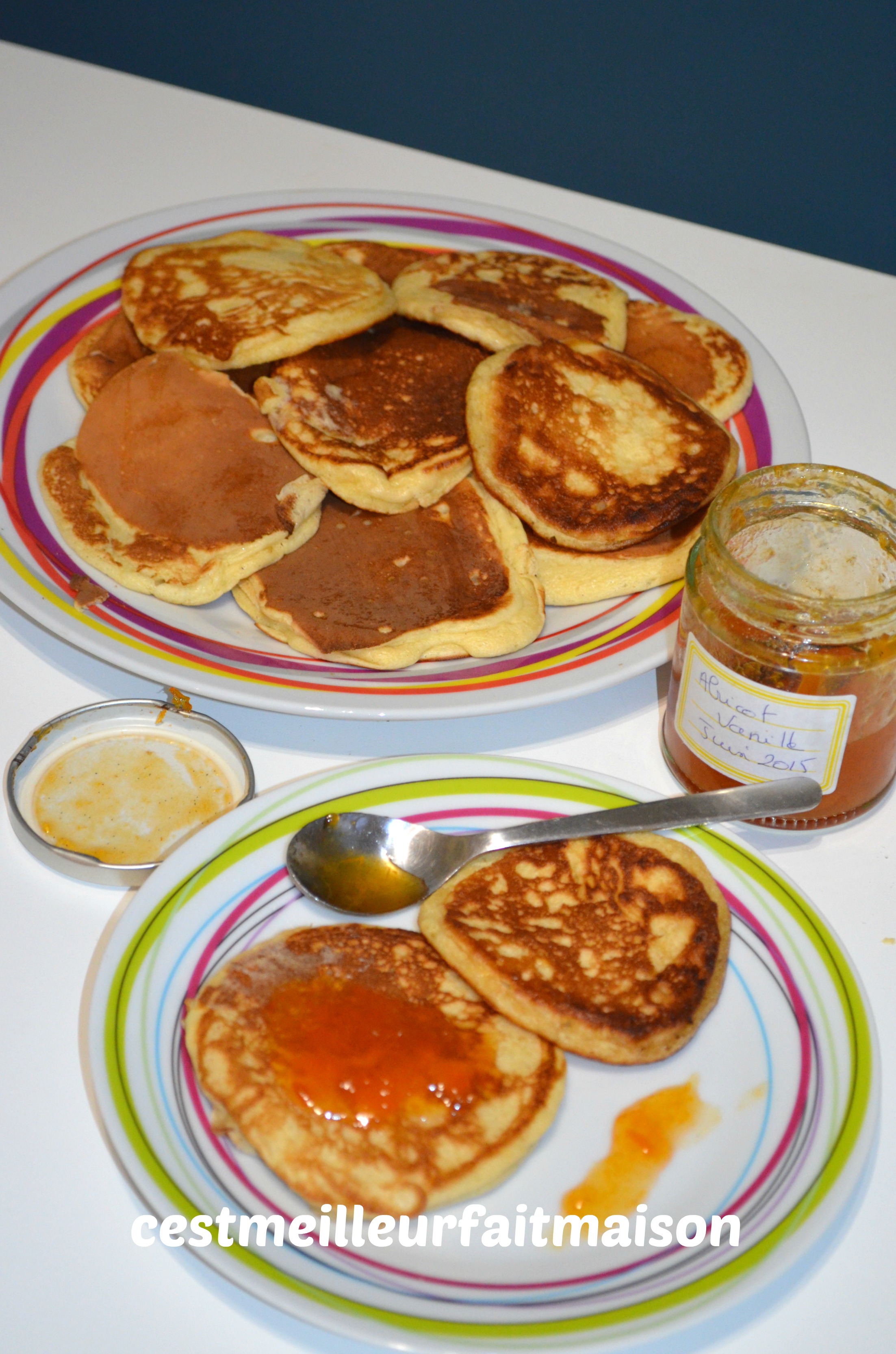 Cela faisait très longtemps que je ne faisais plus de pancakes. En fait, je les avais oubliés. Je les ai redécouvert dans le livre d’Hervé Cuisine et depuis j’en fais quasiment chaque mercredi matin pour le petit déjeuner, et parfois même le dimanche 🙂 . On peut les manger natures car ils sont sucrés et parfumés à la vanille, avec de la confiture ou avec du Nutella.