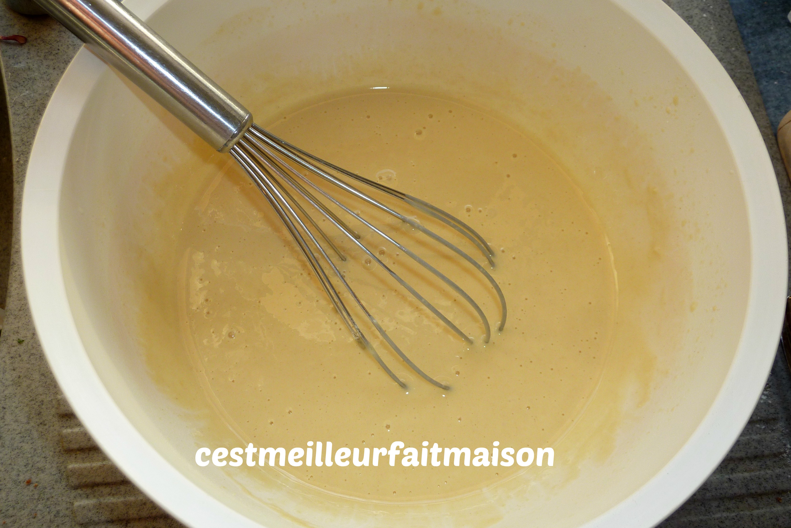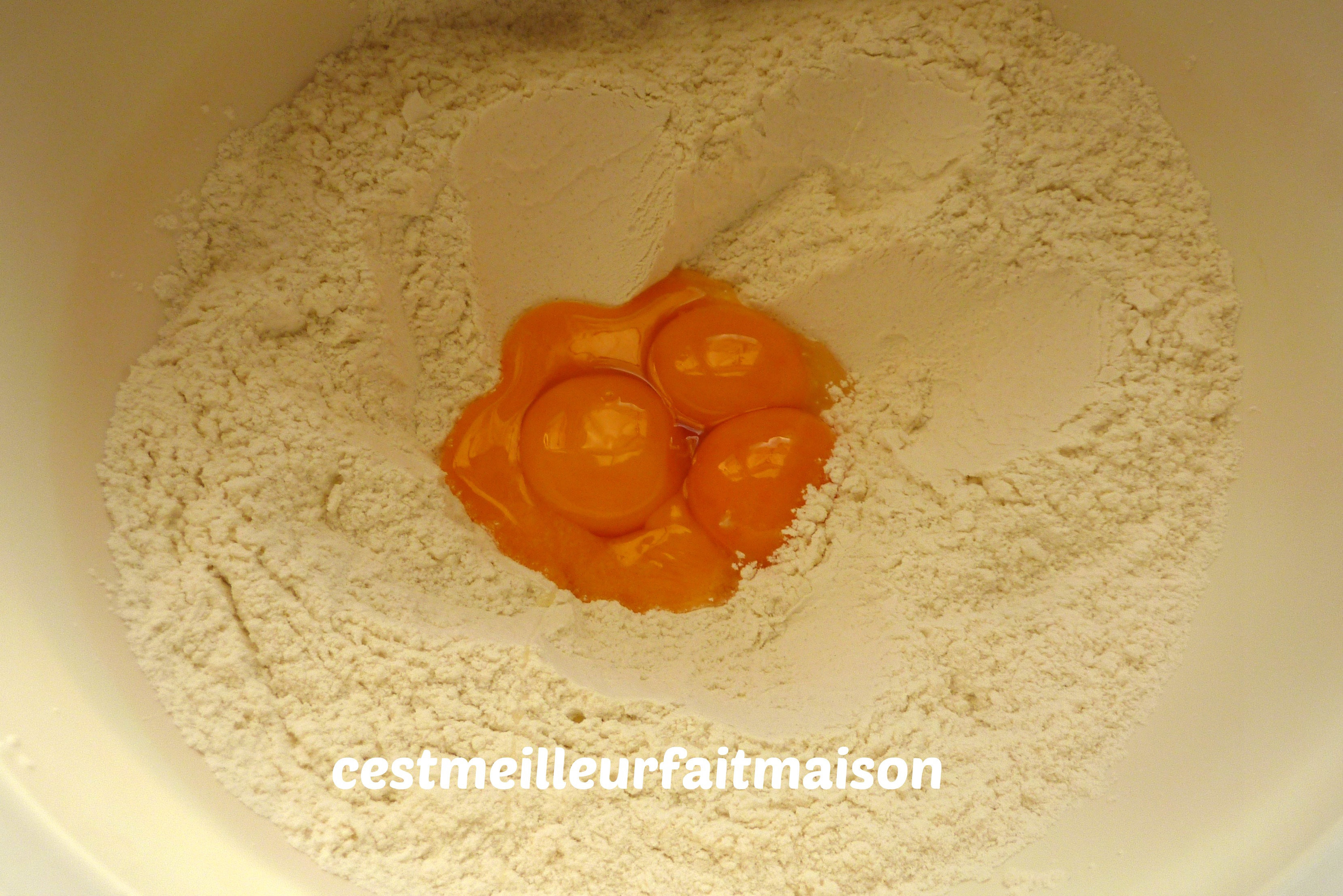 Faire un puits au centre du saladier et ajouter les jaunes d’œufs. Ajouter le lait en plusieurs fois et mélanger au fouet.