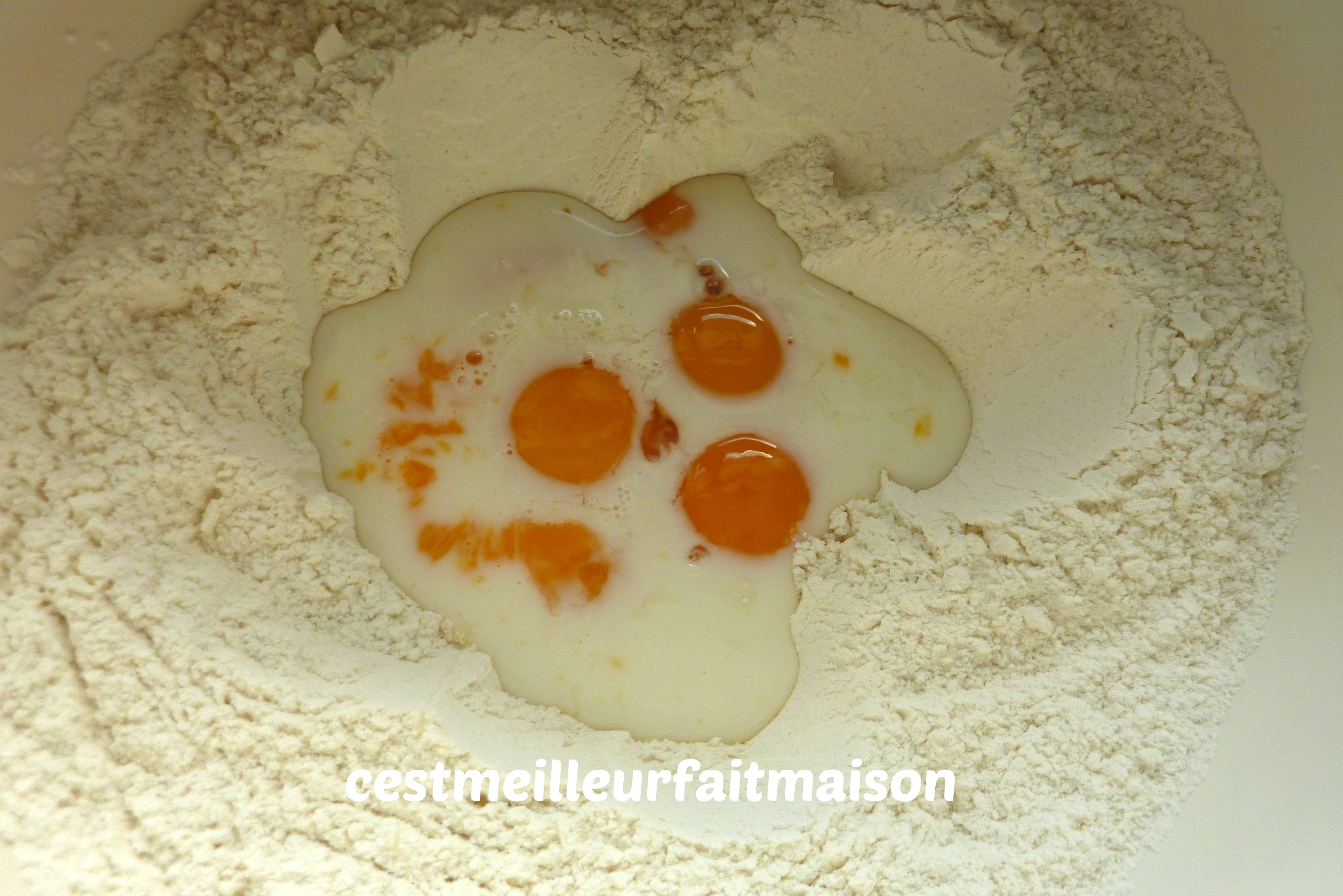 Faire un puits au centre du saladier et ajouter les jaunes d’œufs. Ajouter le lait en plusieurs fois et mélanger au fouet.