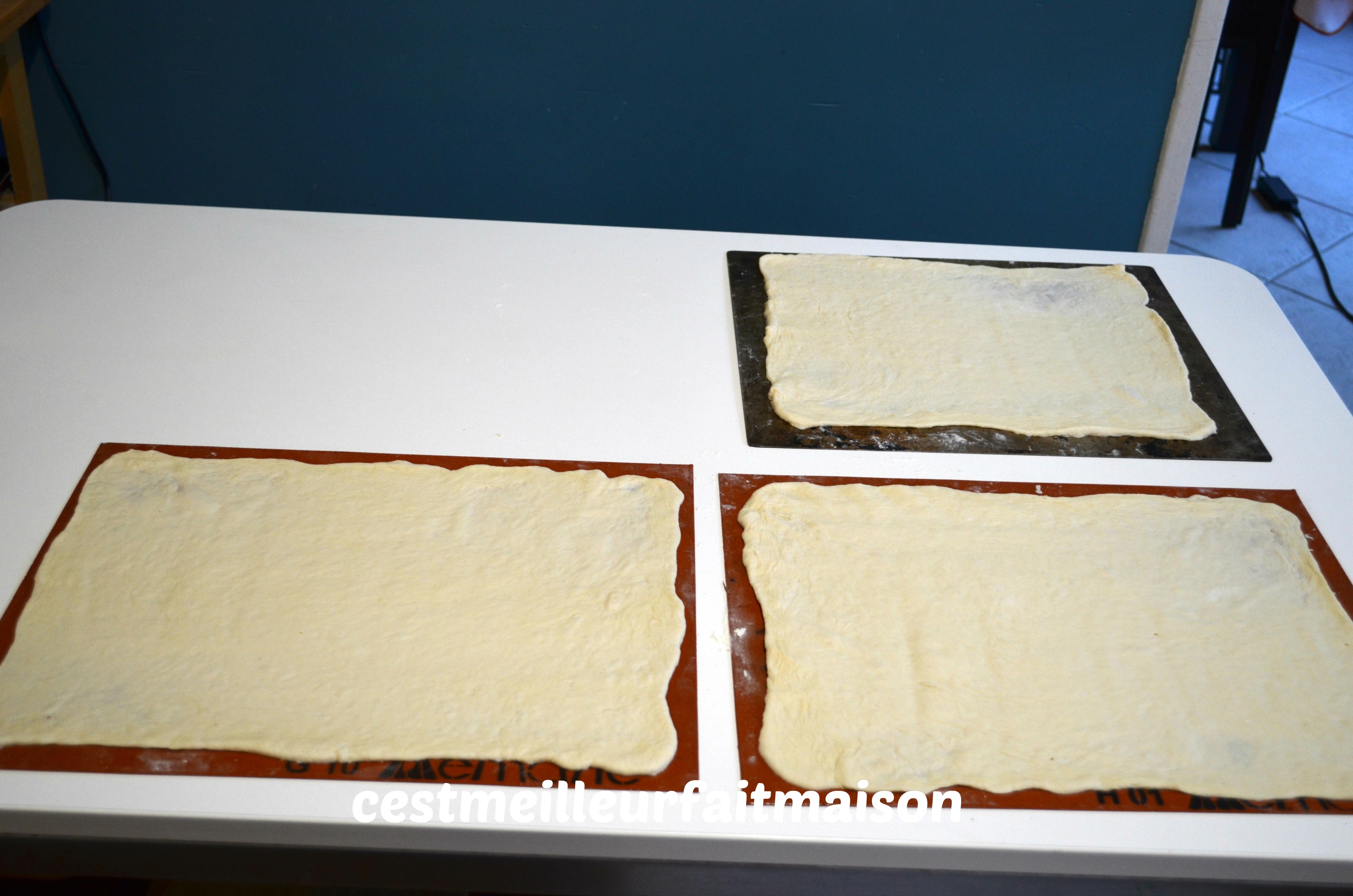 Dégazer la pâte et la diviser en fonction du nombre de pizza que l’on souhaite faire. J’en fais trois rectangulaires mais vous pouvez en faire des rondes individuelles. Étaler chaque pâton sur une toile Silpat farinée. J’ai choisi de l’étaler finement pour avoir une pâte croustillante.