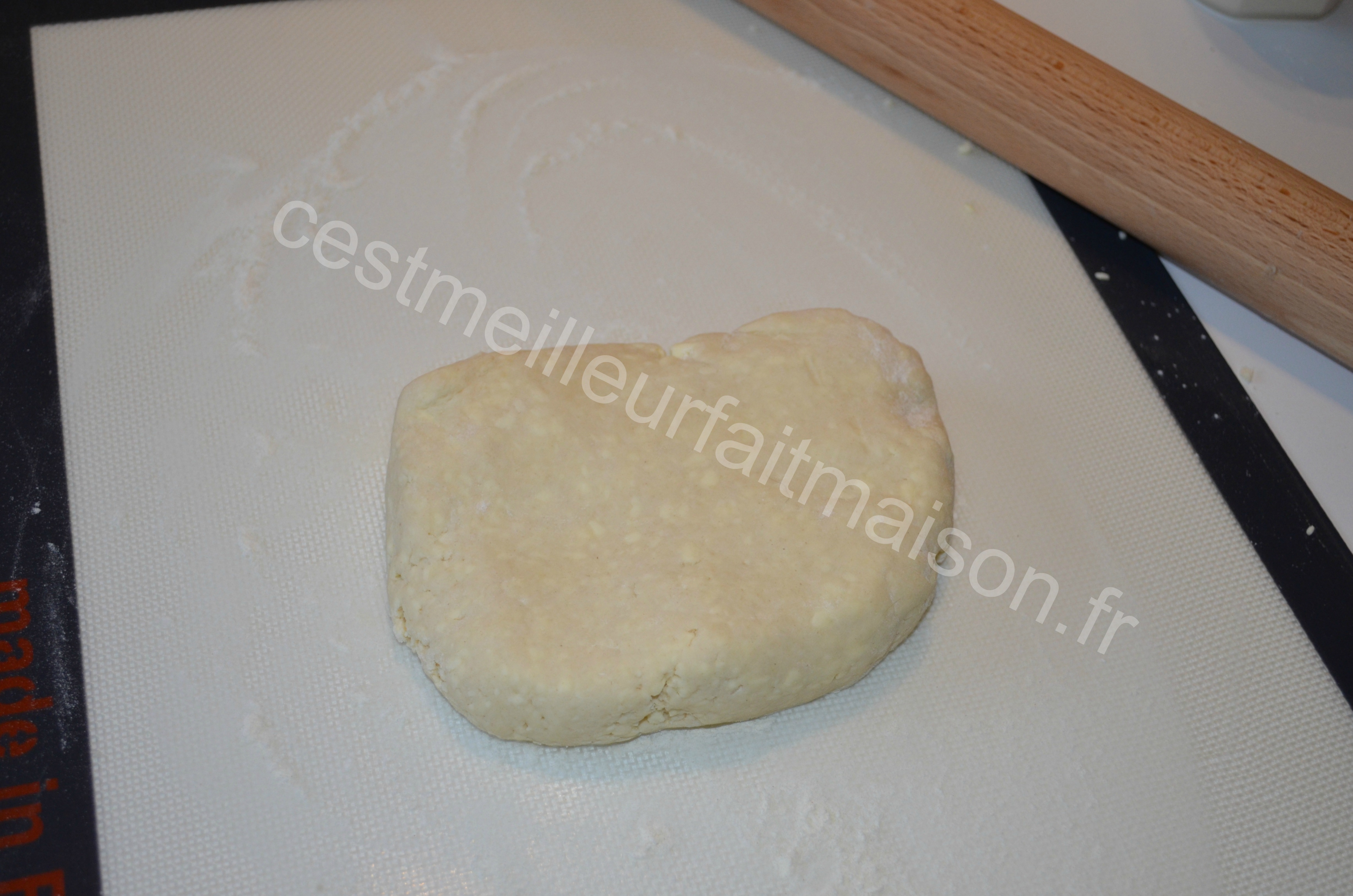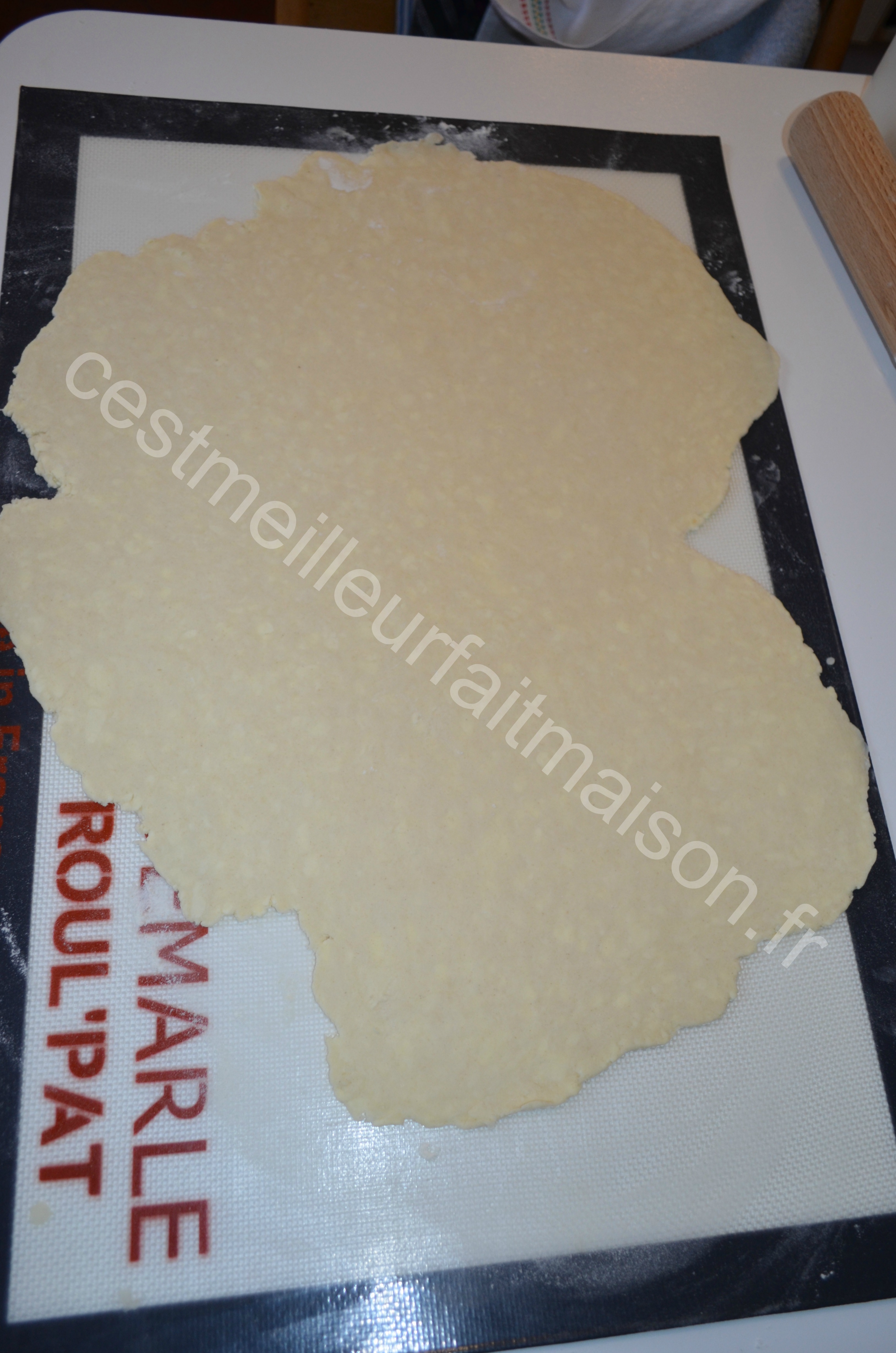 3- Verser le contenu du bol sur un plan de travail fariné (Roul’Pat pour moi) et mettre en boule. Etaler la pâte. La rouler en boudin puis sur elle-même afin de former un escargot. Filmer et mettre au congélateur 20 min si vous êtes pressée ou au réfrigérateur plusieurs heures.