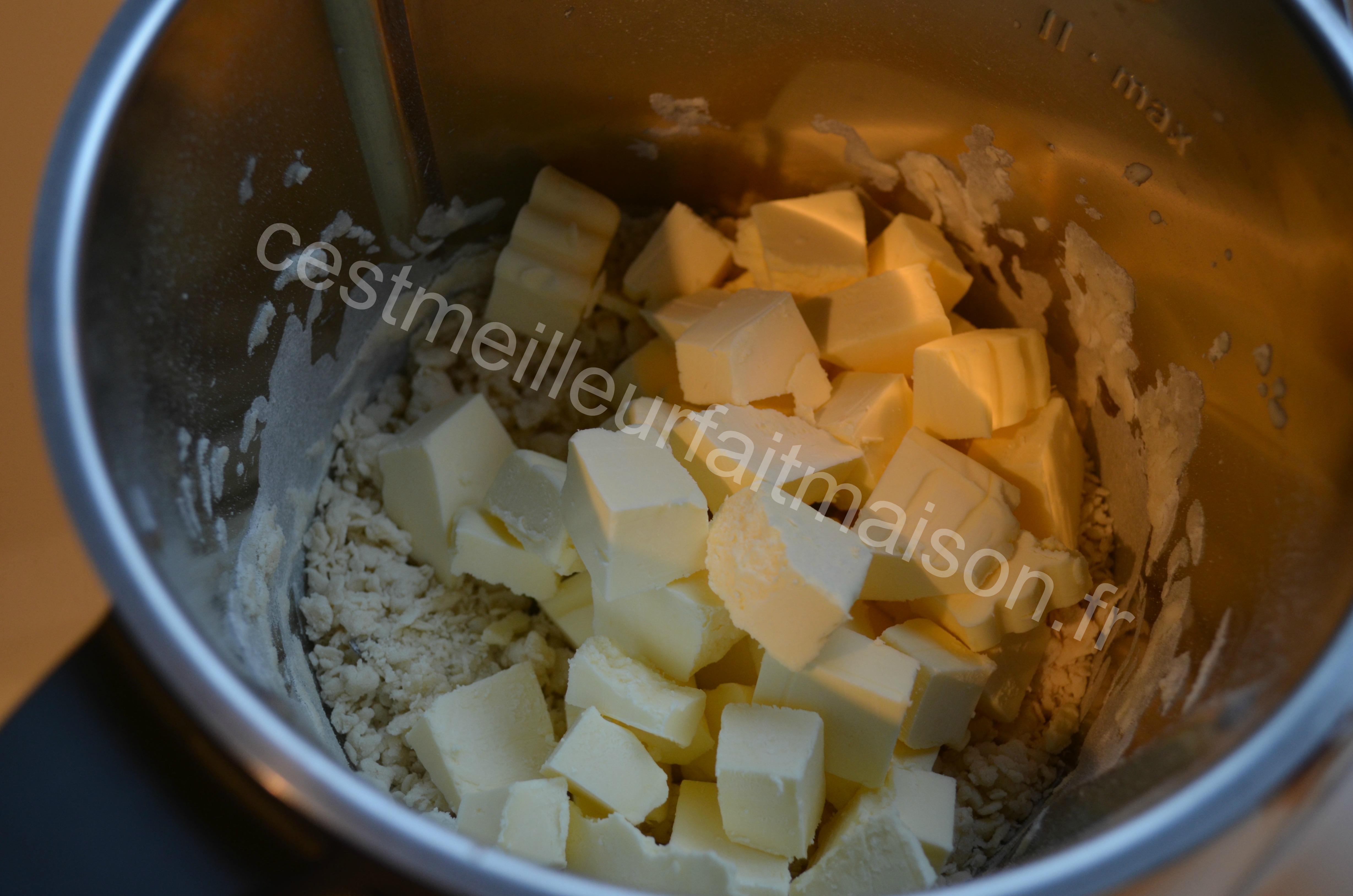 Cette façon de faire la pâte feuilletée n’est pas commune mais bien pratique. C’est rapide et très bon. La méthode que je vous donne n’est pas dans les livres Thermomix. Je l’ai toutefois apprise lors d’un cours de cuisine Thermomix. Je pense qu’elle apparaîtra dans leurs futurs livres de cuisine.