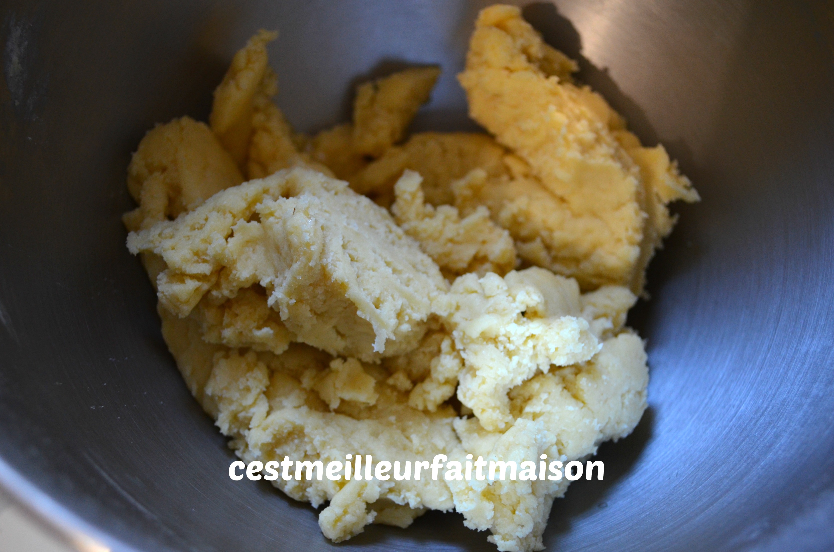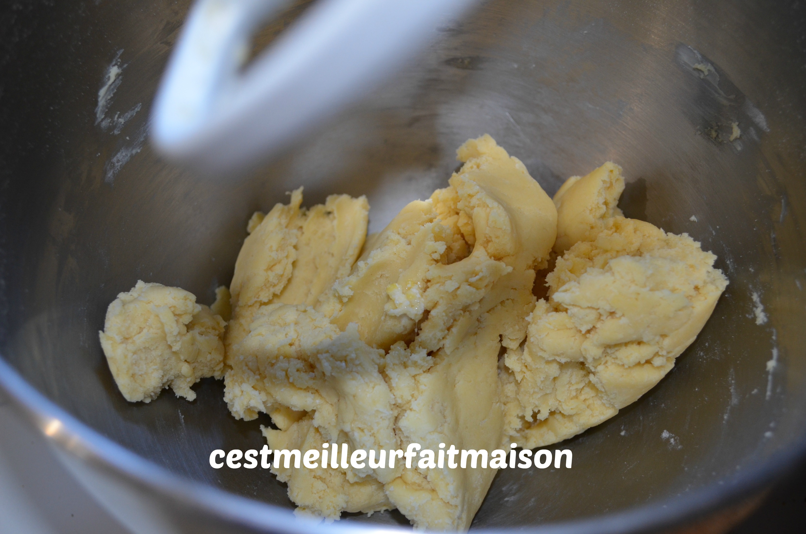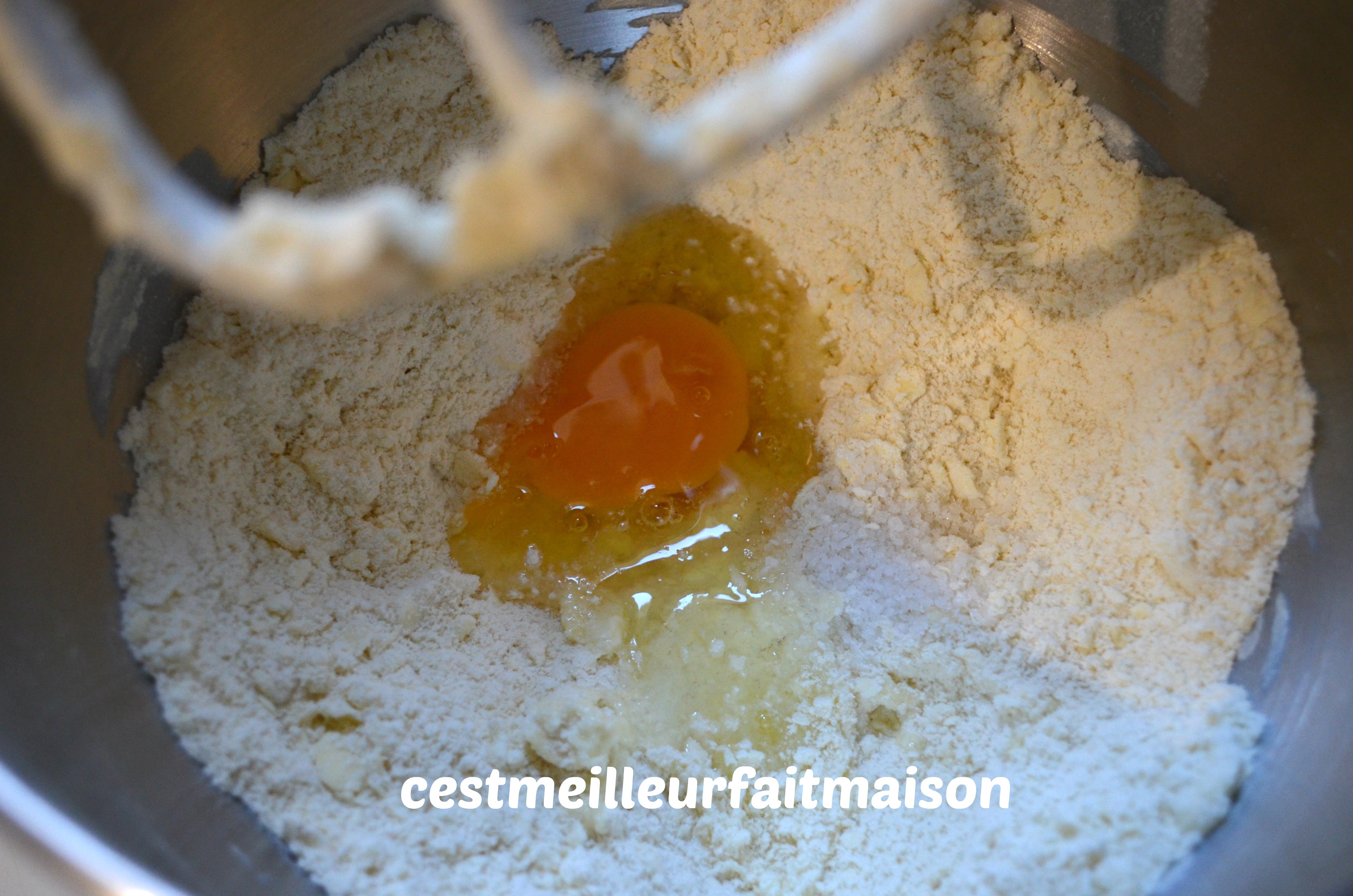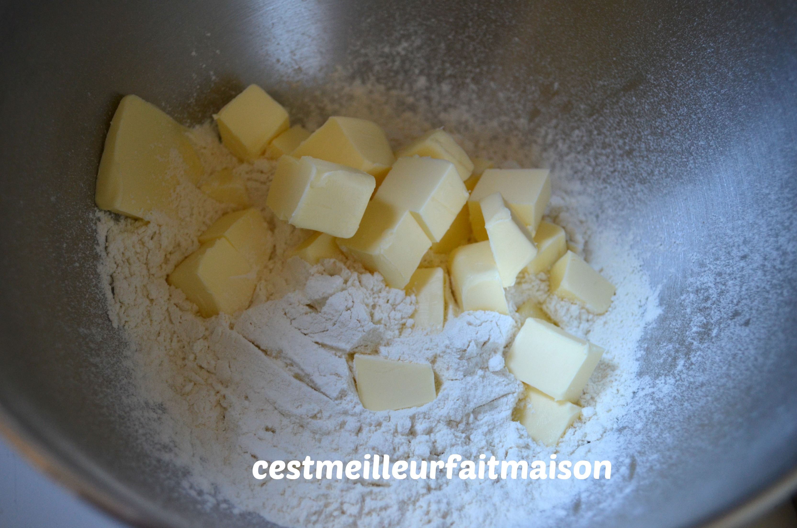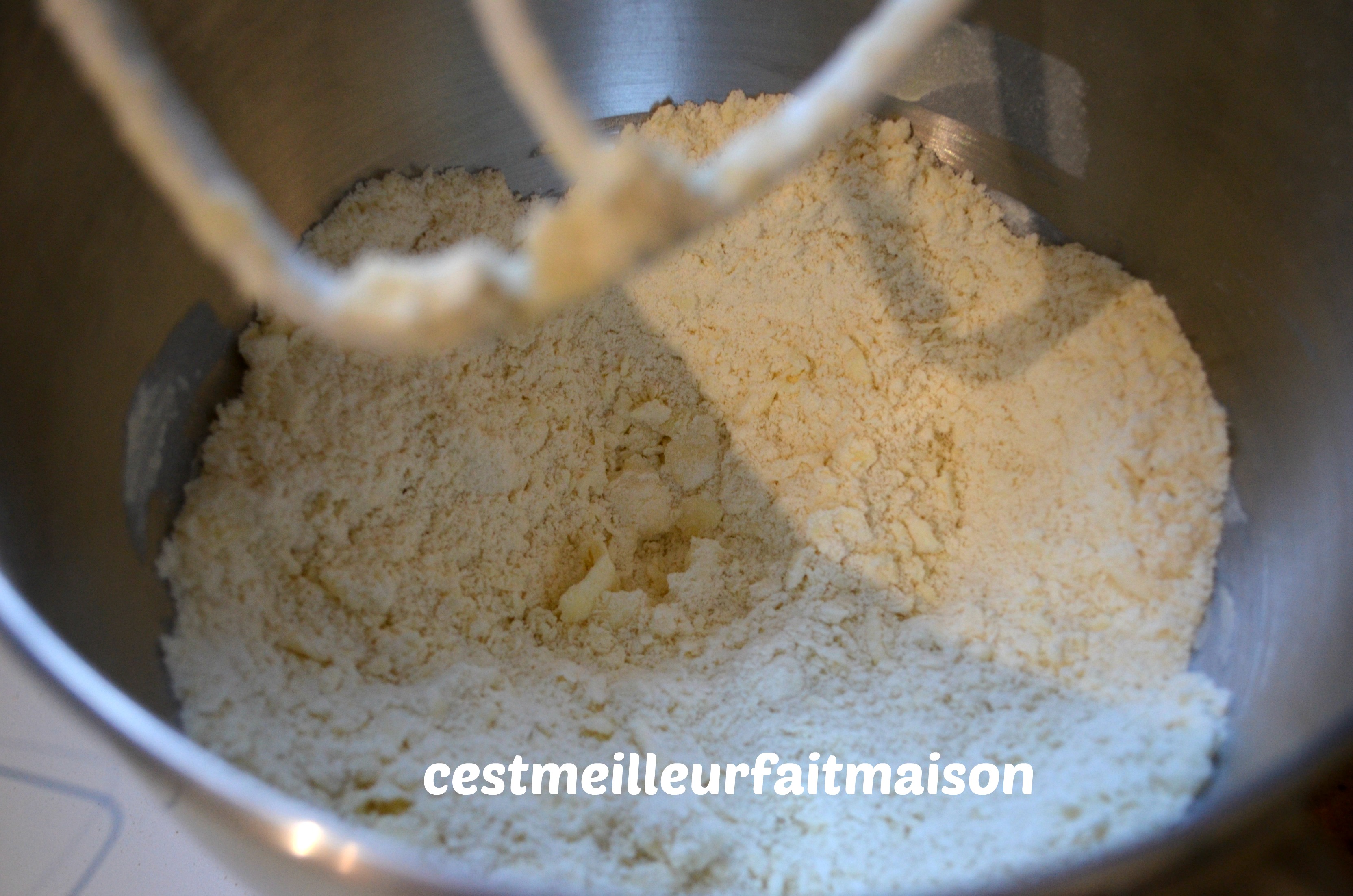 1- Tamiser la farine dans le bol du robot. Ajouter le beurre froid coupé en morceaux et mélanger avec la feuille afin d’obtenir une poudre.