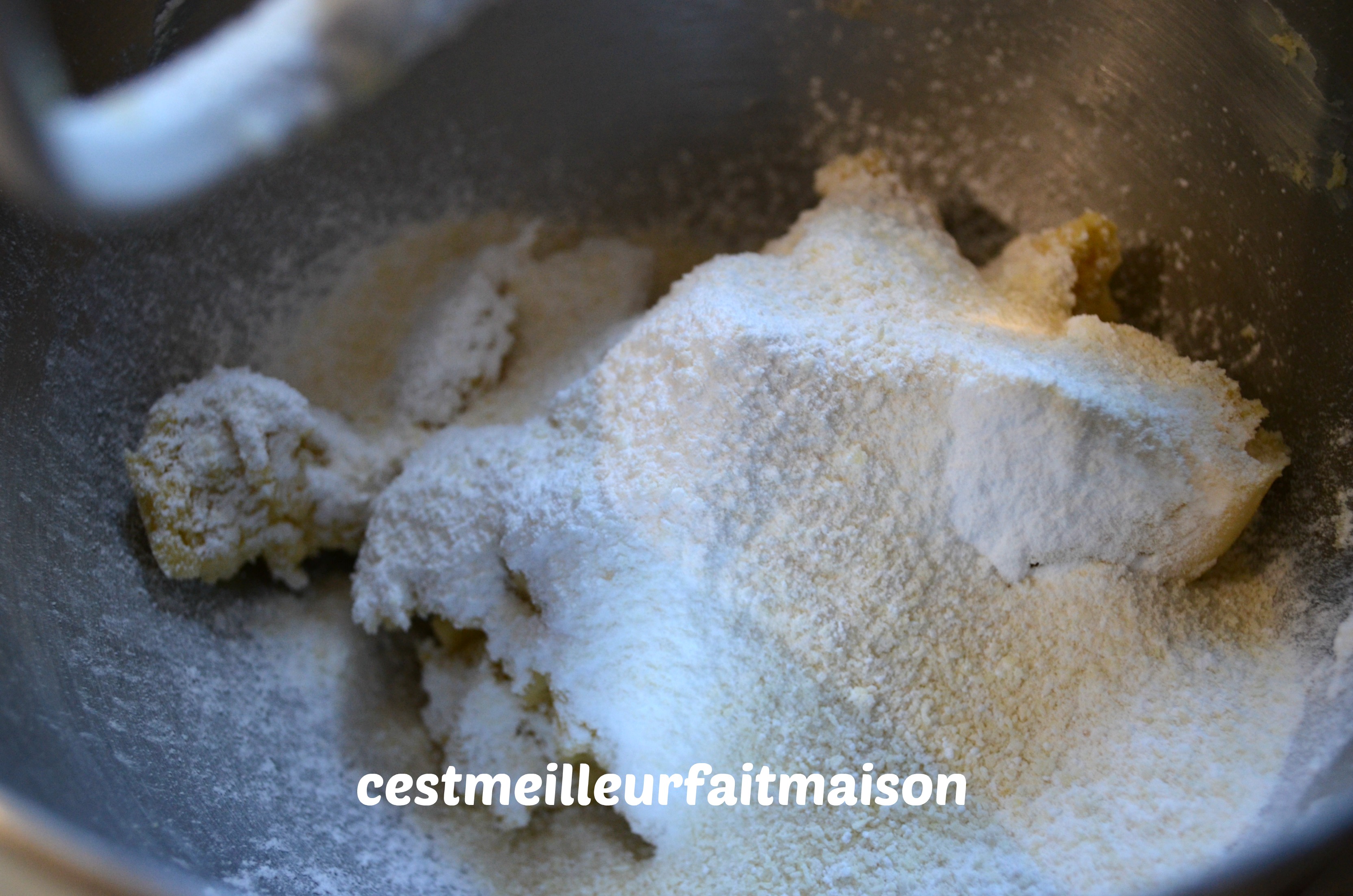 3- Incorporer le sucre glace et la poudre d’amandes préalablement tamisés.