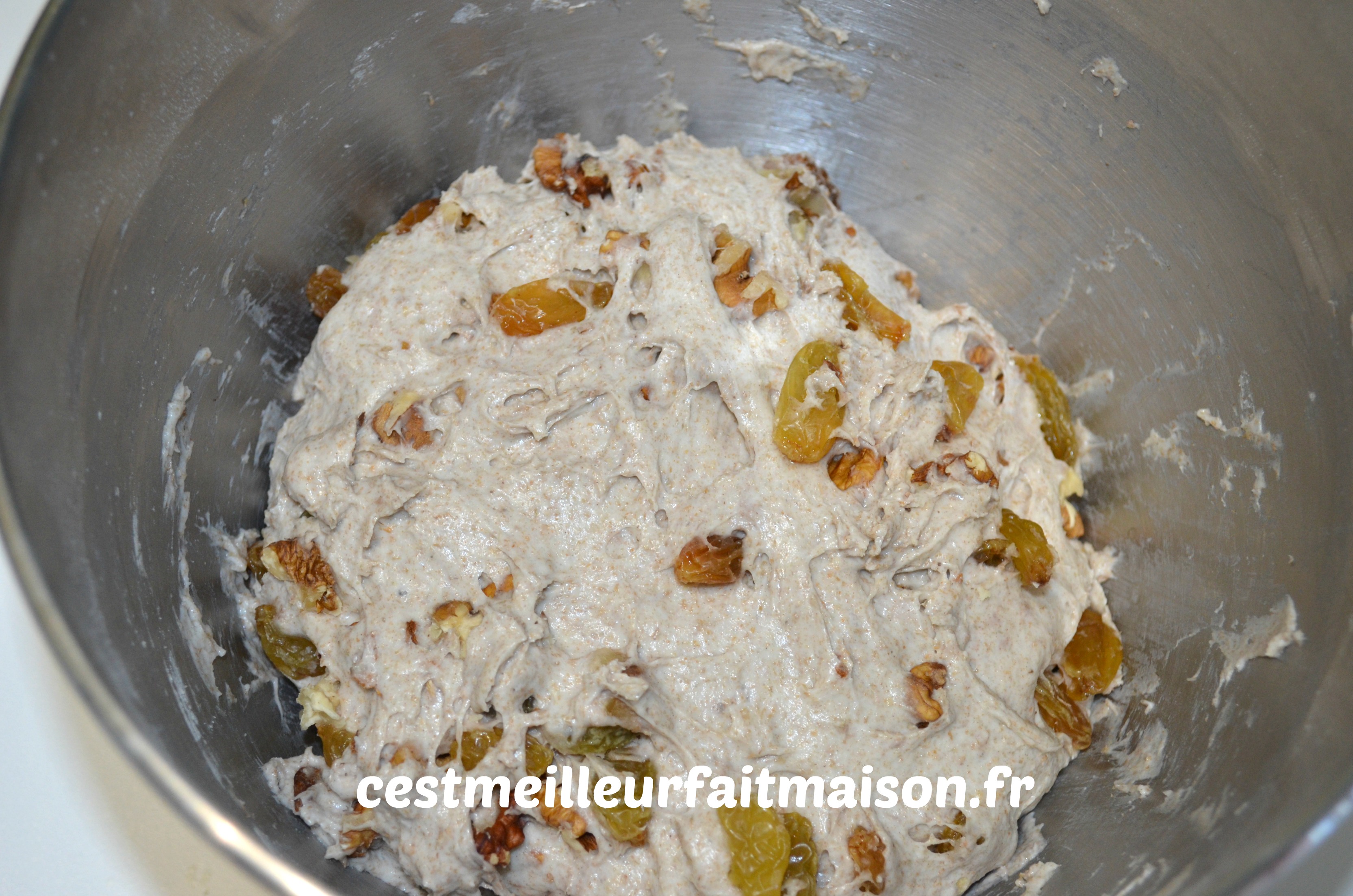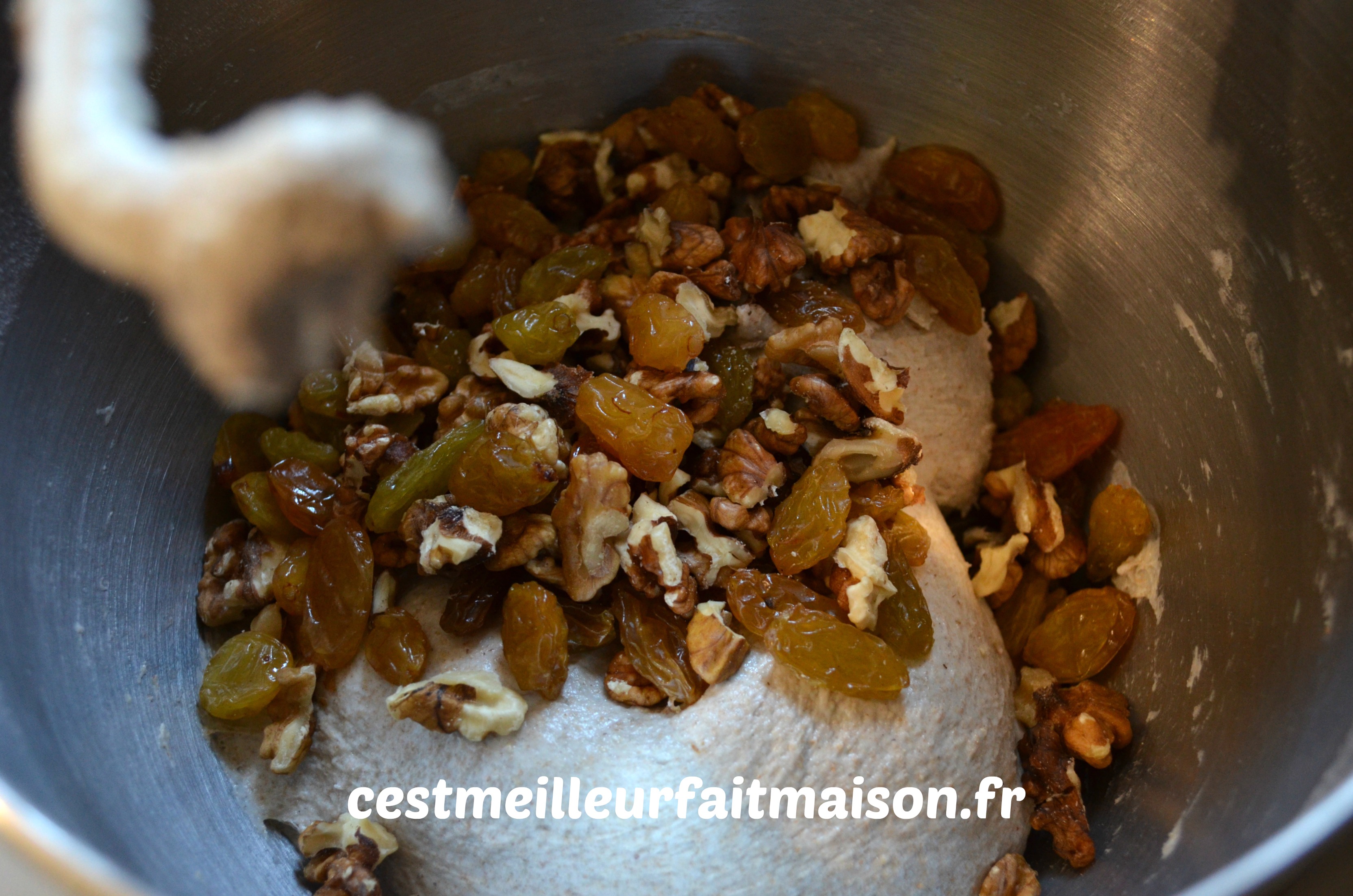 2- Dans le bol du robot, mettre les farines, l’eau, le levain liquide, la levure et le sel. Pétrir 6 min à vitesse lente et 2 min à vitesse rapide (Vit 1 et 2 avec le kitchenaid). A la fin du pétrissage, ajouter les noix et les raisins et mélanger.