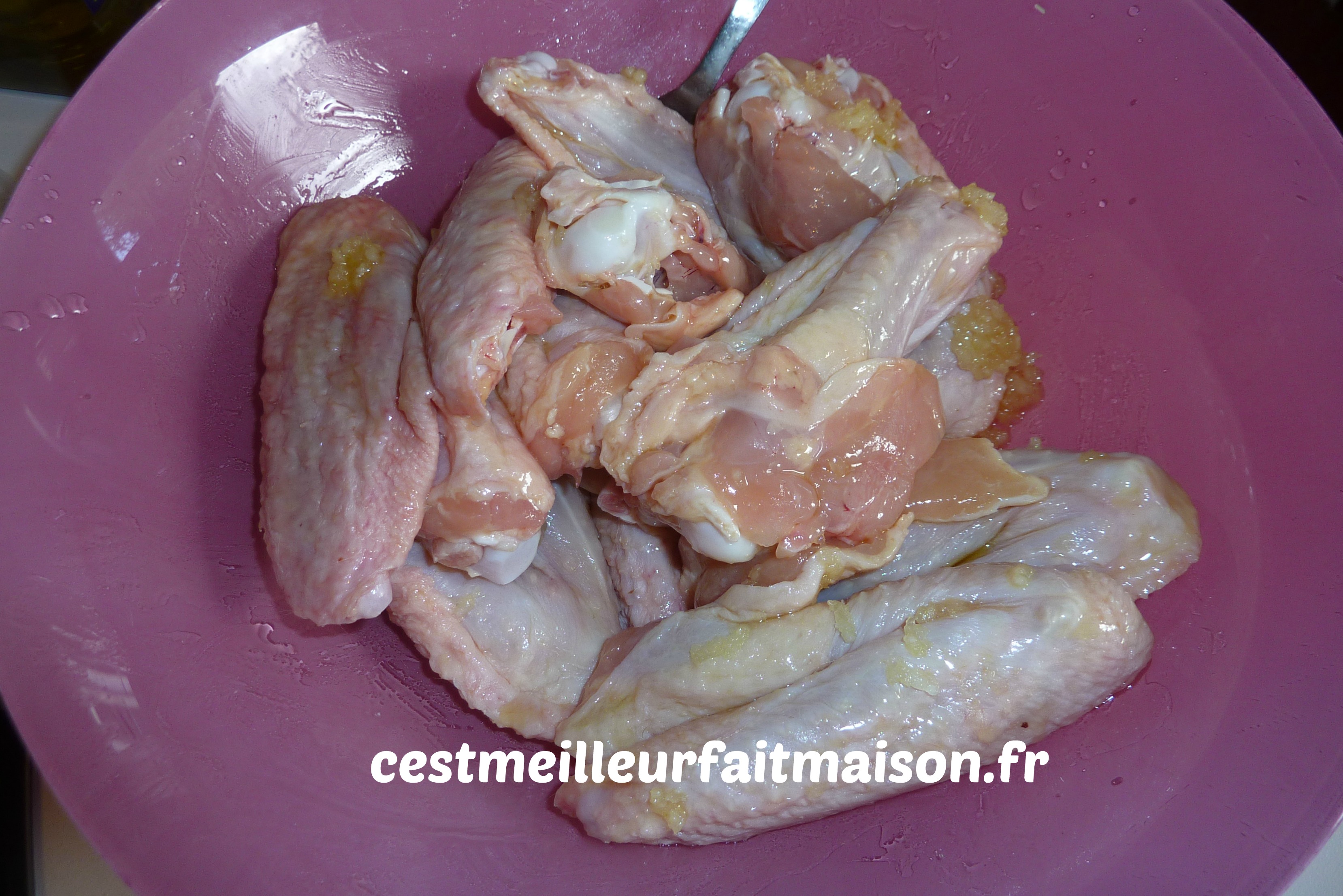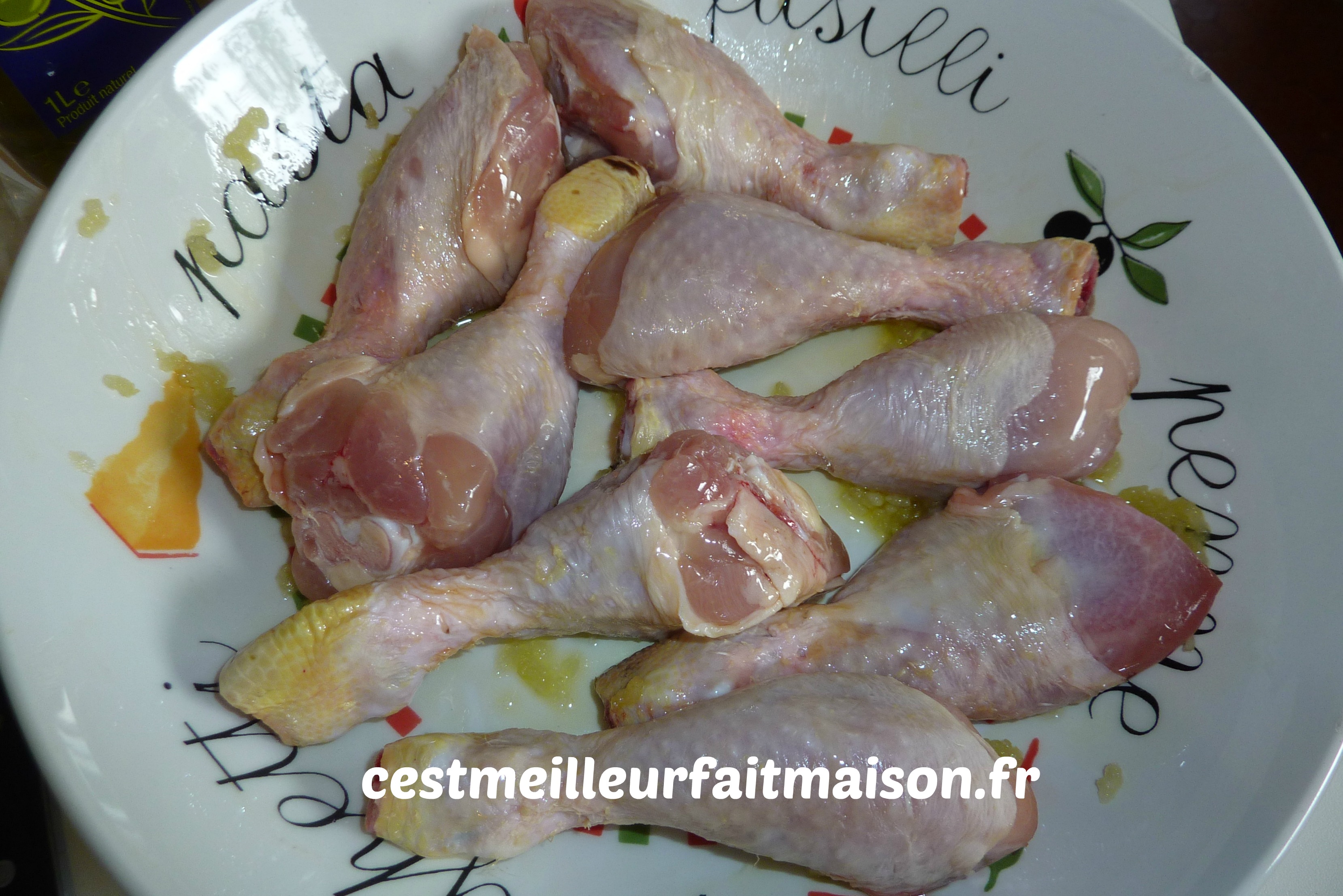 Préparer deux plats creux (un pour les pilons et un pour les ailes) avec de l’huile d’olive et de l’ail pressé. Imprégner le poulet de ce mélange et laisser mariner une heure en remuant de temps en temps.