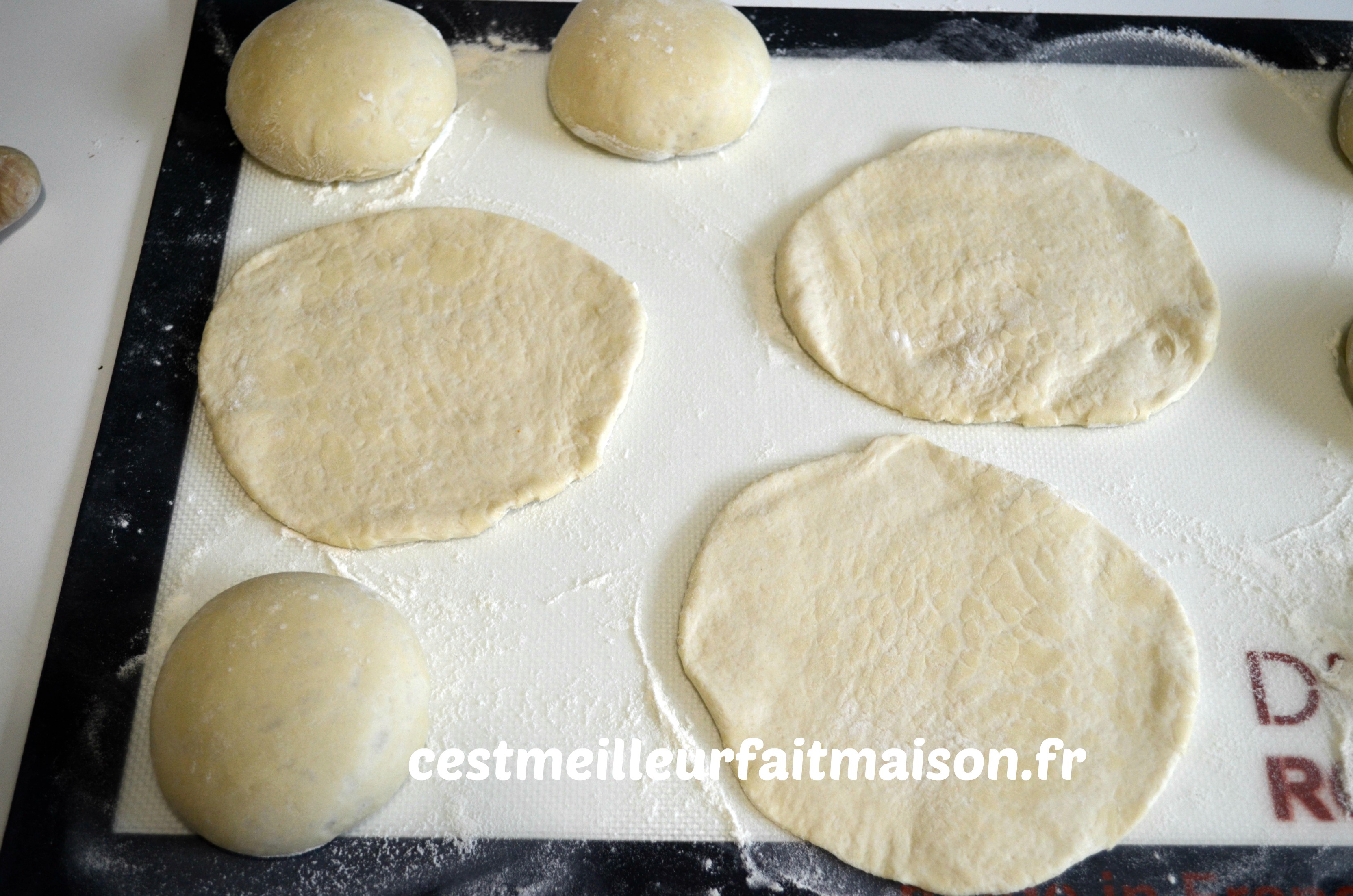 6- A l’aide d’un rouleau à pâtisserie, étaler les boules de pâte 3 par 3. Les pitas doivent avoir une épaisseur de 3 ou 4 mm. Avec une spatule, disposer les pitas sur la plaque chaude et les cuire 6 à 7 min.