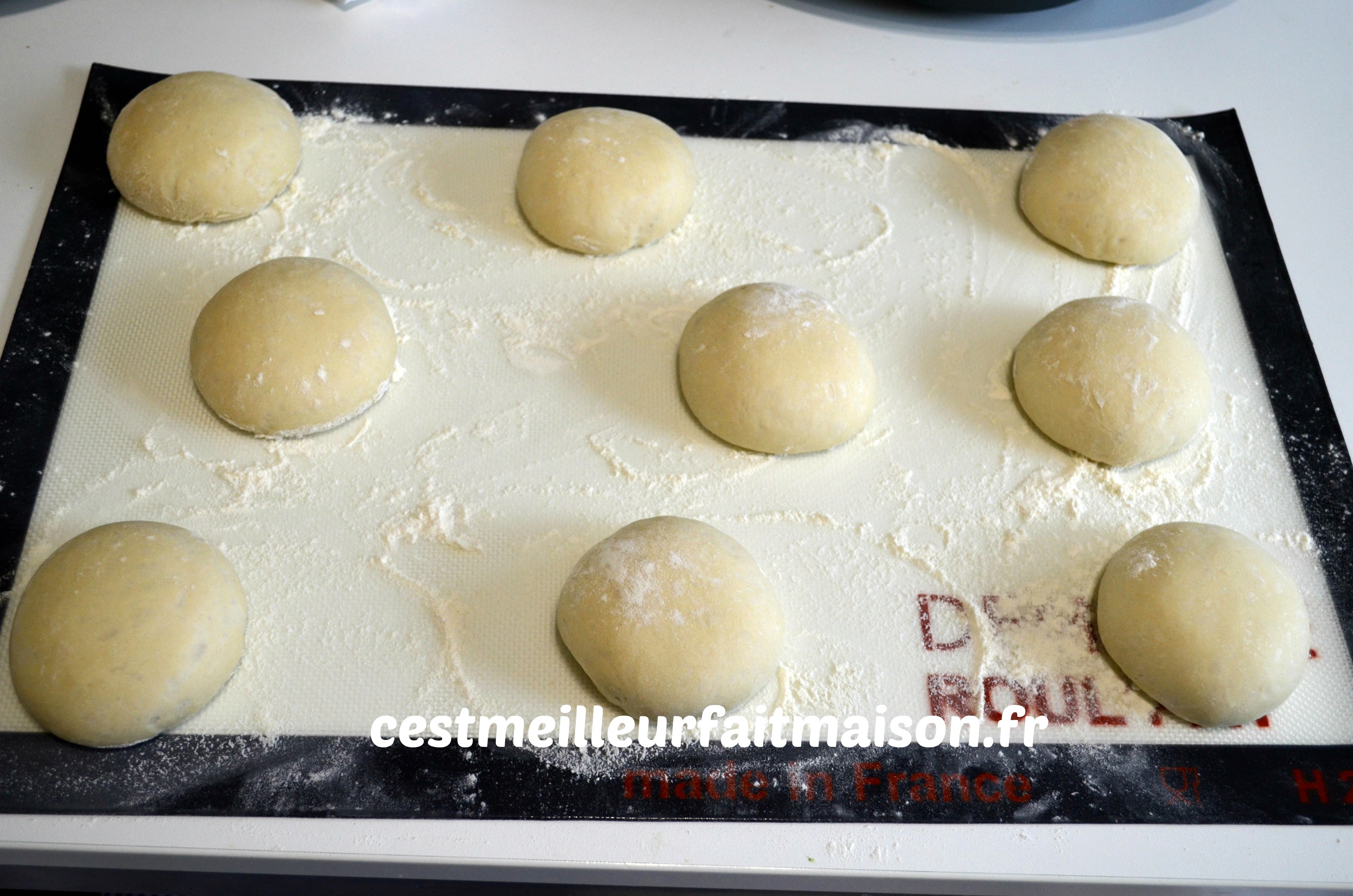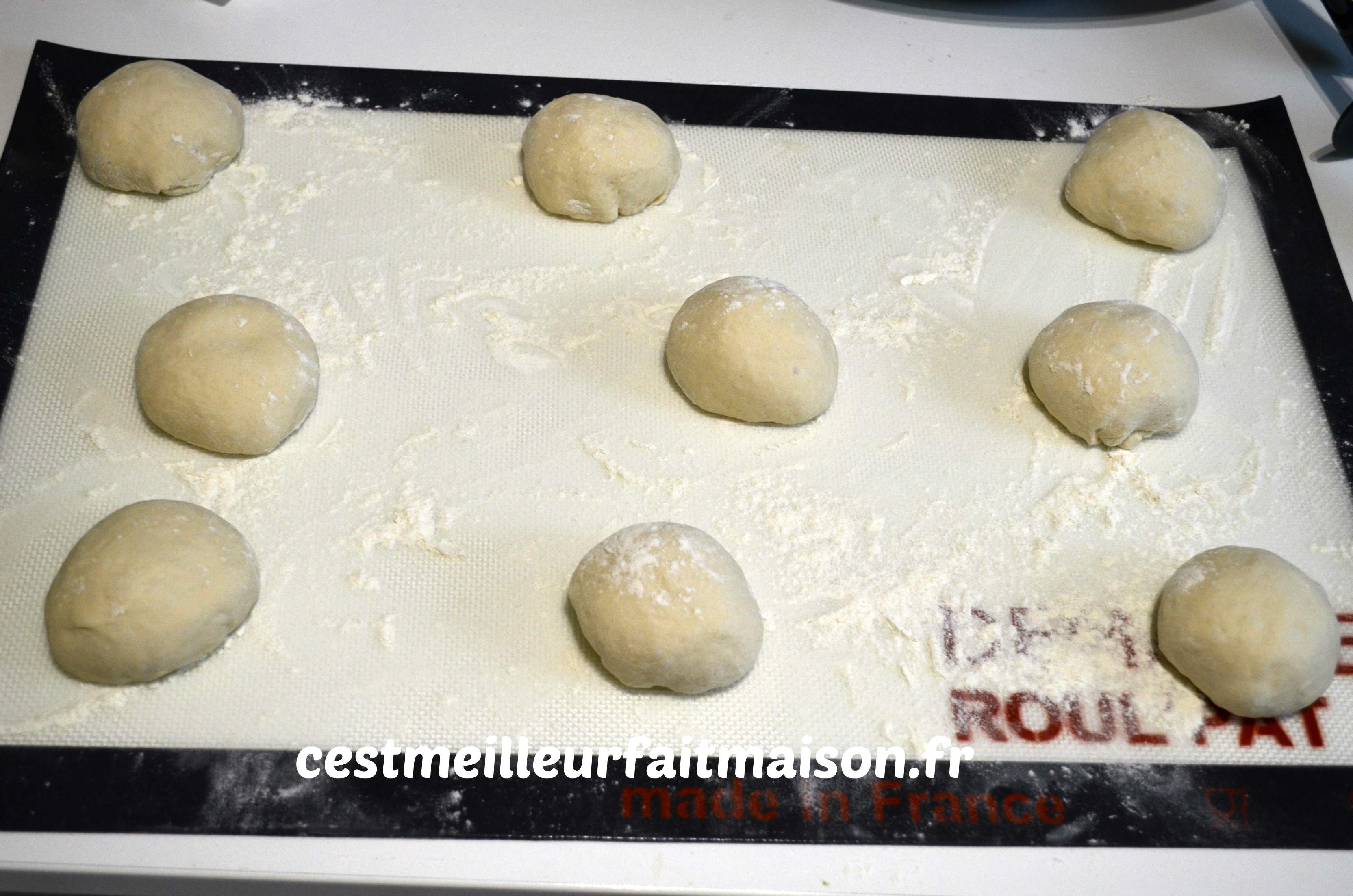 4- Dégazer la pâte et la peser. La diviser en 9 pâtons. Les bouler et les poser sur un plat de travail très fariné. Laisser les pâtons reposer 30 min.