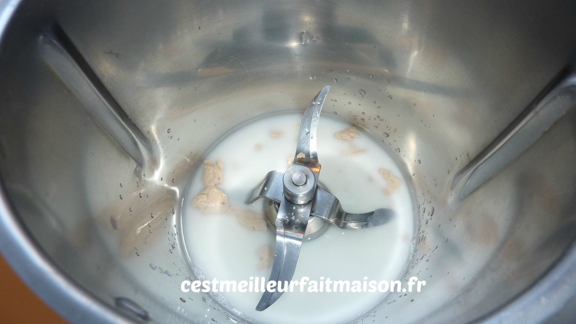 1- Mettre dans le bol du Thermomix la levure, 50g d’eau et 50 g de lait. Programmer 1.30 min/37°C/Vit 2.