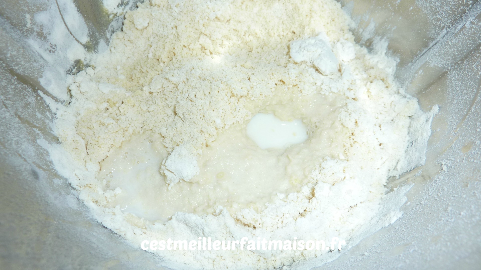 2- Ajouter la farine, l’huile et le sel. Pétrir 1 min.
