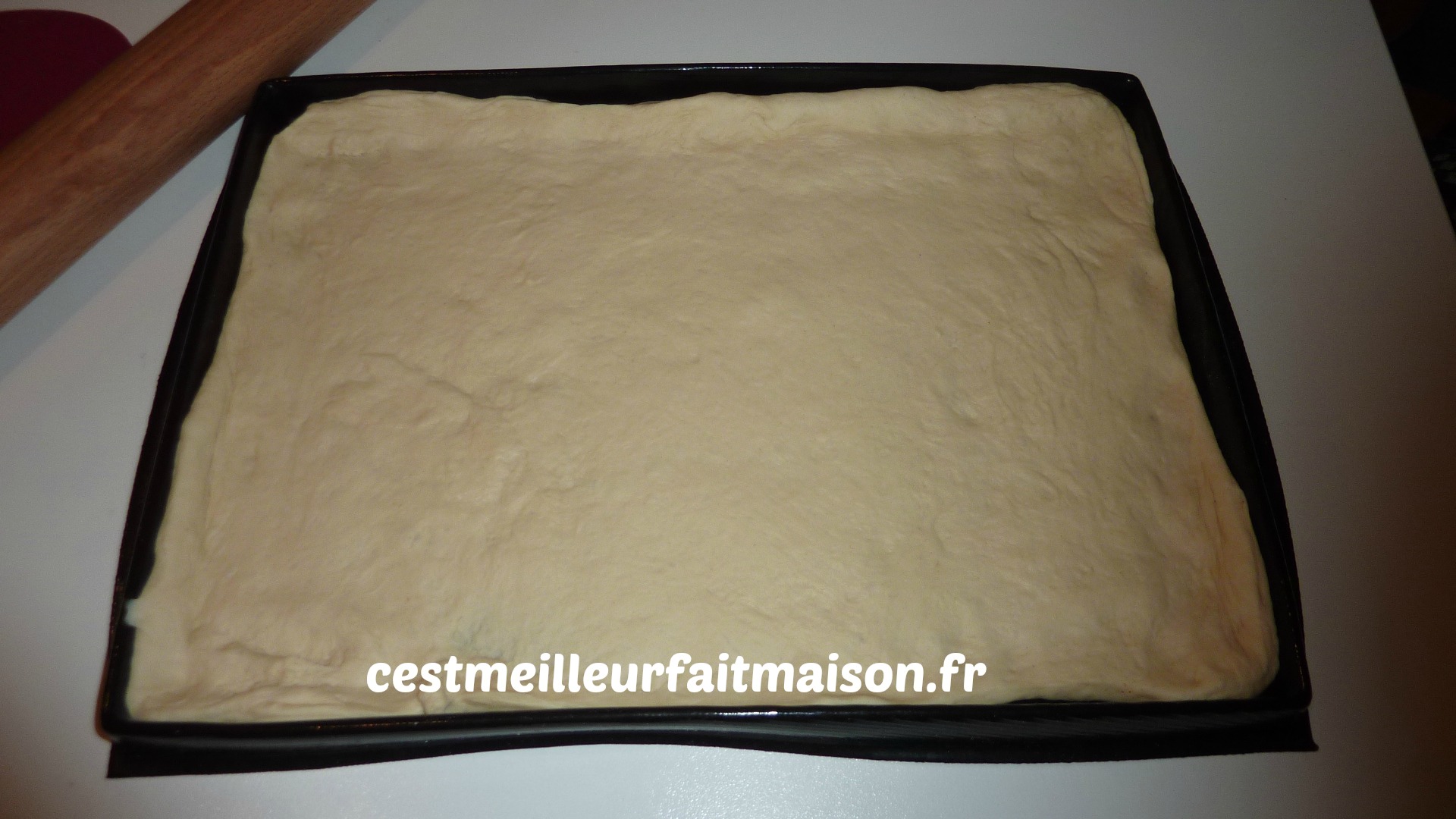 4- Dégazer la pâte et l’étaler dans un moule rectangulaire ( Flexipan plat pour moi). Parfois j’arrive à l’étaler en l’étirant à la main et parfois la pâte ne veut rien savoir, je suis donc obligée d’utiliser le rouleau.