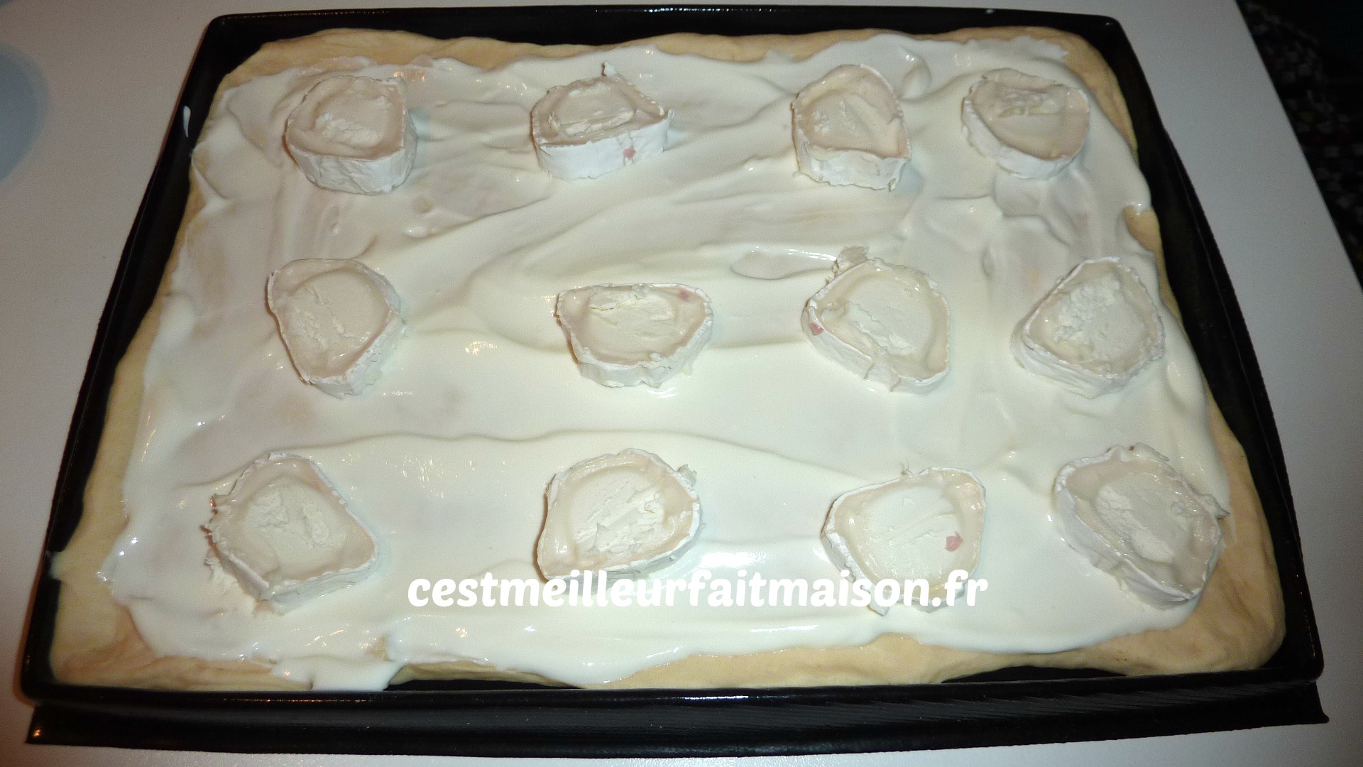 Mélanger dans un bol la crème fraîche, le fromage blanc et le St Môret. Ajouter un peu de sel (pas trop car les fromages sont salés). Etaler cette préparation sur la pâte. Ajouter des rondelles de chèvre et l’emmental râpé.