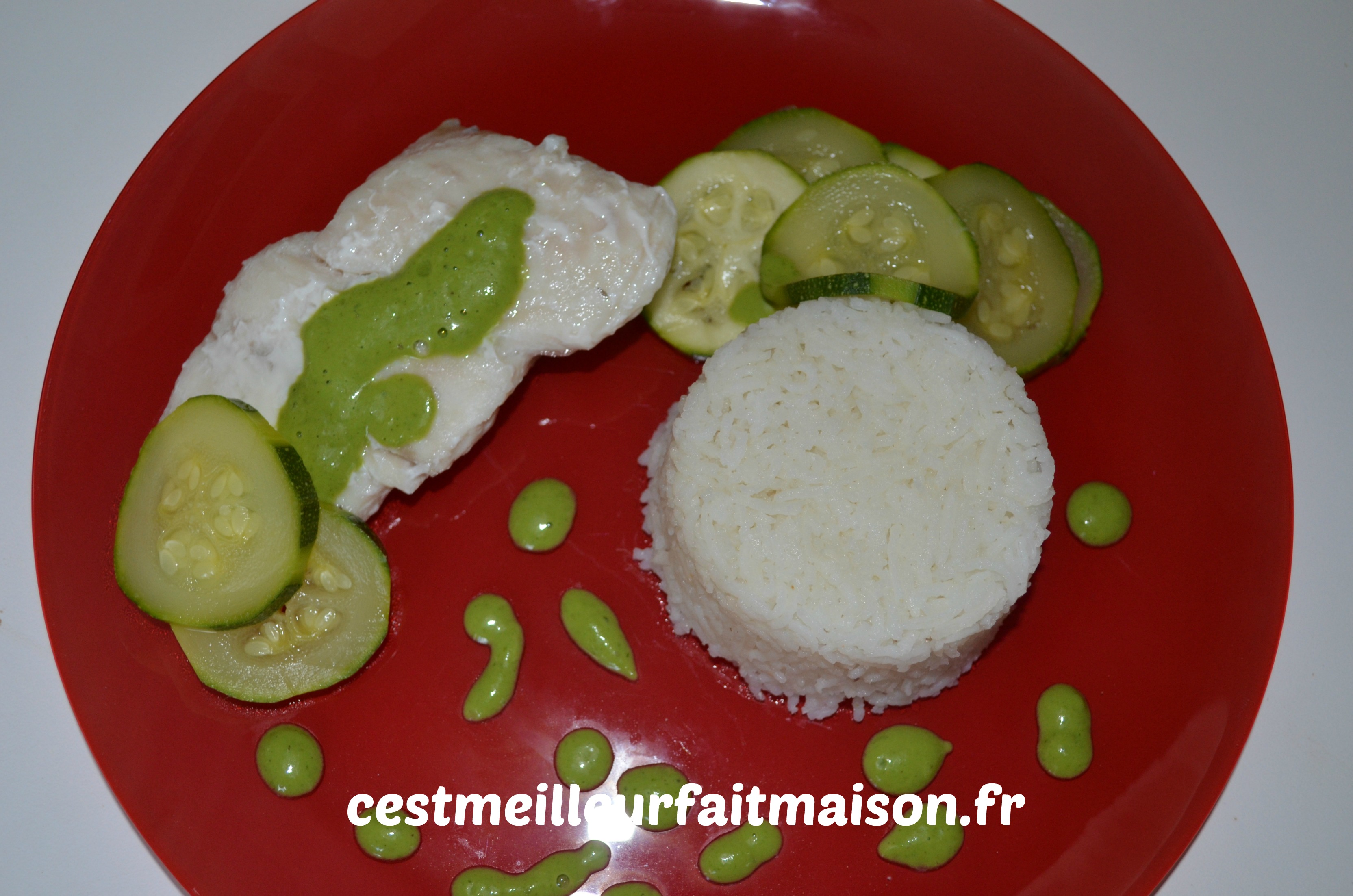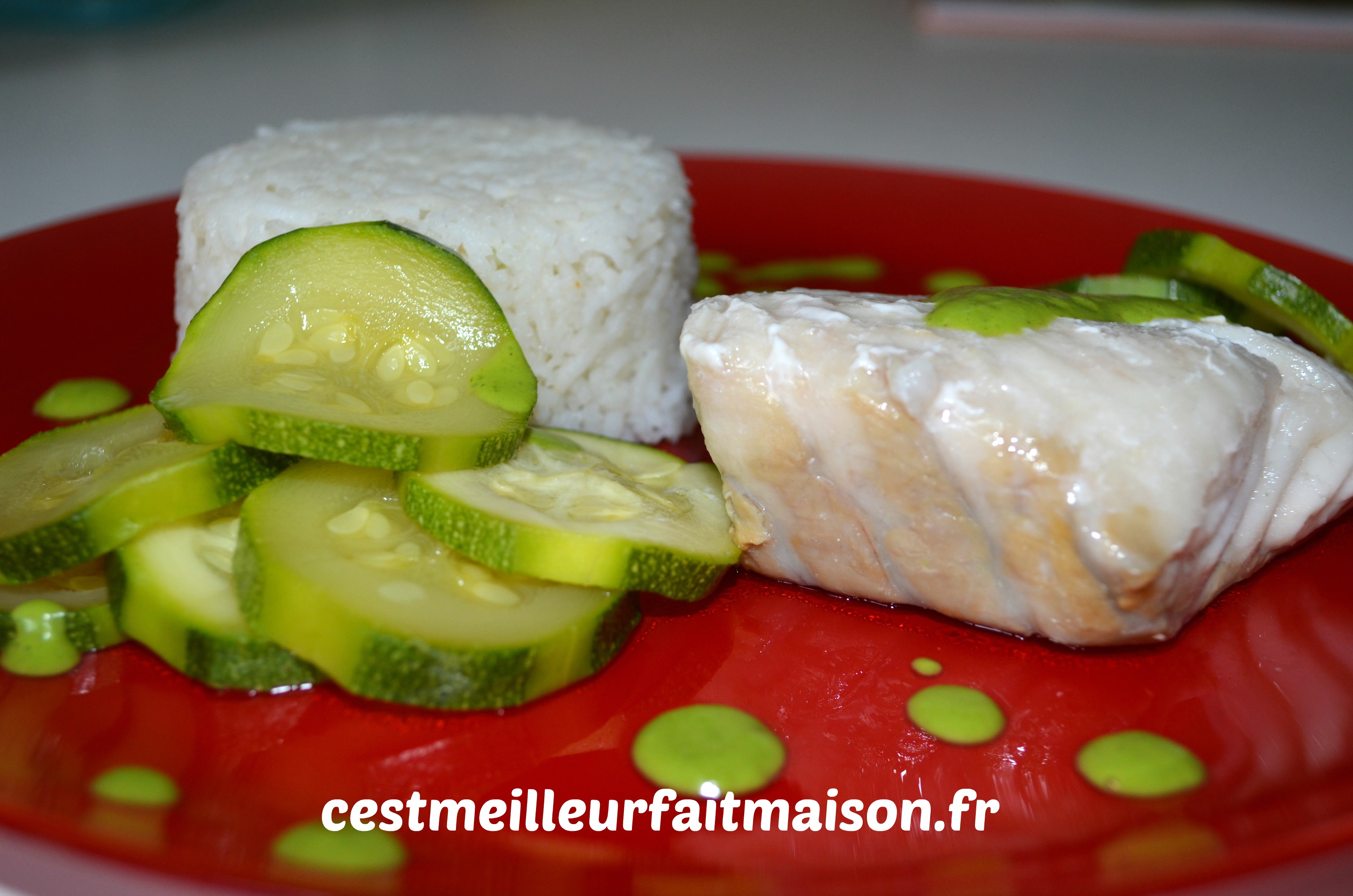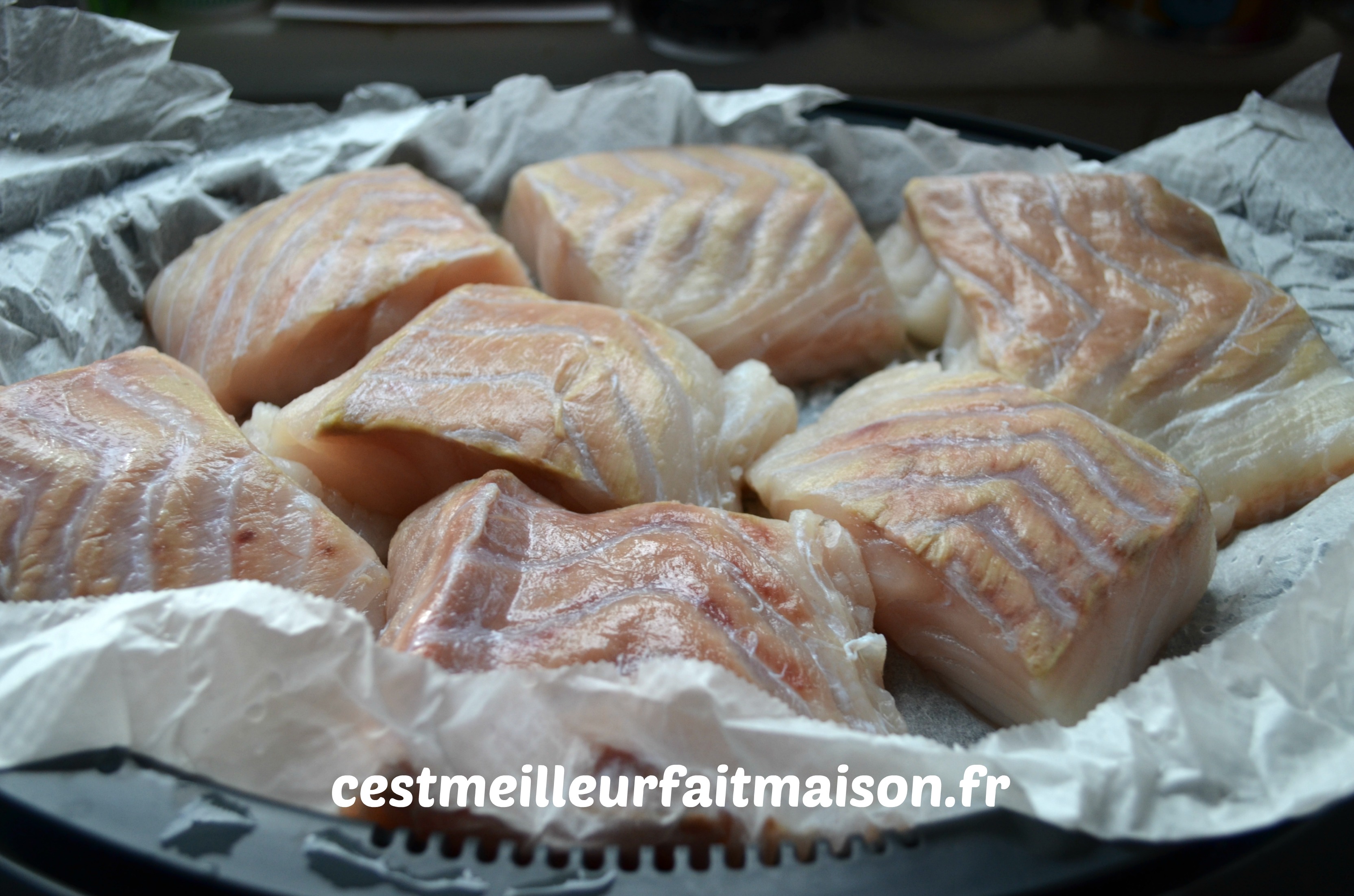 J’ai pris cette recette dans le livre “A table avec Thermomix”. J’ai simplement modifié le poisson. Ici, j’ai utilisé des filets de lieu noir alors que dans le livre, il faut des filets de truite saumonée. En fait, on utilise le poisson de son choix. Il faudra simplement adapter le temps de cuisson en fonction de l’épaisseur du poisson.