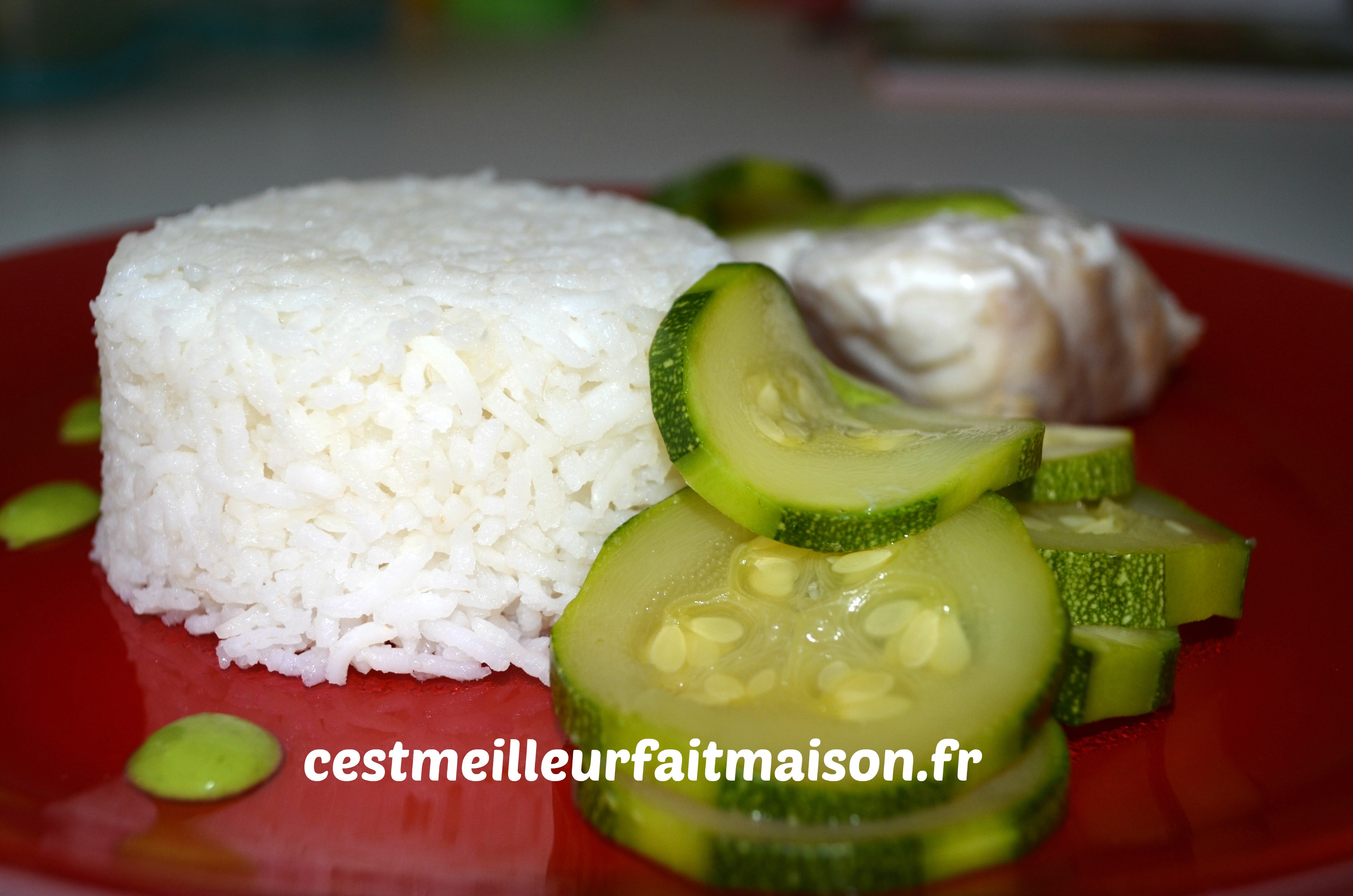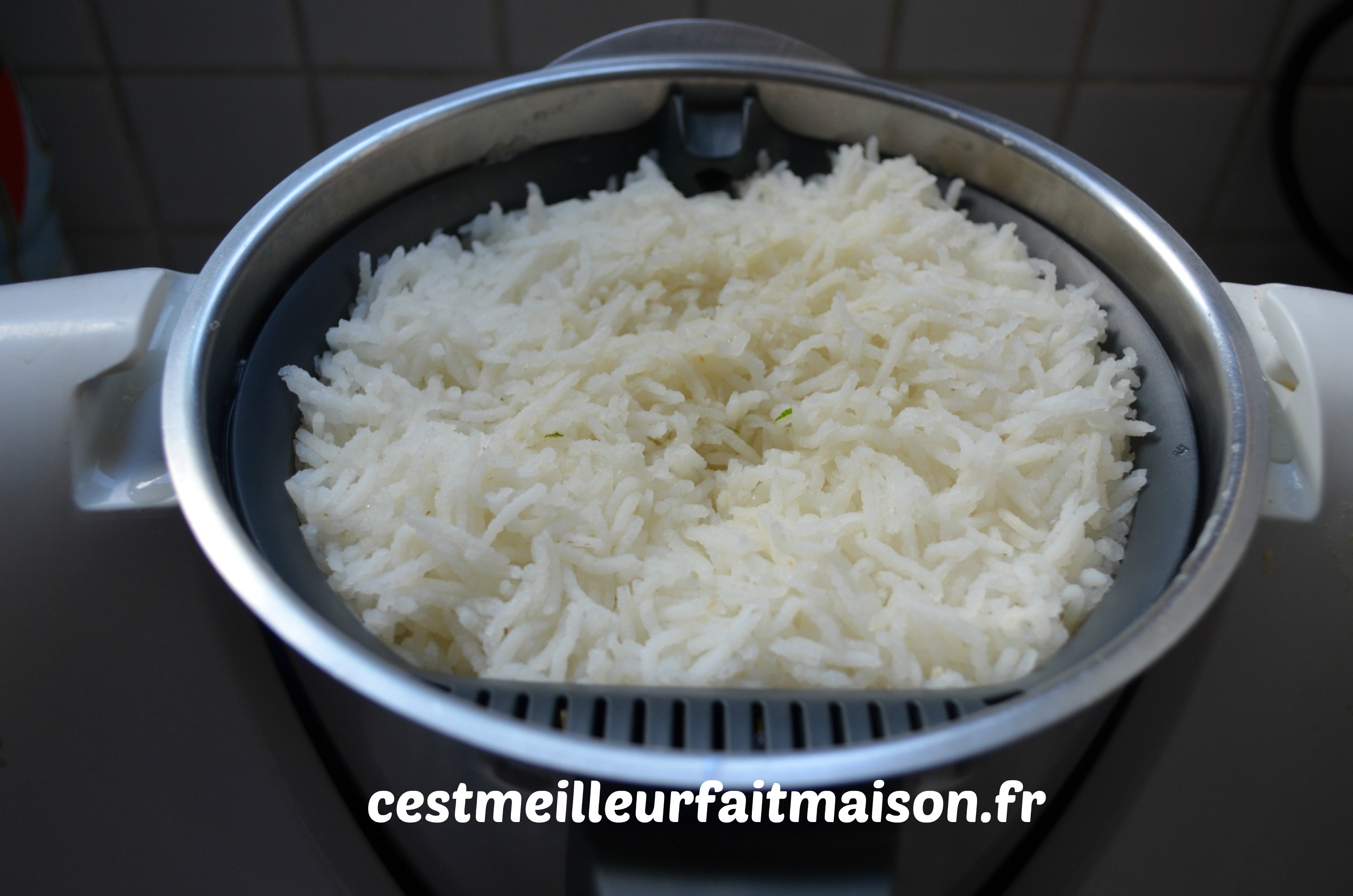 3- Verser l’eau et le gros sel dans le bol du Thermomix. Rincer le riz, le mettre dans le panier cuisson et placer le panier dans le bol. Poser le Varoma sur le bol et cuire 16 min/Varoma/Vit 1. Si au bout de ce temps le poisson n’est pas cuit, il faut retirer le panier avec le riz et poursuivre la cuisson du poisson quelques minutes de plus.