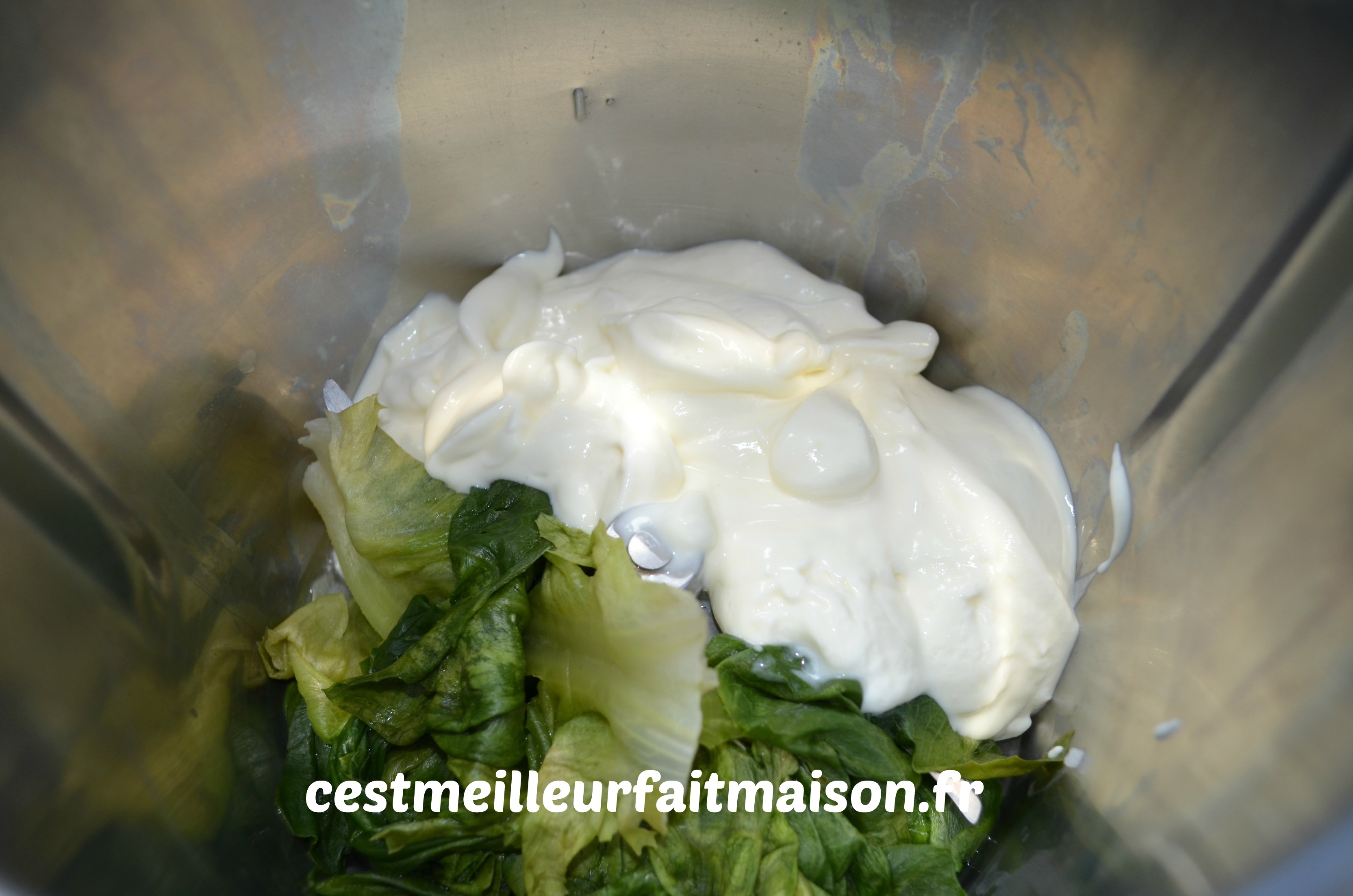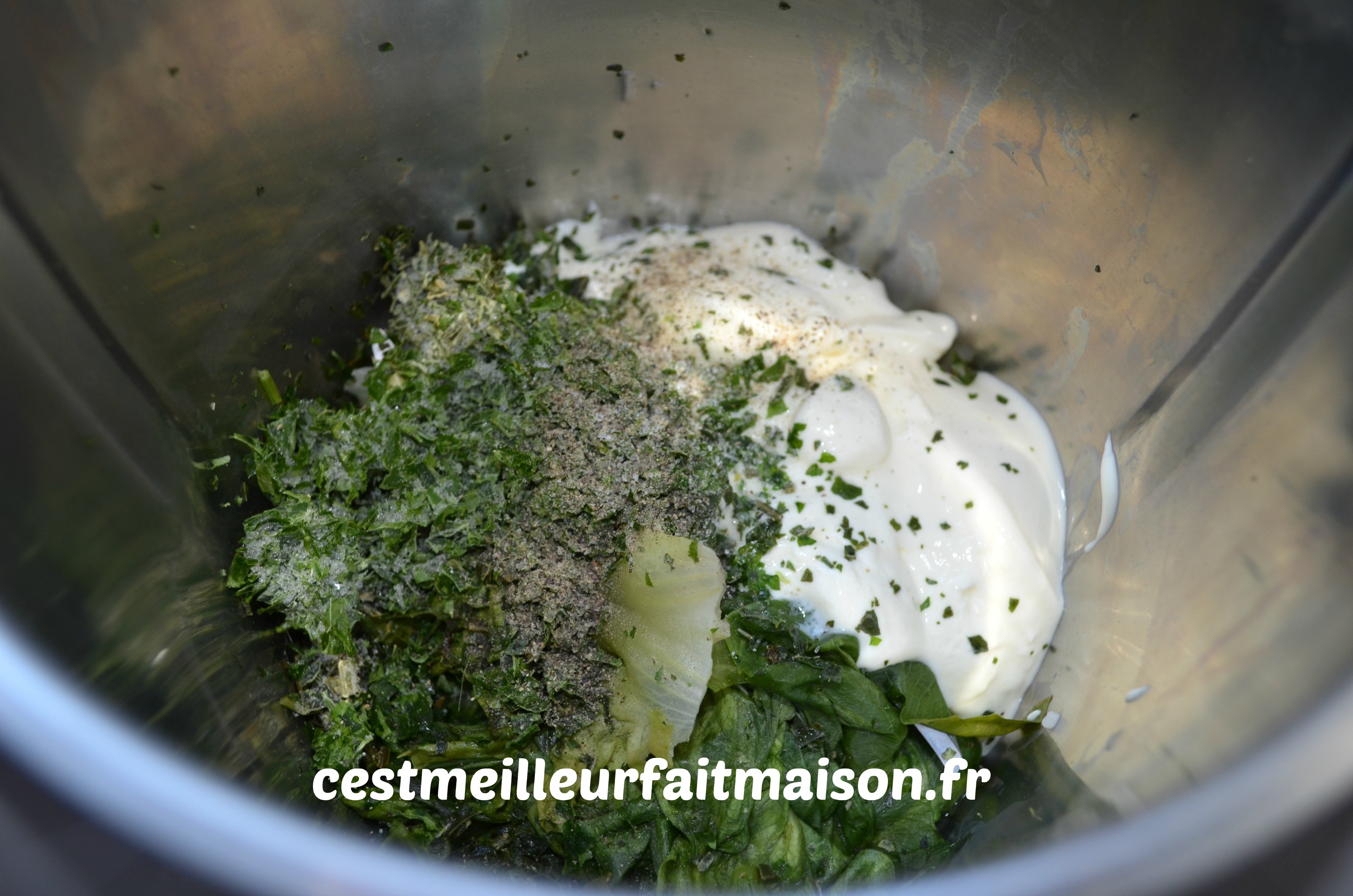 4- Réserver le poisson et les courgettes au chaud. Rincer le bol et ajouter la salade cuite, la crème fraîche, les herbes, le jus de citron, le sel et le poivre. Mixer 1 min/Vit 10 puis cuire 3 min/60°C/Vit 2.