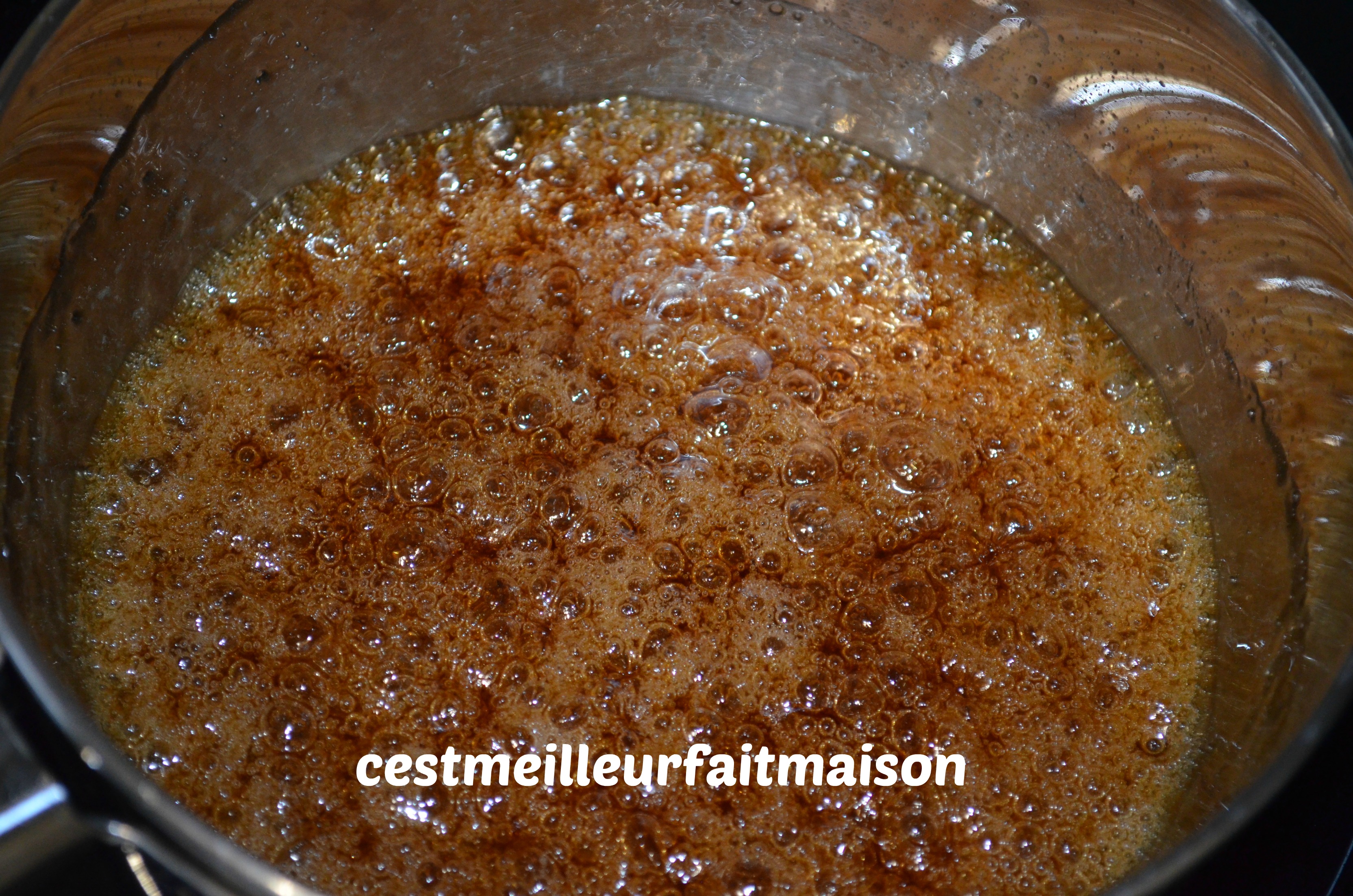 3- Quand elle commence à dorer, lancer le caramel. Mettre le sucre et l’eau dans une casserole et faire chauffer sans remuer. Le sucre va fondre et va commencer à blondir. Lorsqu’il atteint la bonne couleur (un peu plus foncé que la 3ème photo), ajouter 1 cs de sauce soja pour stopper la cuisson et éviter que le caramel durcisse.