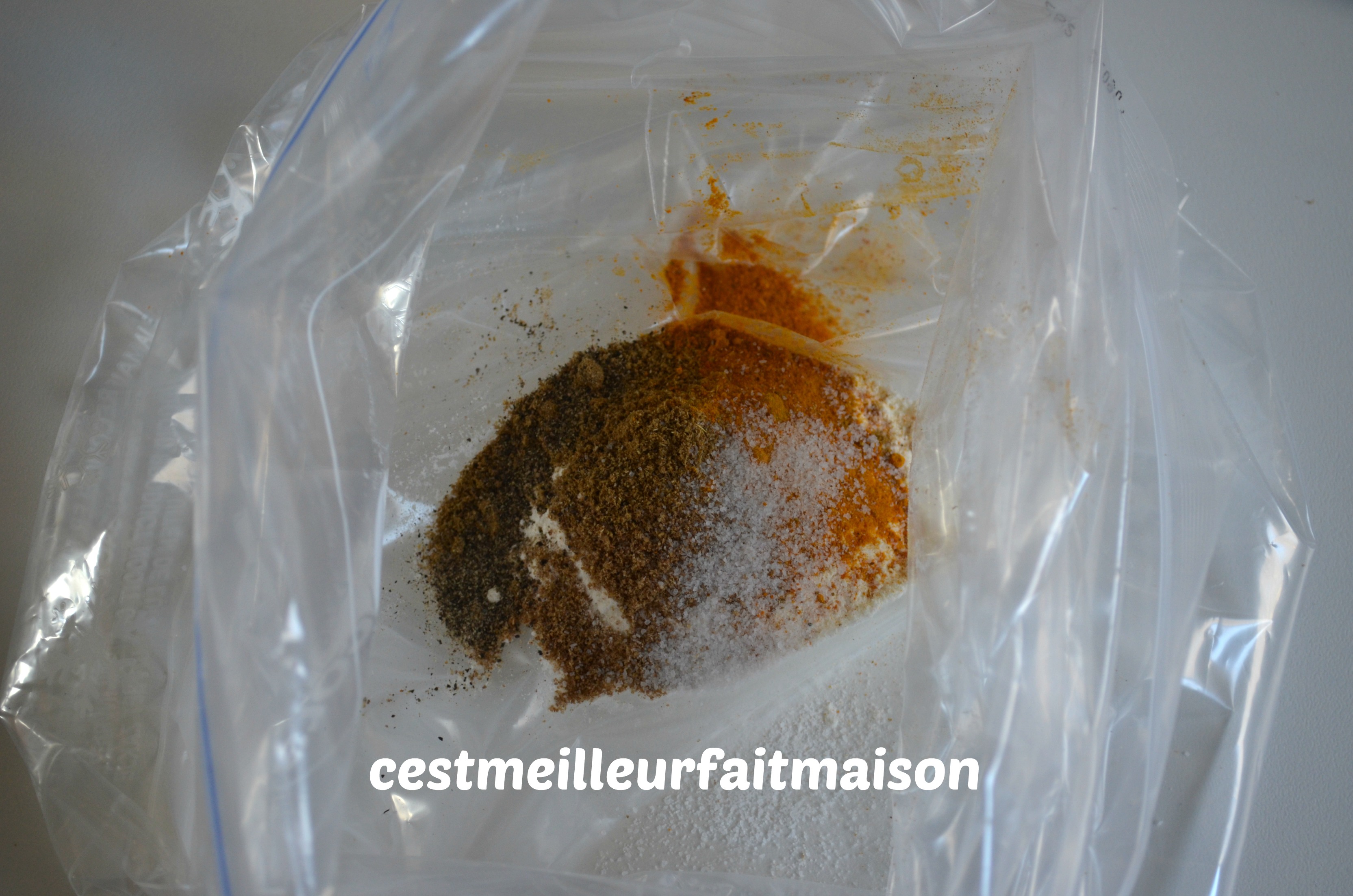 2- Dans un grand sac à congélation, mettre la farine, le cumin, la coriandre en poudre, le curcuma et le poivre. Ajouter le poulet, l’huile d’olive et bien mélanger en secouant le sac. On peut très bien faire aussi dans un saladier et mélanger avec les mains.