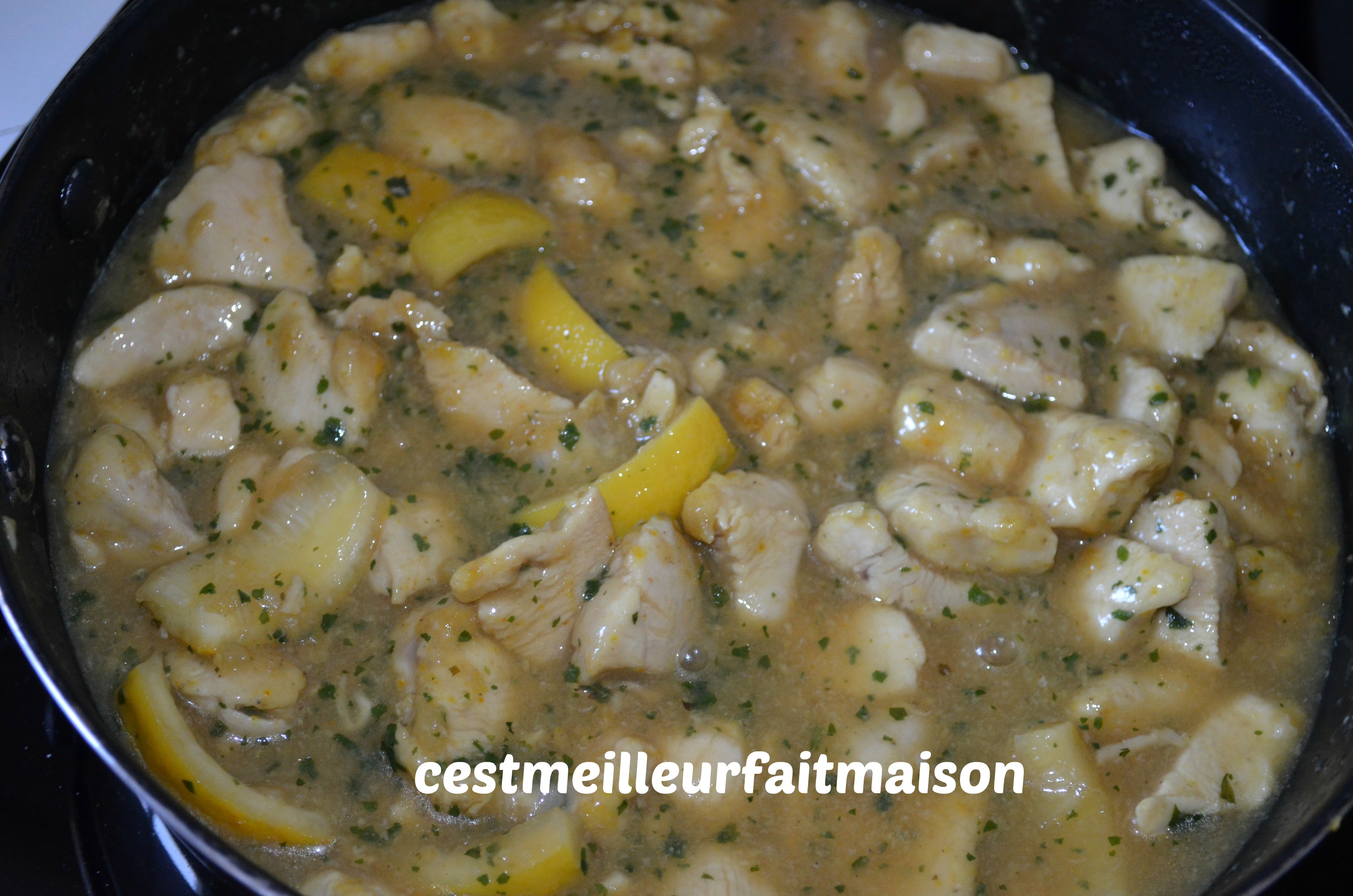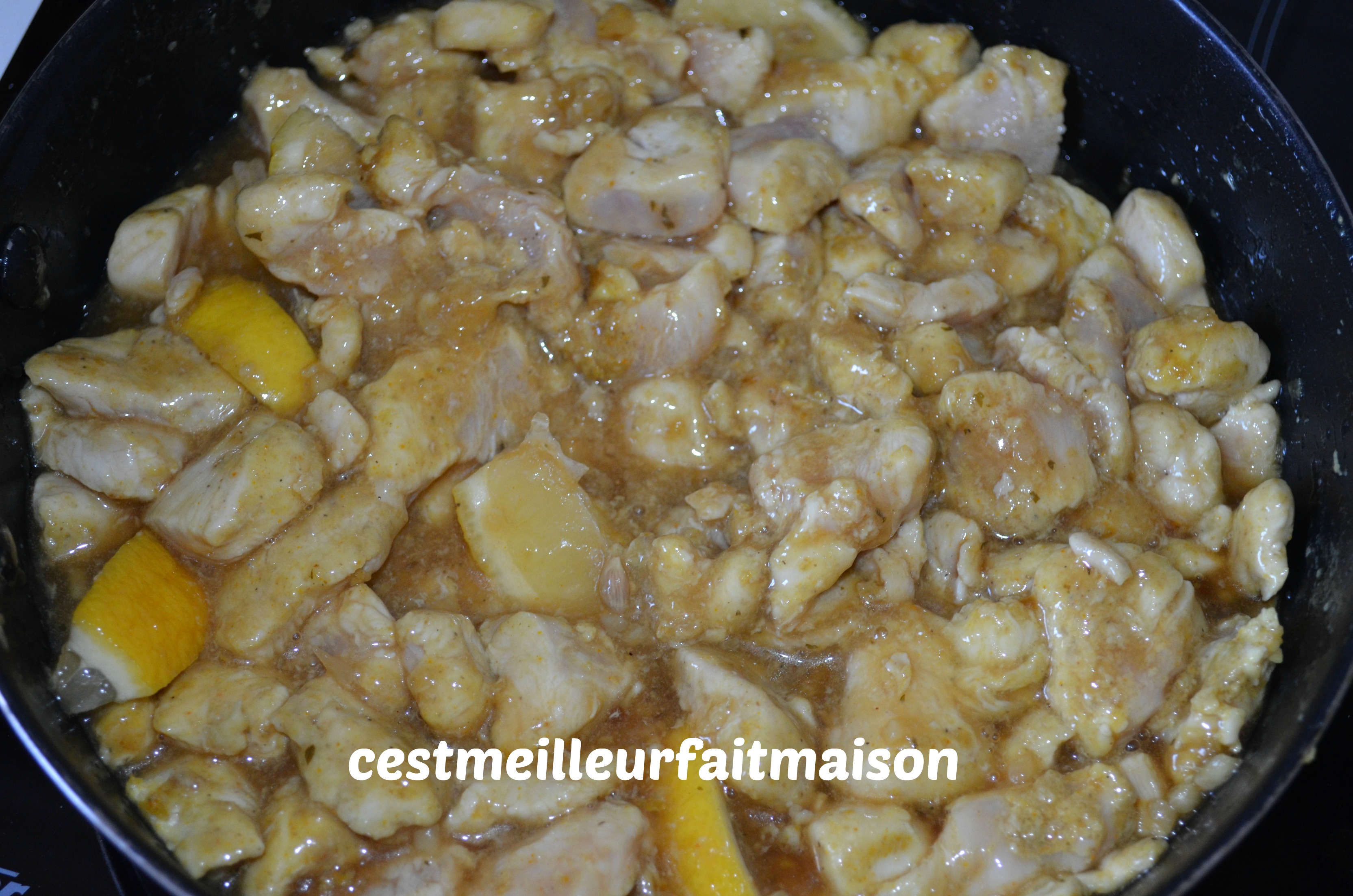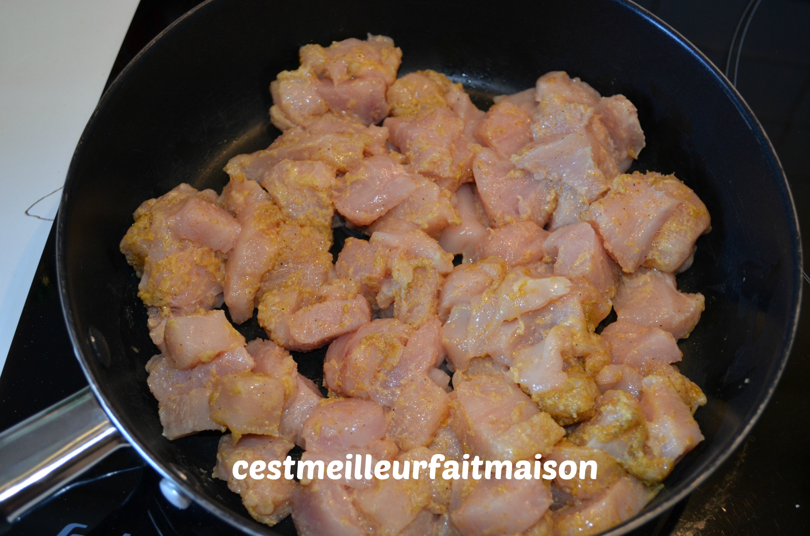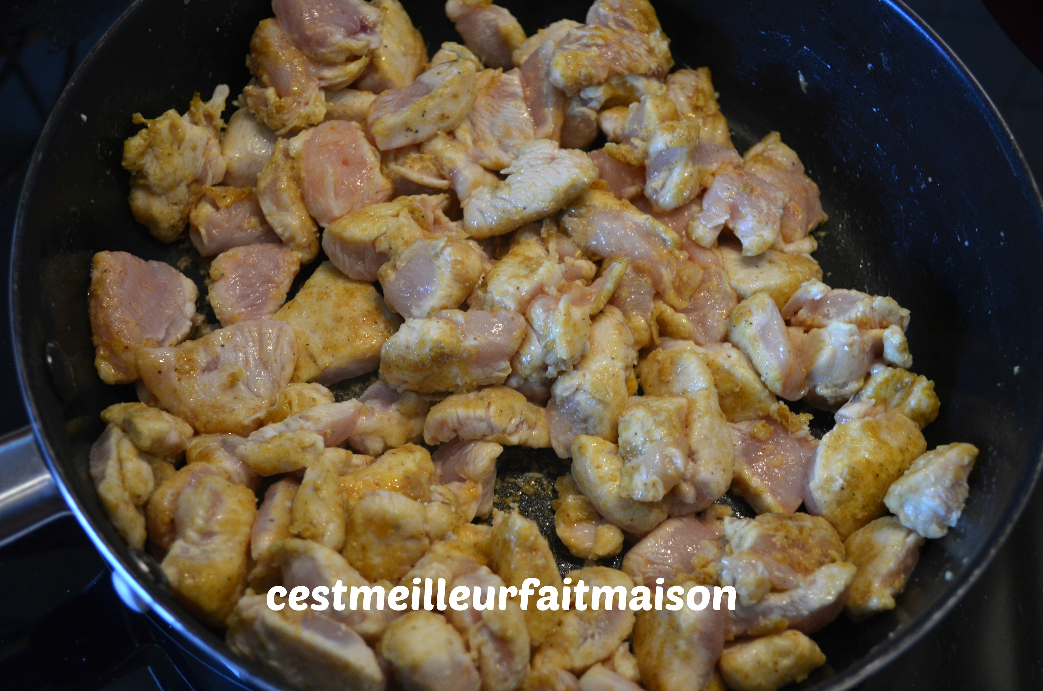 3- Faire chauffer une sauteuse ou un wok et y dorer les morceaux de poulet quelques minutes. Réserver dans un autre contenant.