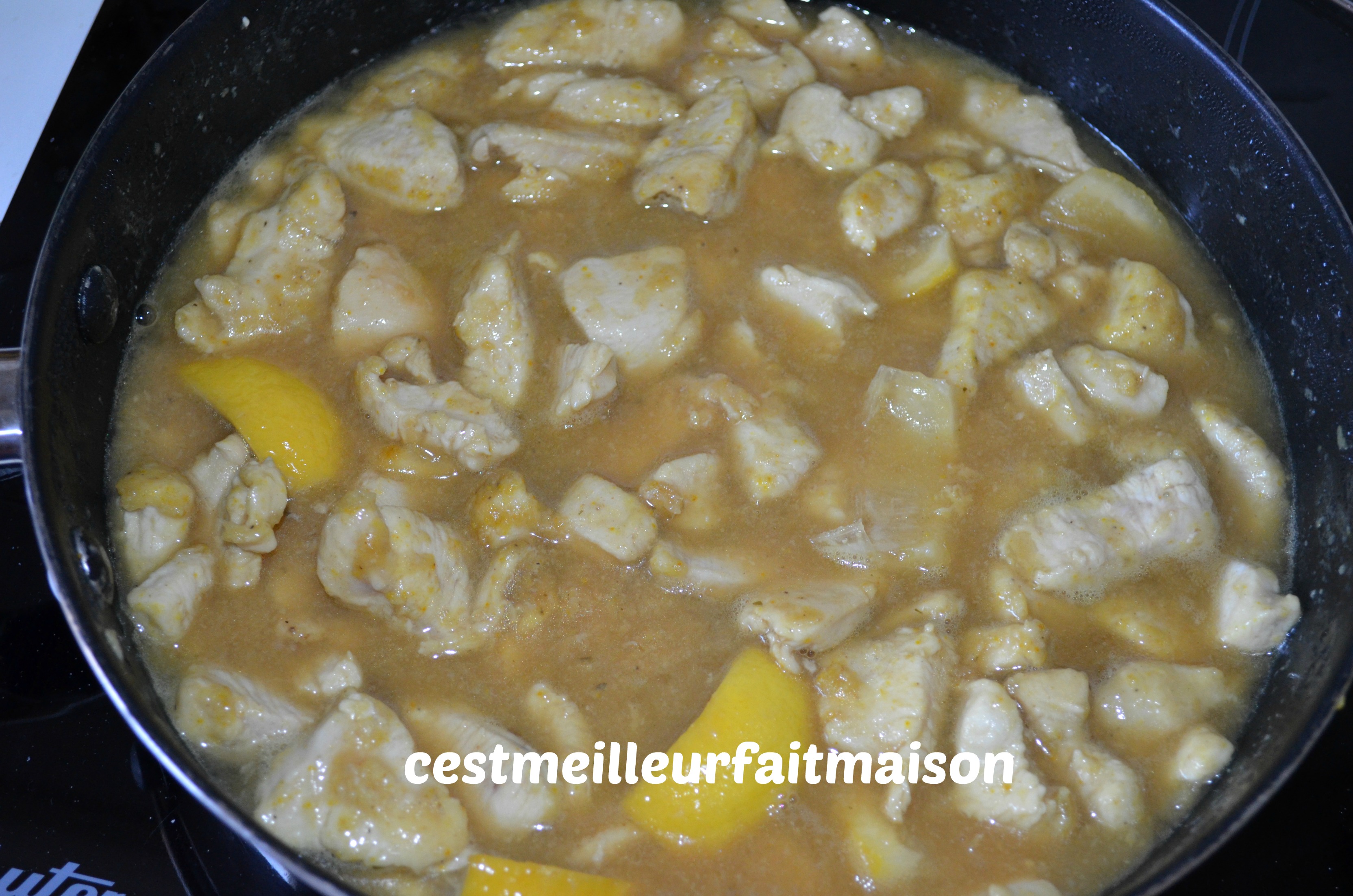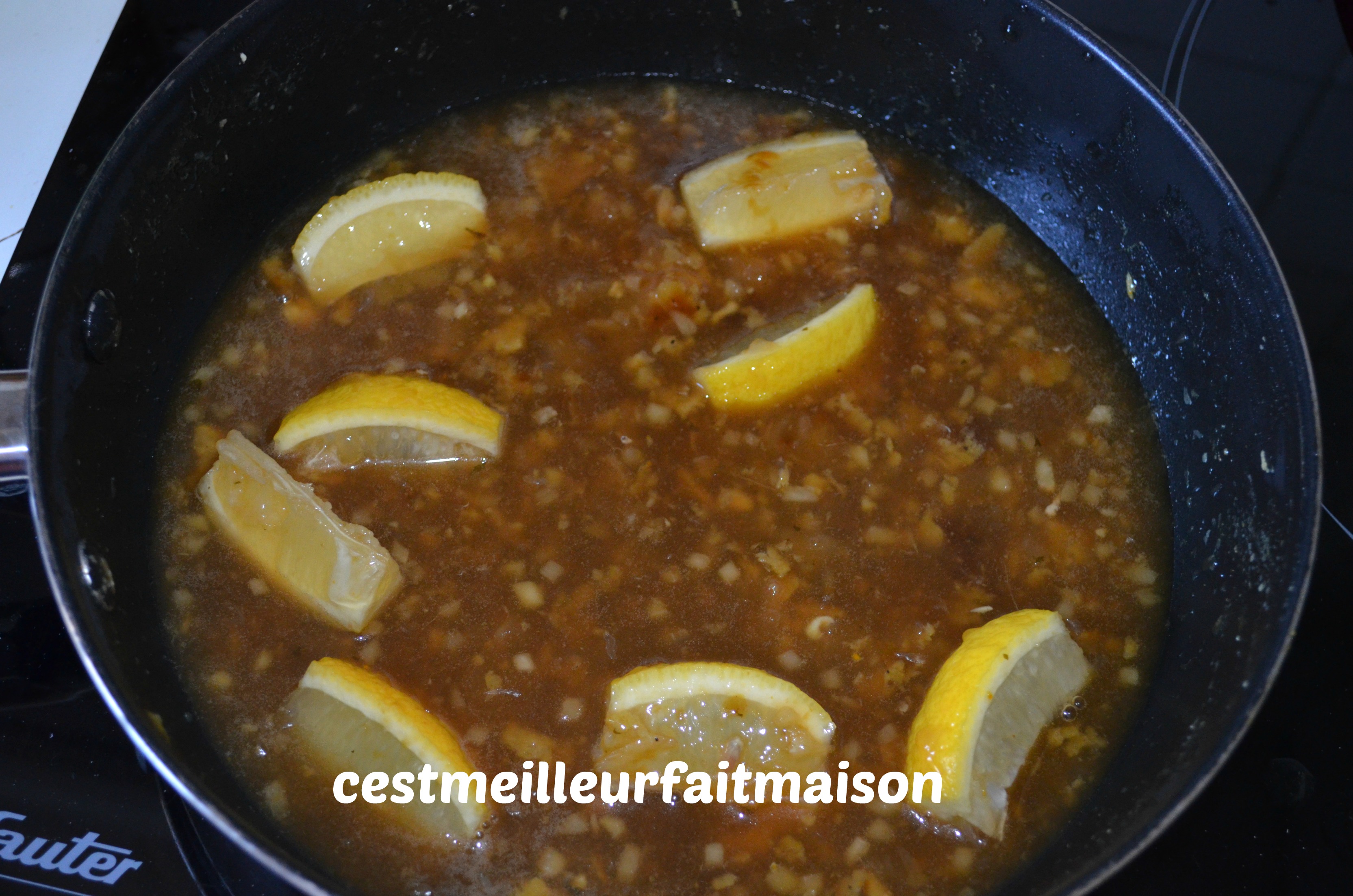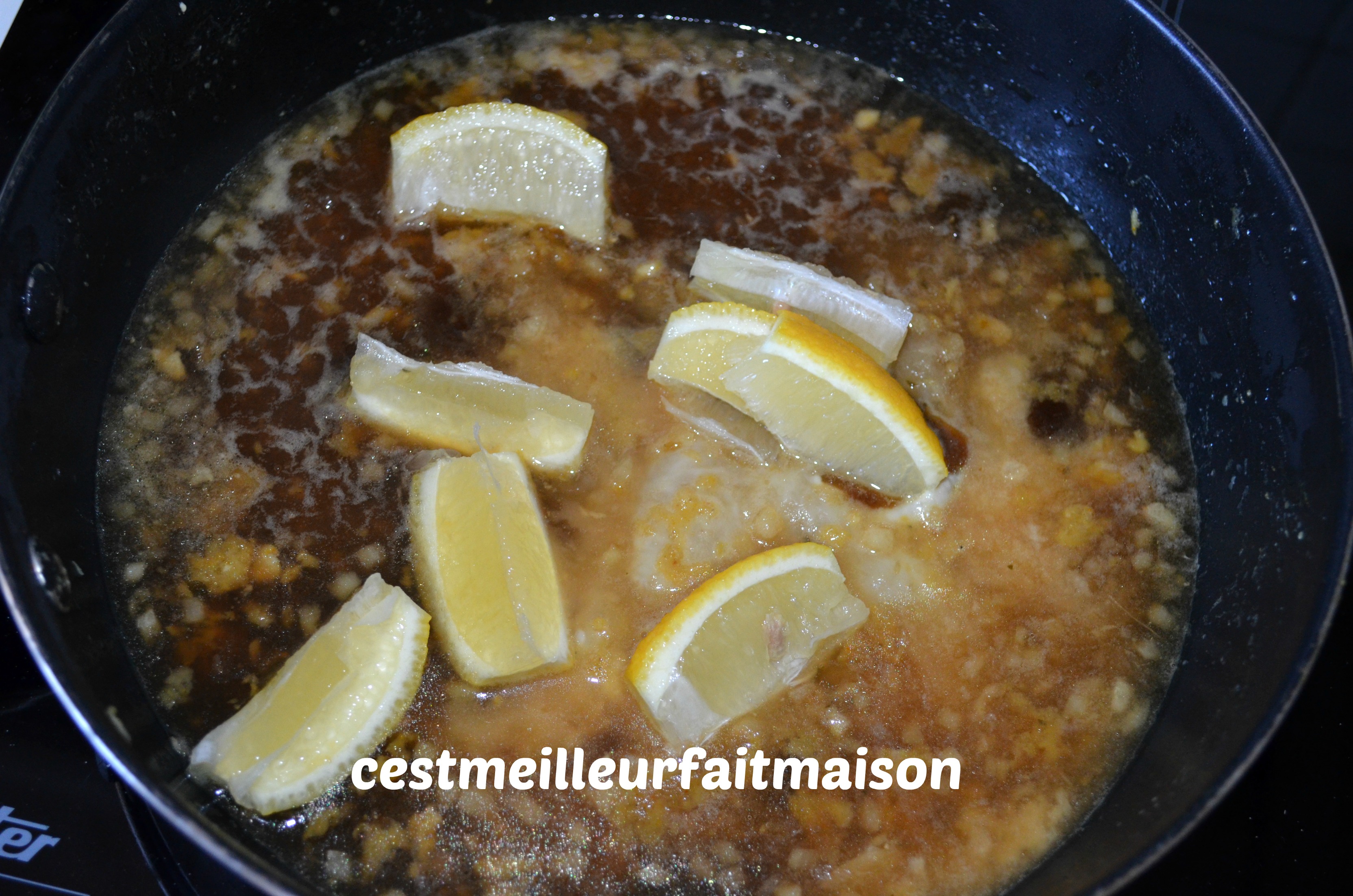 4- Dans la sauteuse ou le wok, sur feu doux, ajouter le gingembre, le jus de citron, le miel, la sauce soja et l’eau. laisser quelques minutes sur le feu et ajouter les quartiers de citron ainsi que la Maïzéna diluée dans 3 cs d’eau. Mélanger et laisser cuire jusqu’à ce que la sauce épaississe un peu.