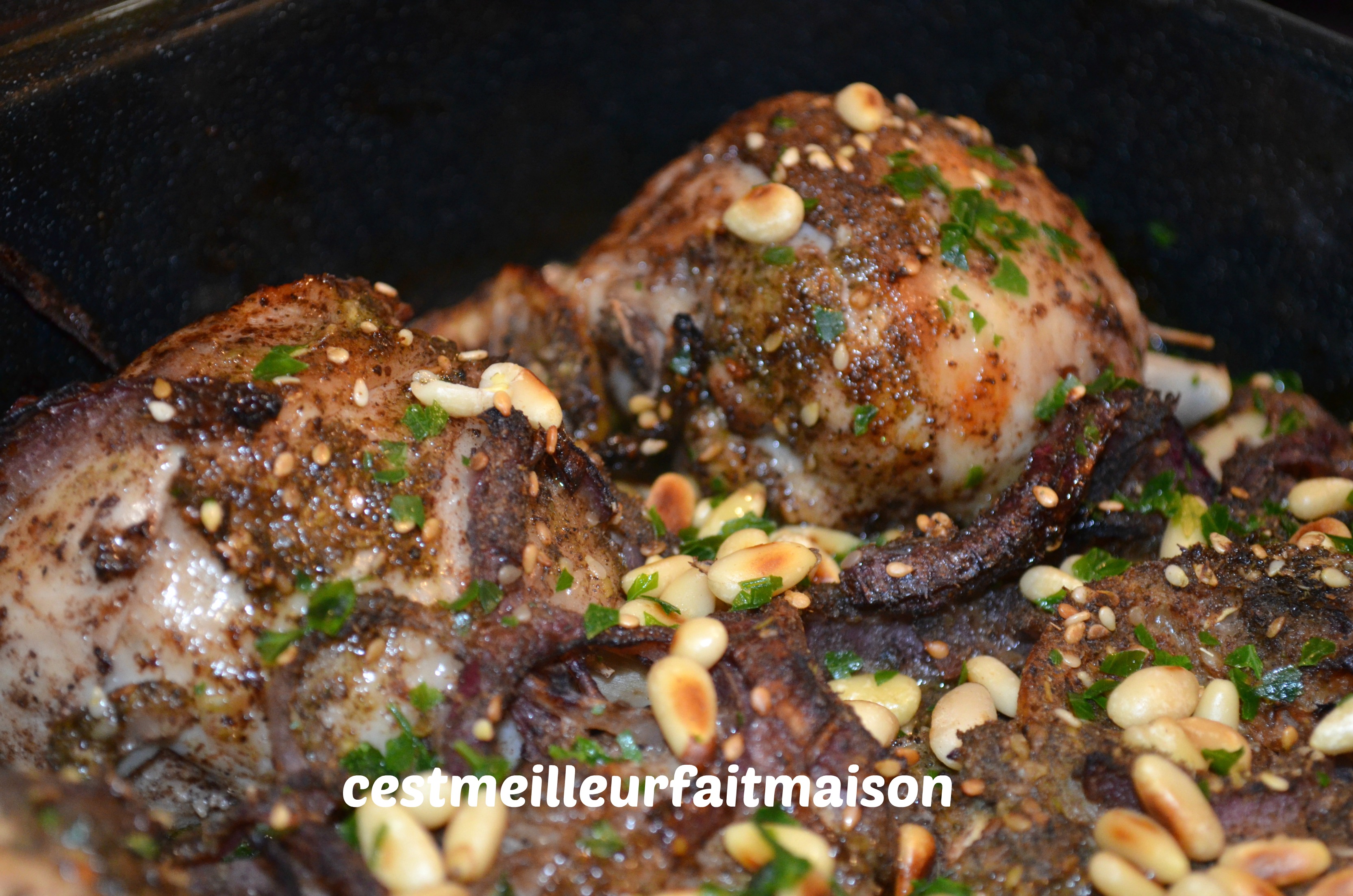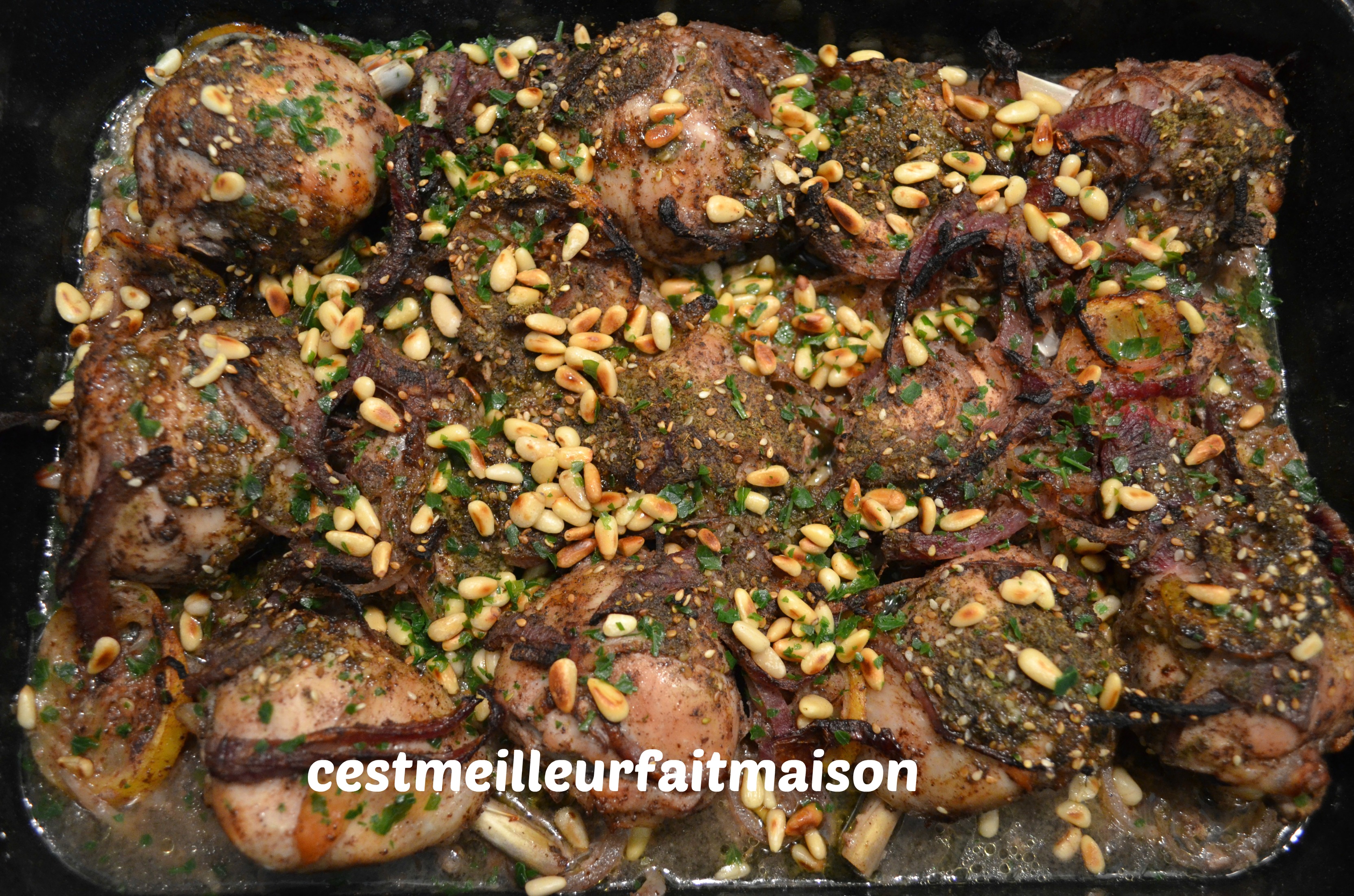 2- Préchauffer le four à 200°C. Mettre le poulet et la marinade dans un plat allant au four. Placer le poulet côté peau vers le haut. Parsemez de zaatar et enfourner pour 30 à 40 min.