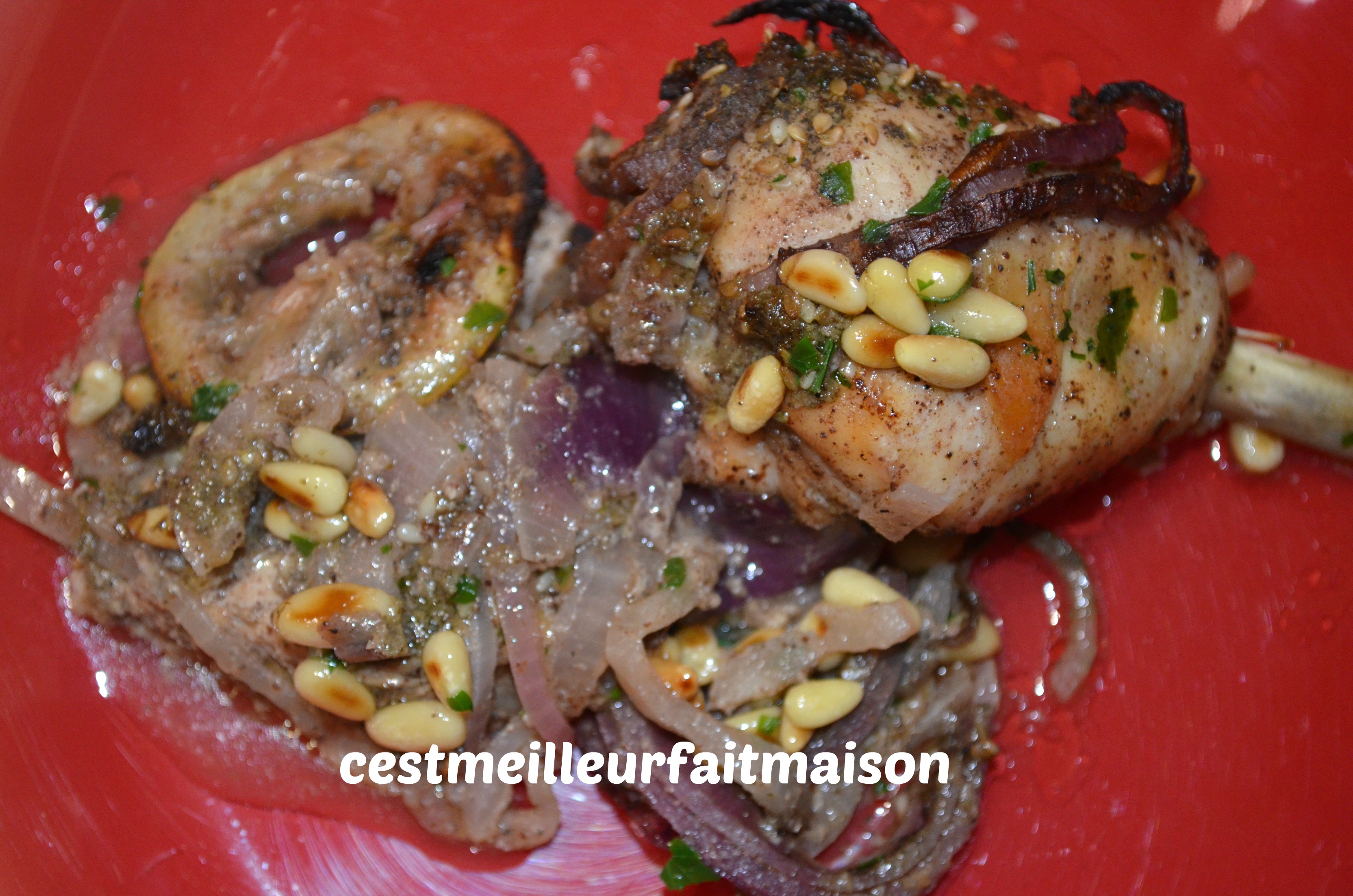 4- A la fin de la cuisson, ajouter les pignons de pin et parsemer de persil. Servir à l’assiette ou dans des pitas après avoir désossée le poulet.
