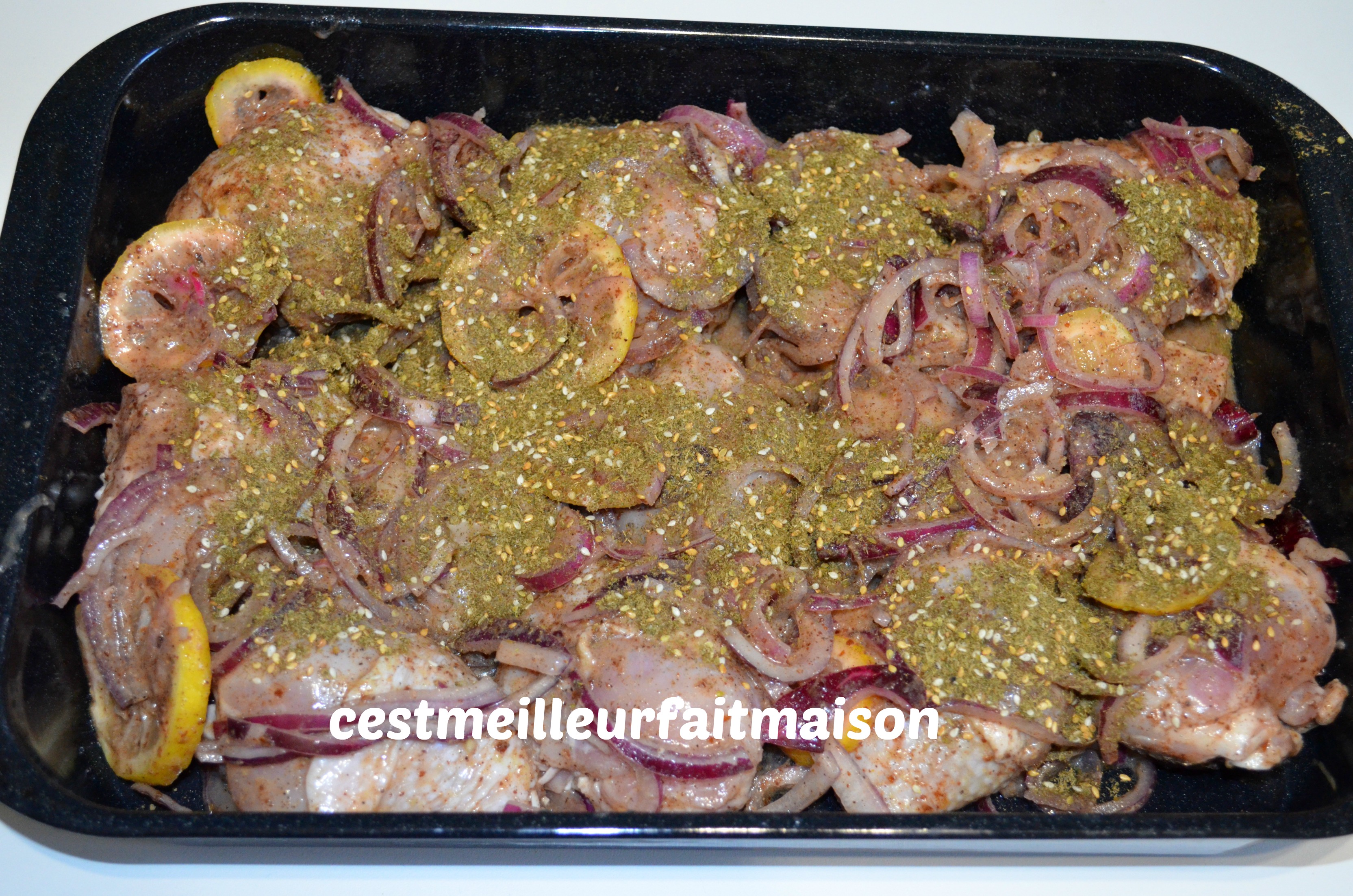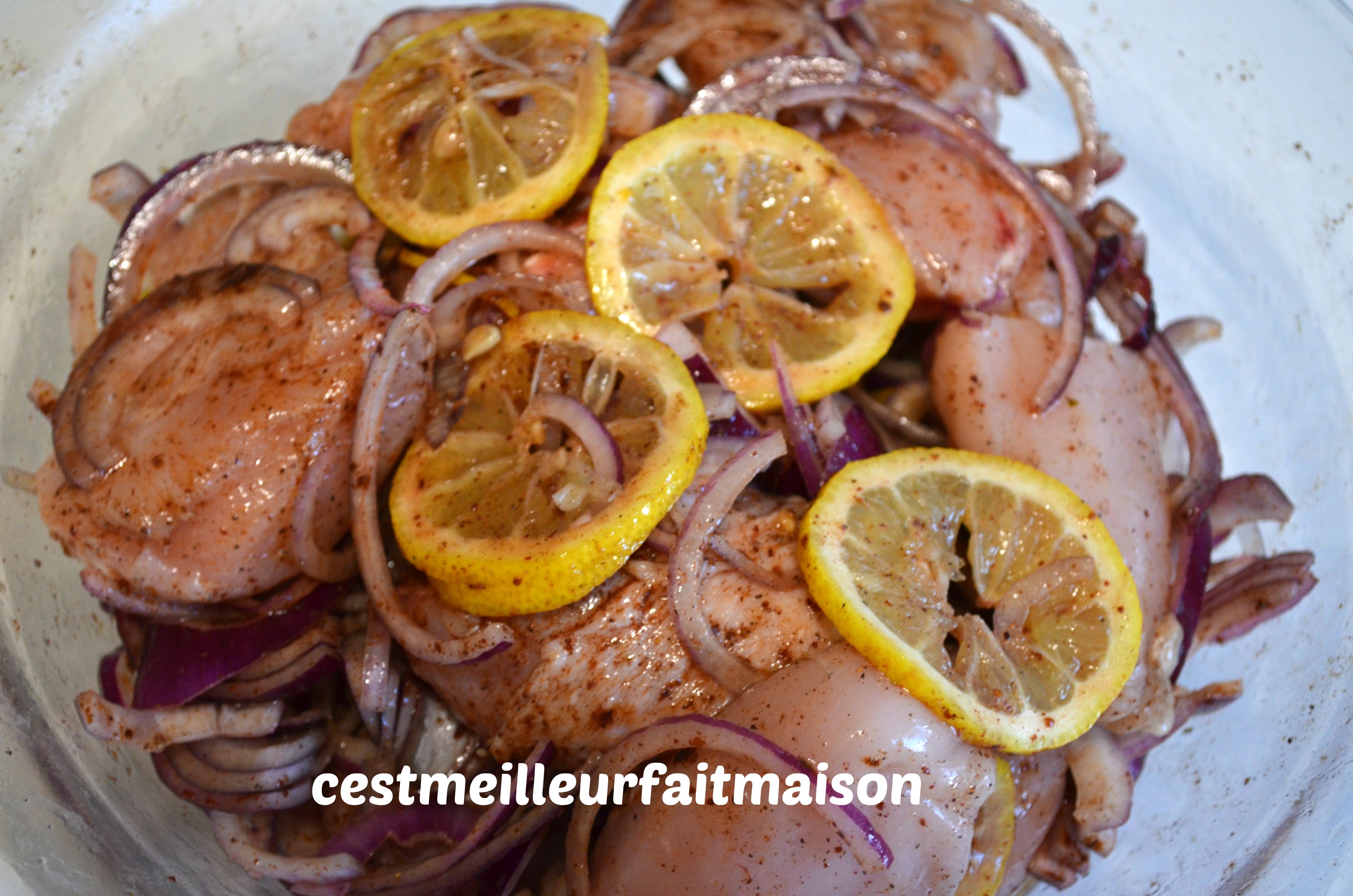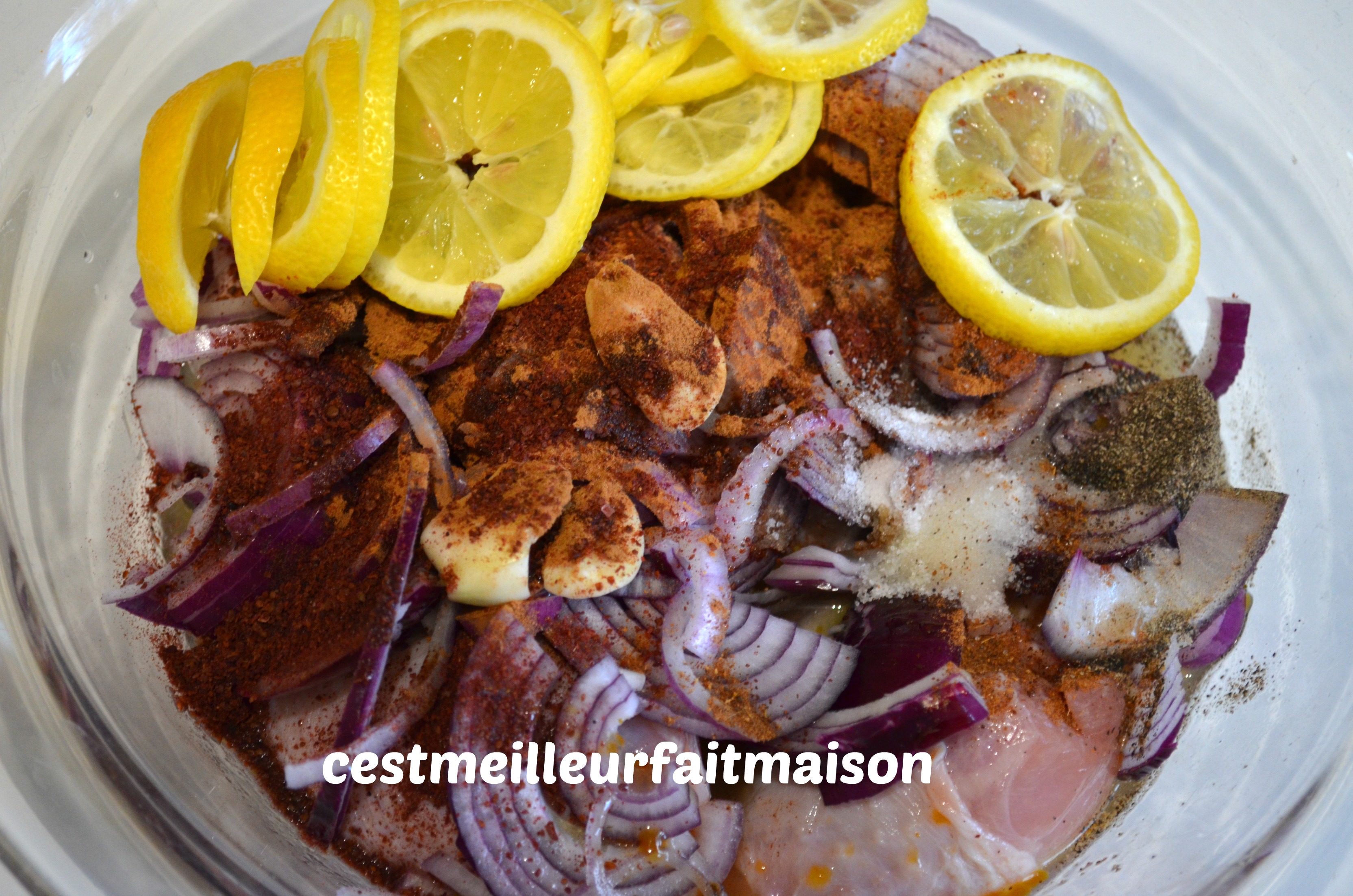 1- Dans un grand saladier, mélanger le poulet avec les oignons, l’ail, l’huile d’olive, les épices, le citron, le bouillon, le sel et poivre. Laisser mariner toute la nuit au réfrigérateur.