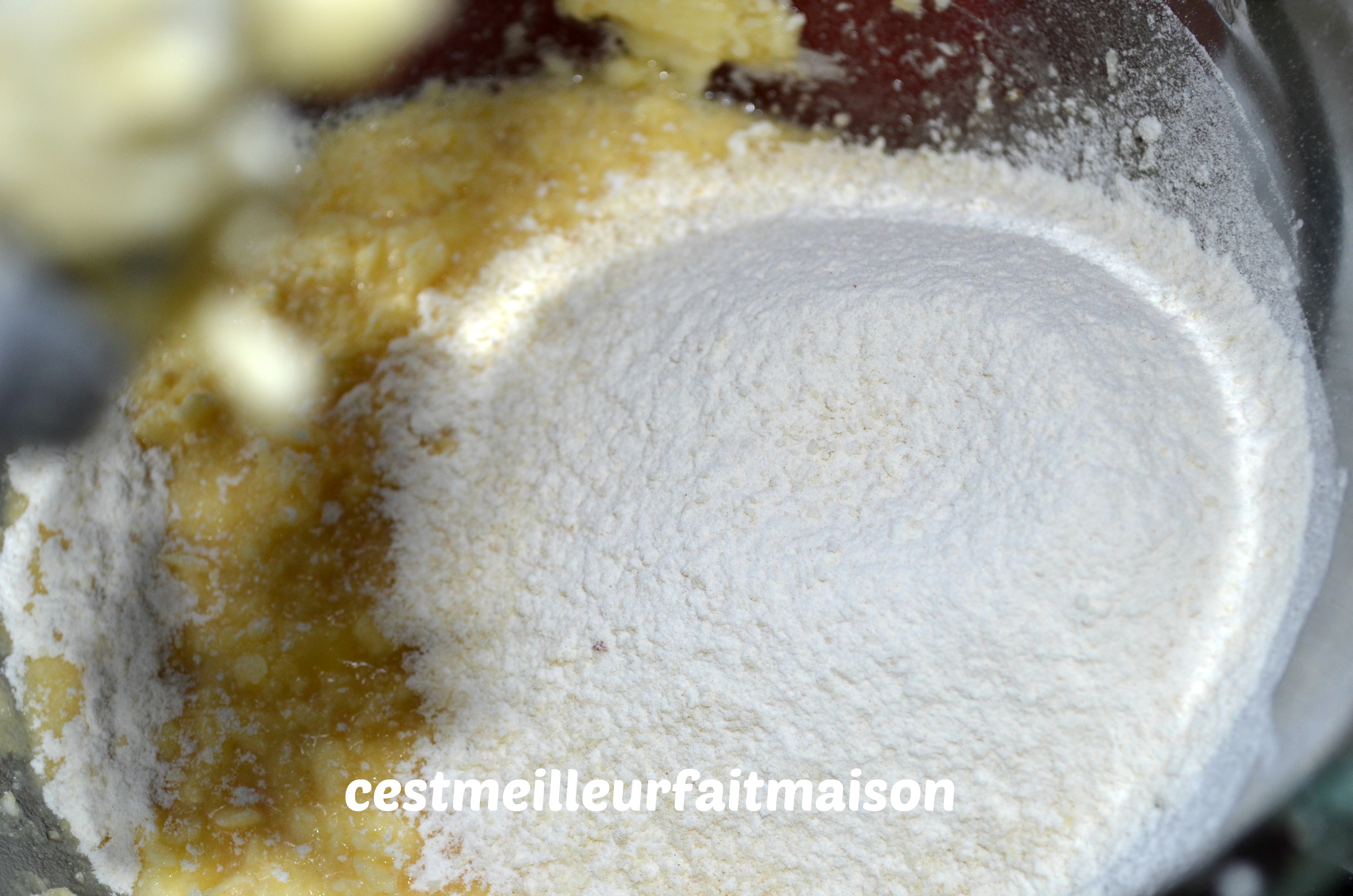 4- Ajouter la farine tamisée et la levure. Bien mélanger.