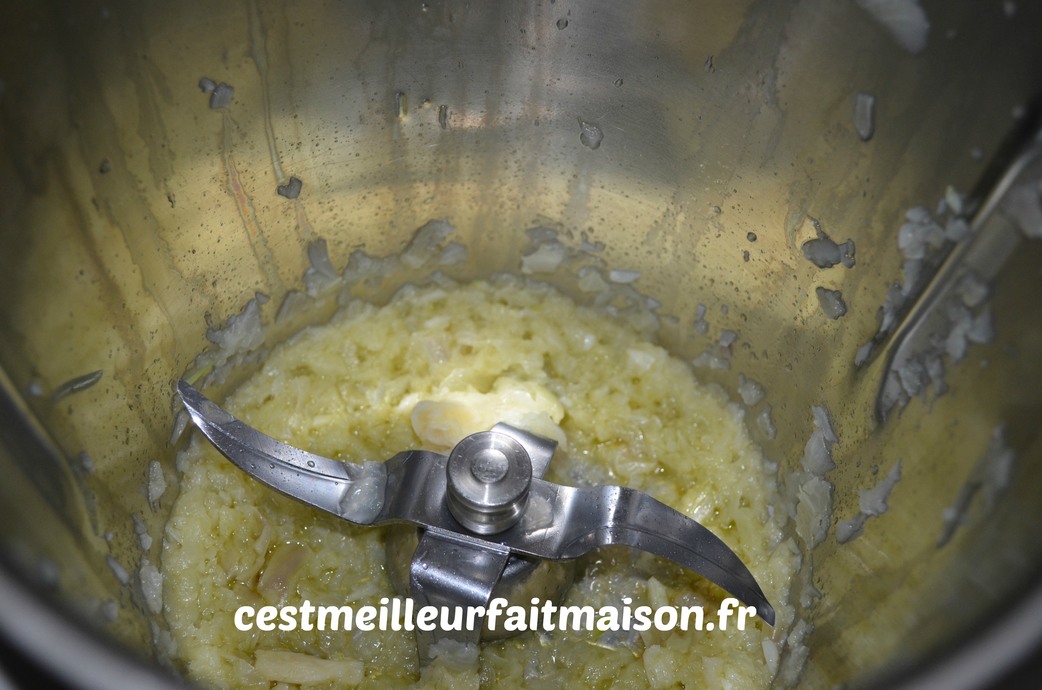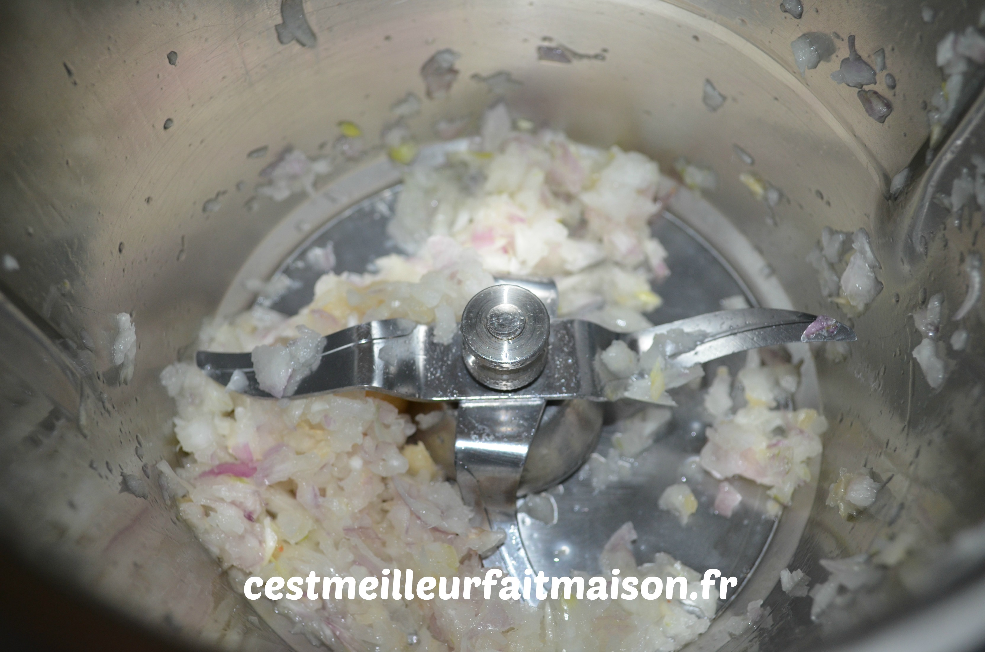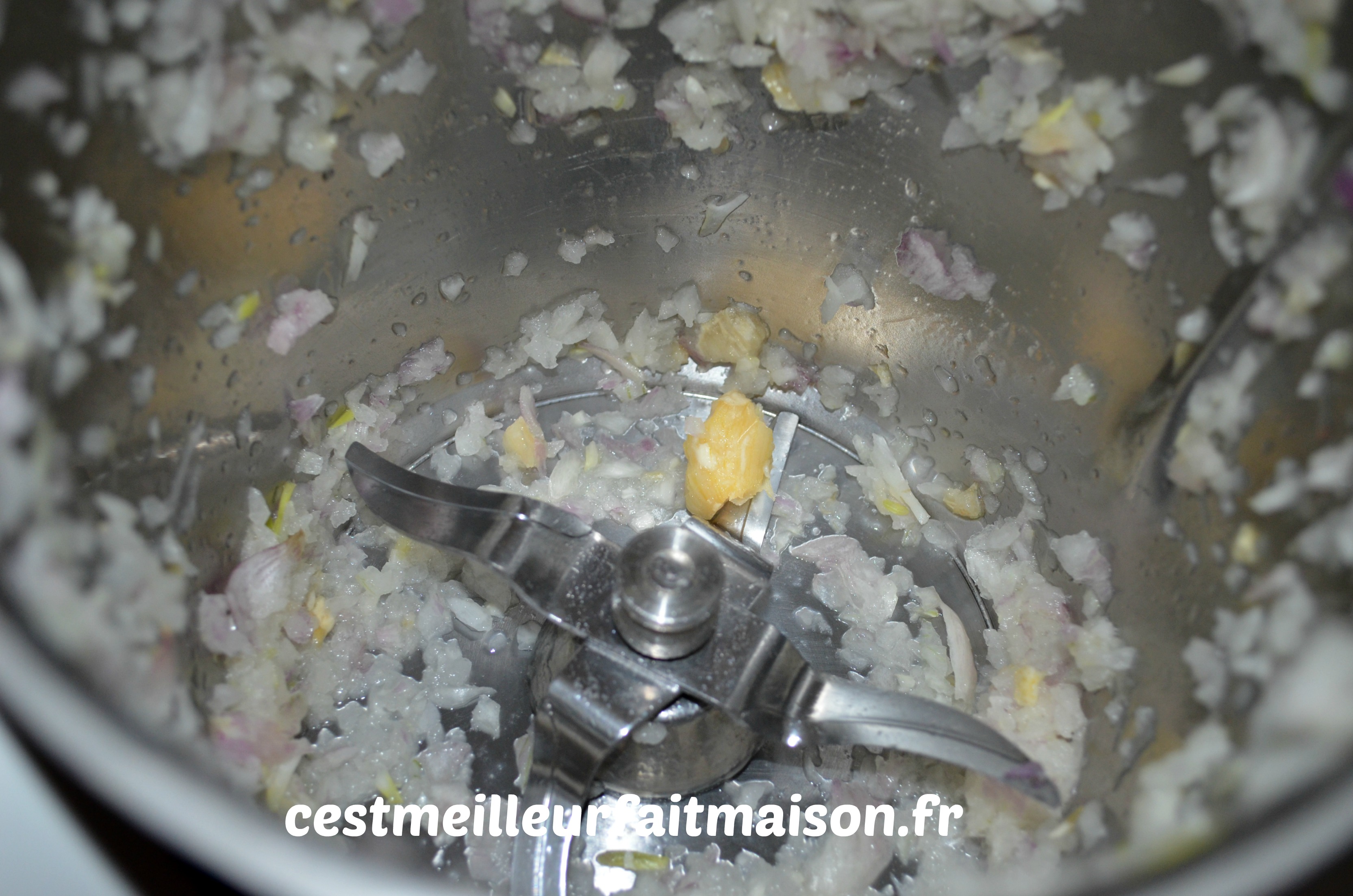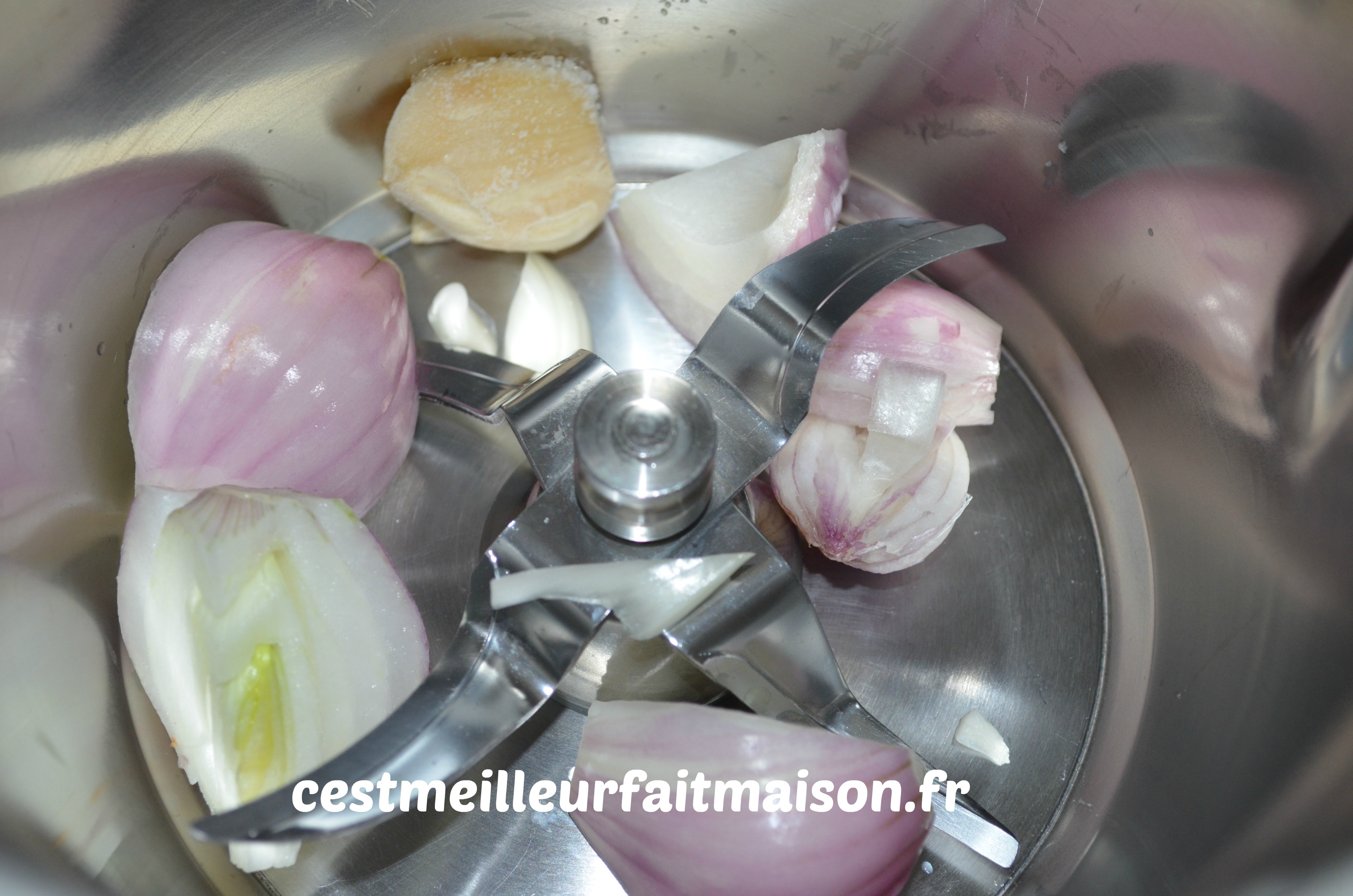 1- Mettre dans le bol du Thermomix l’oignon coupé en deux, l’échalote et l’ail. Mixer 5 sec/Vit 5. Racler les parois du bol avec la spatule.