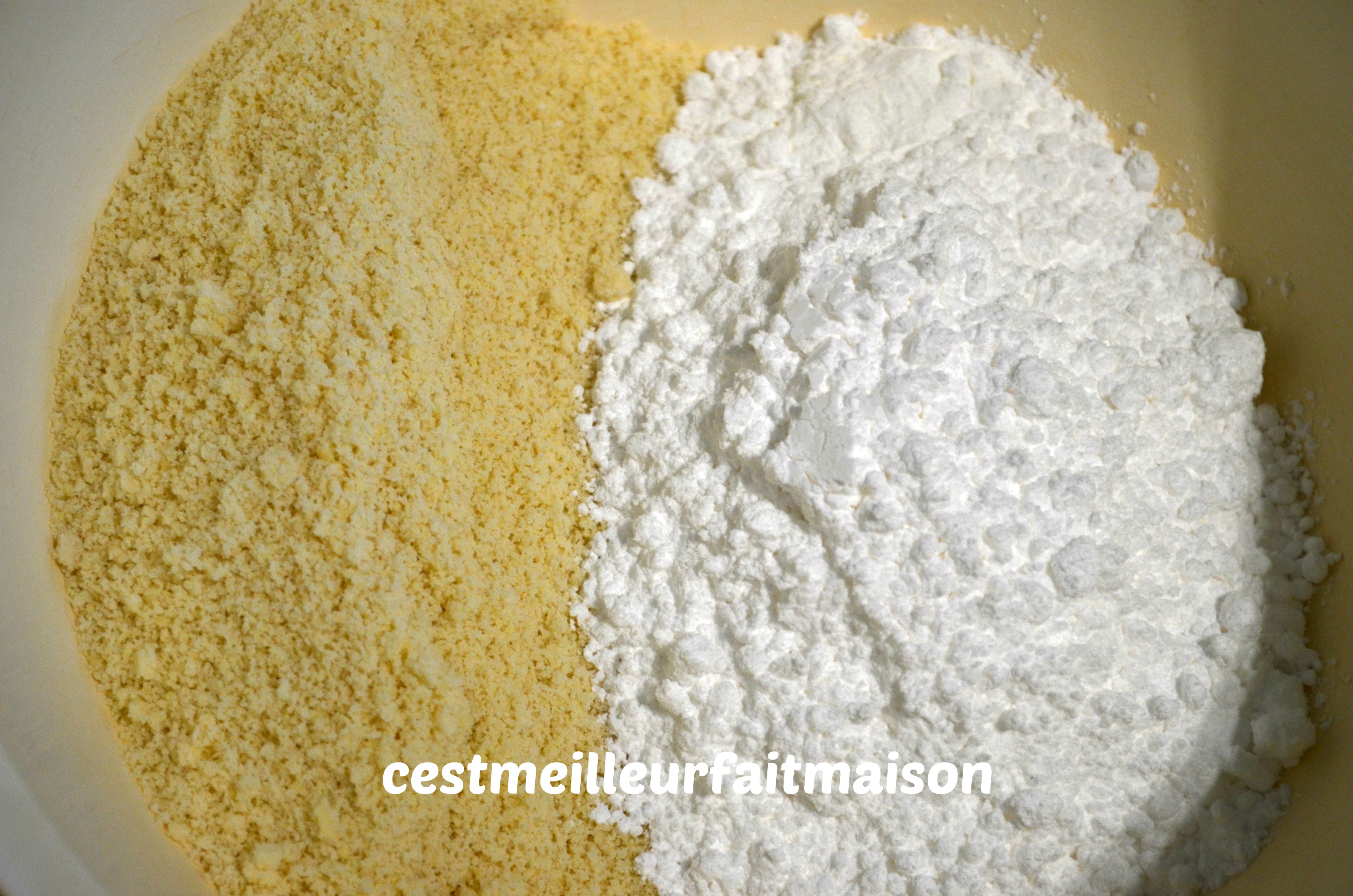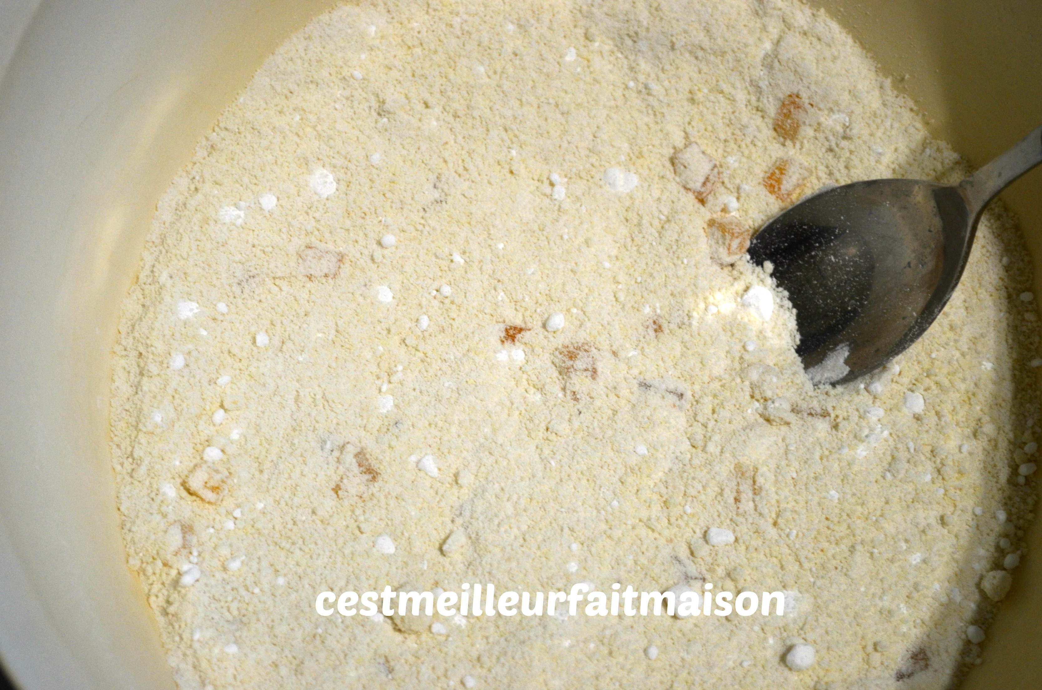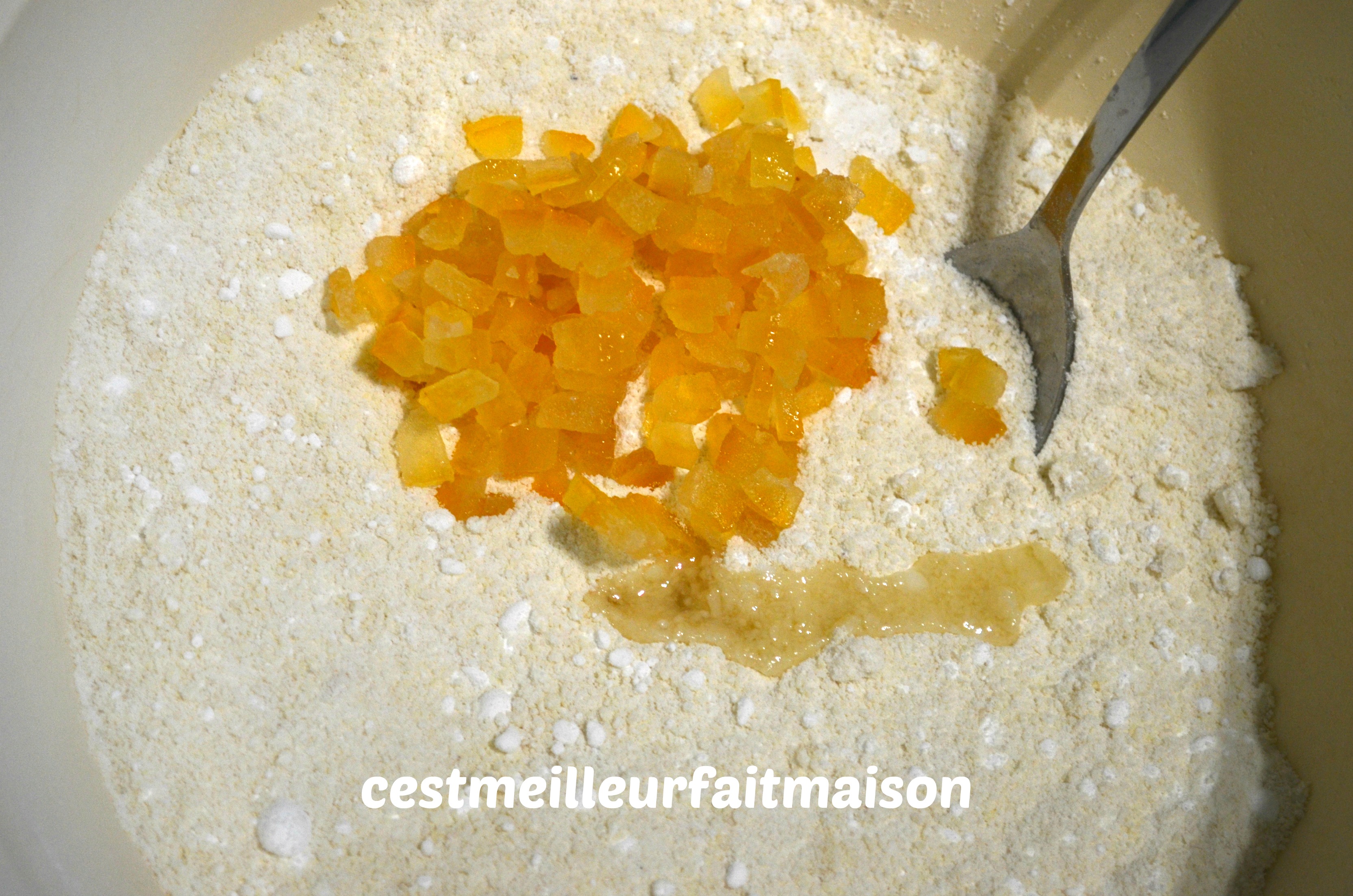 2- Dans un saladier, mélanger le sucre glace, la poudre d’amande, la levure, l’extrait d’amande amère et les oranges confites.